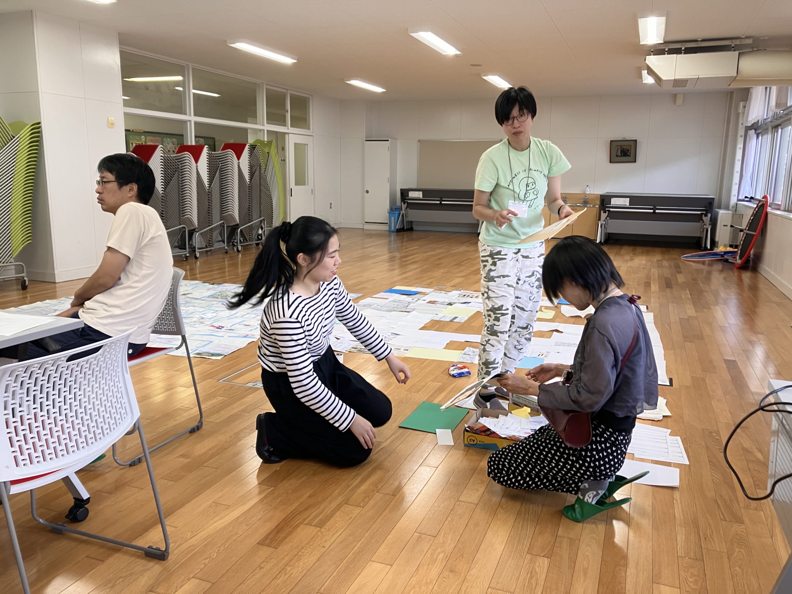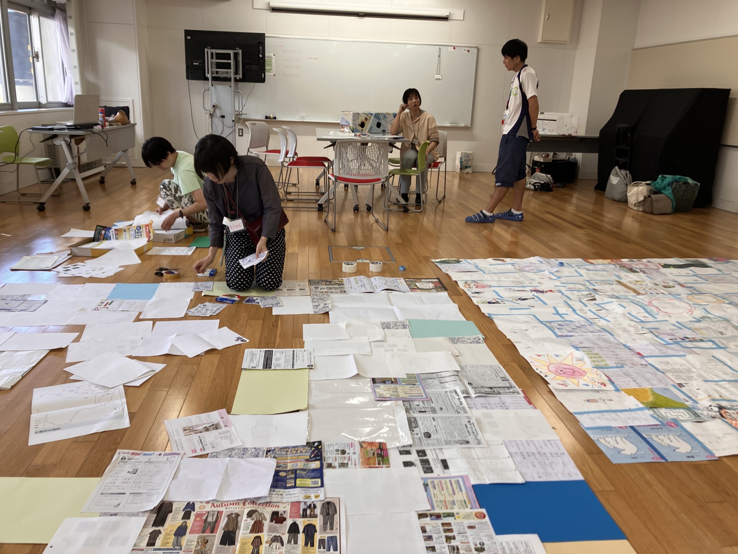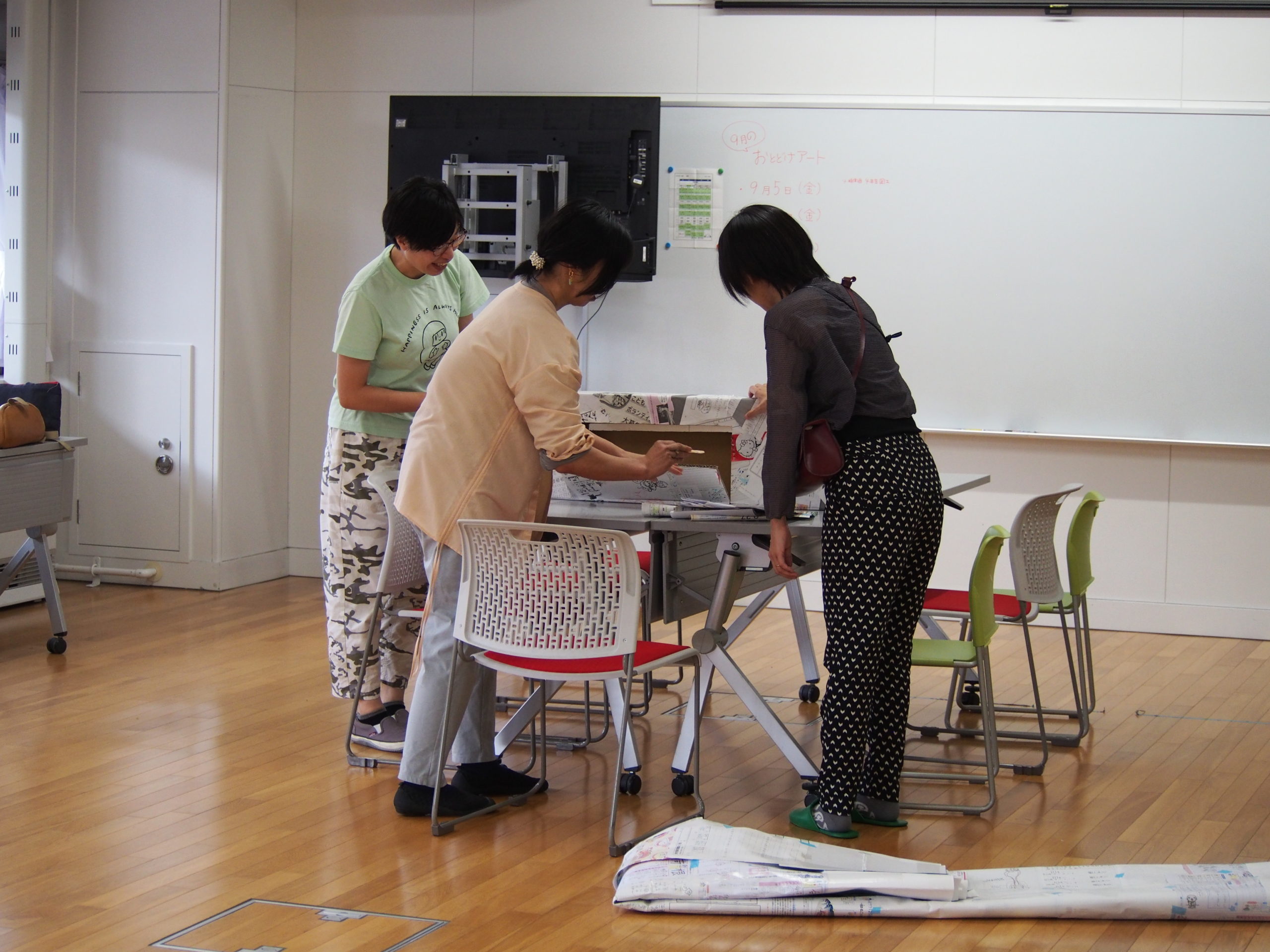 あきちゃん、羊さん、そしてレギュラーの初沢ひかりさんの到着で二枚目の紙のパッチワークがどんどん大きくなって行く。隣では、本日のスペシャルゲストとして見学にいらっしゃるご予定の、2011年の小助川裕康さんがおとどけアートに行かれた稲積小学校の校長先生…池田悦子先生を待ちながら、コーディネーター小林氏、あっちは作戦会議。