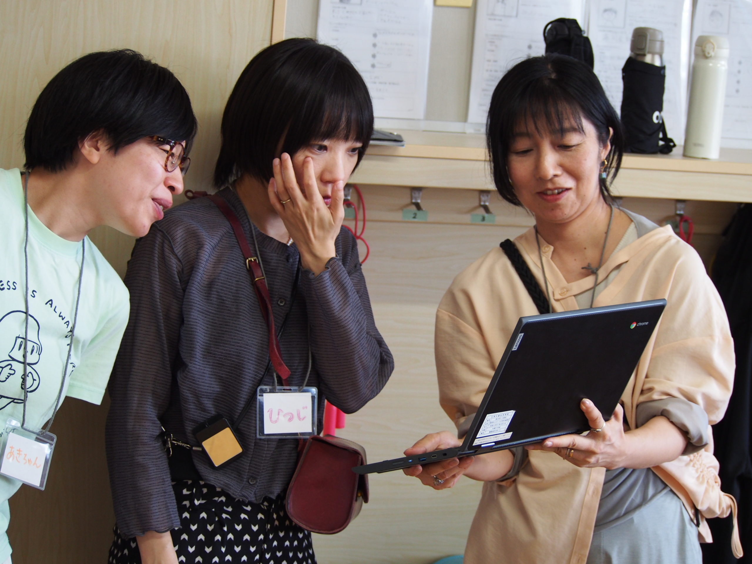 昼ごはんを食べ終わる頃に、五年生のクラスからクロムブックで作った作品を見せてもらえることになり、急遽みんなで教室へ。昼休みが無いので、掃除時間を挟んですぐ午後の授業が始まる前に、見せてもらわないと。