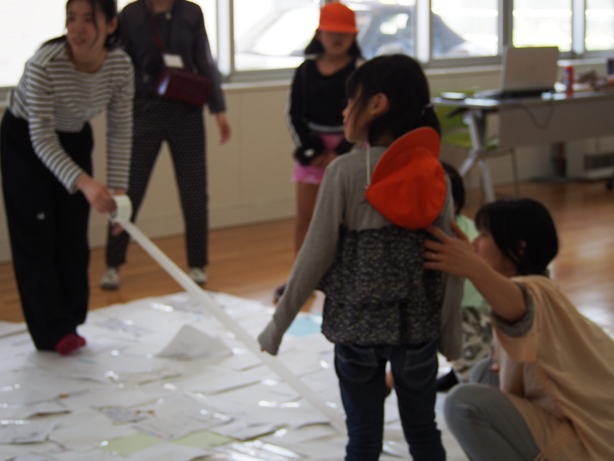 中休みになると、アトリエに子どもたちがやってきた。縦と横を丈夫になるようにテープを貼っていると、やってみたい子が続々と。