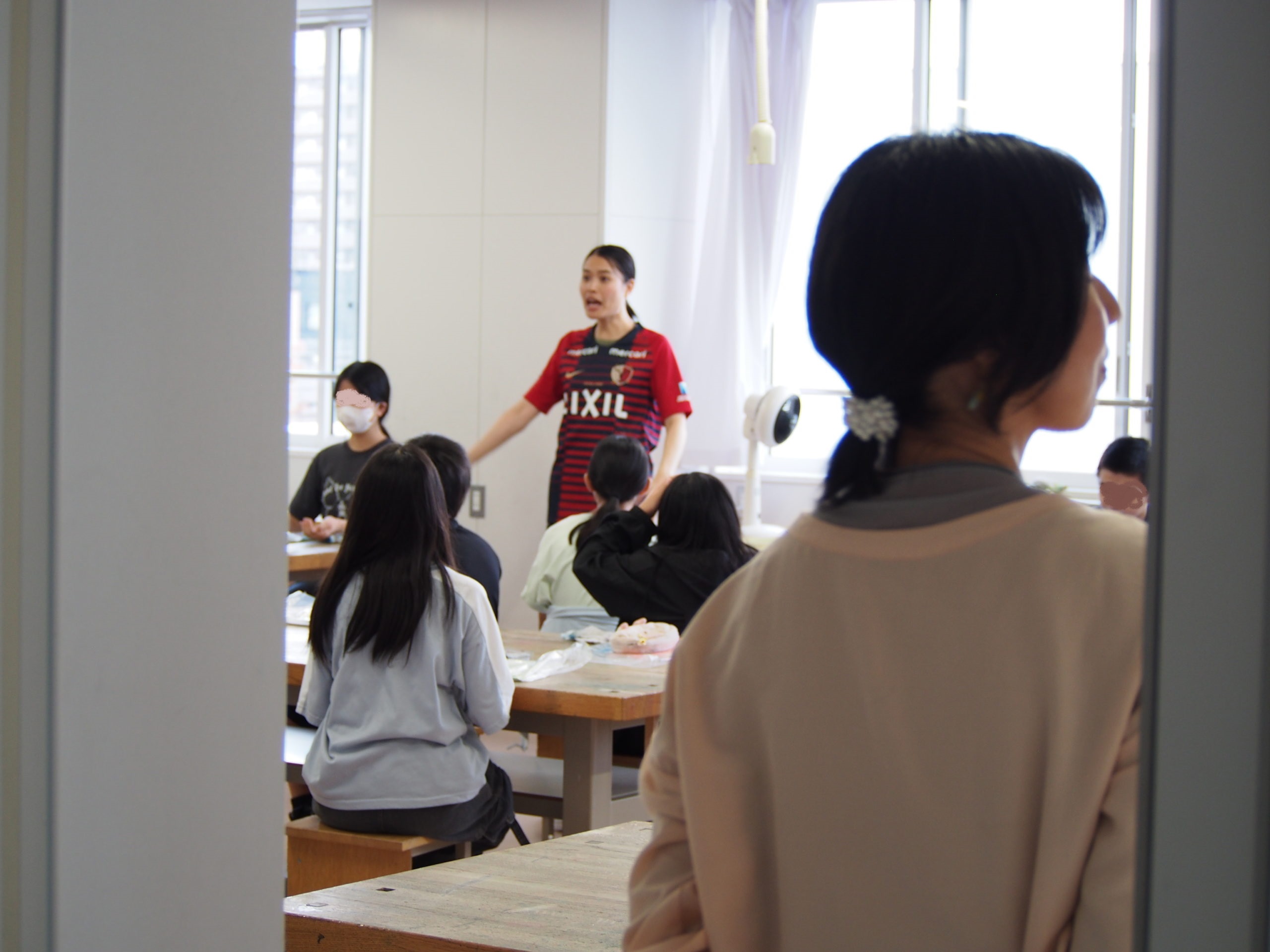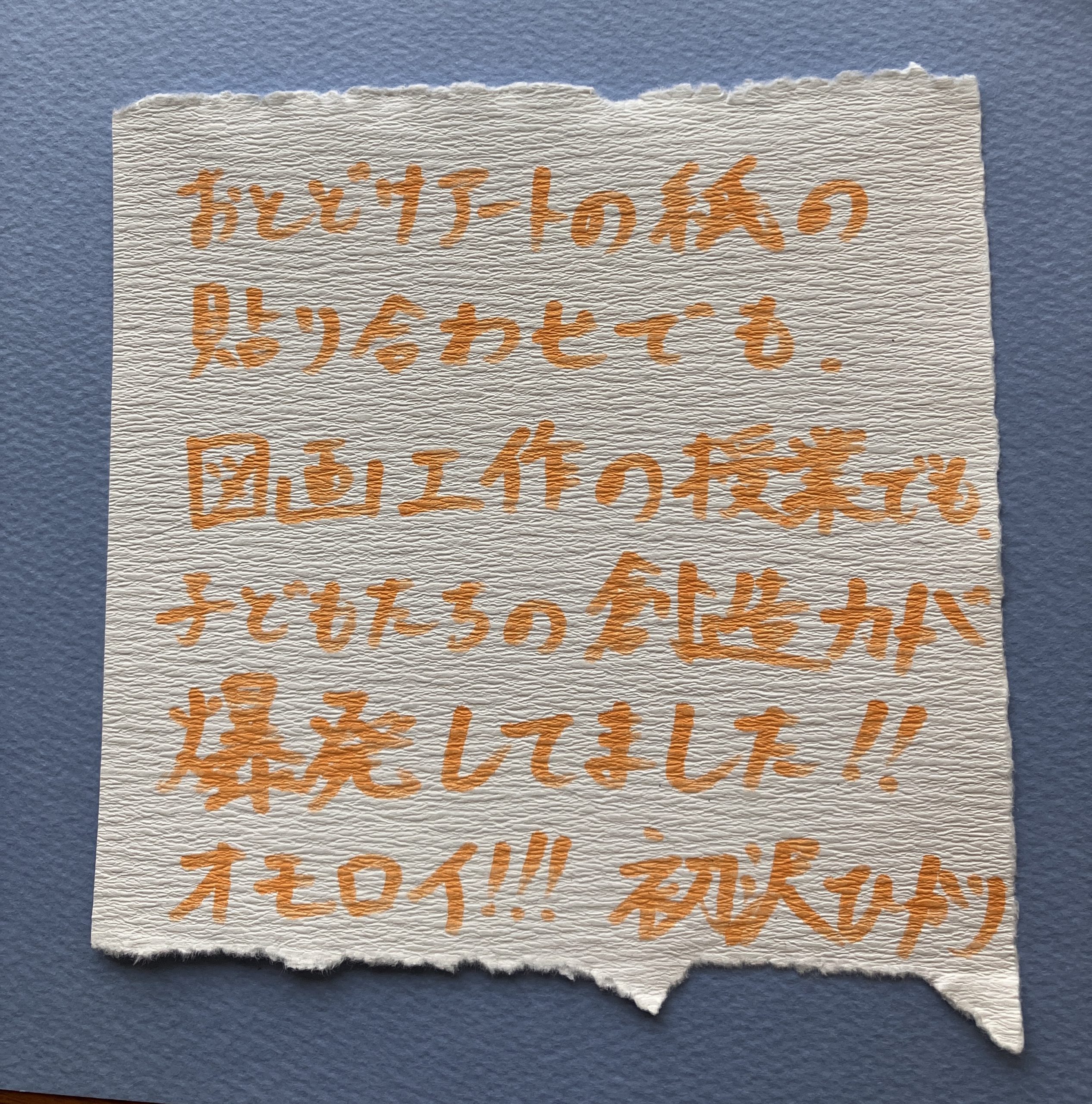 追いかけて行ってみると…。担任の杉山先生がにっこり。杉山先生は、以前、別の小学校在任中、おとどけアートを体験している先生で、転校初日から子どもたちと一緒にあっちのアトリエ(多目的室)を見学に来てくださったり、給食も一緒に入れてくださった。今日は2時間目と3時間目の図画工作の授業をあっちのアトリエで一緒にすることに。
