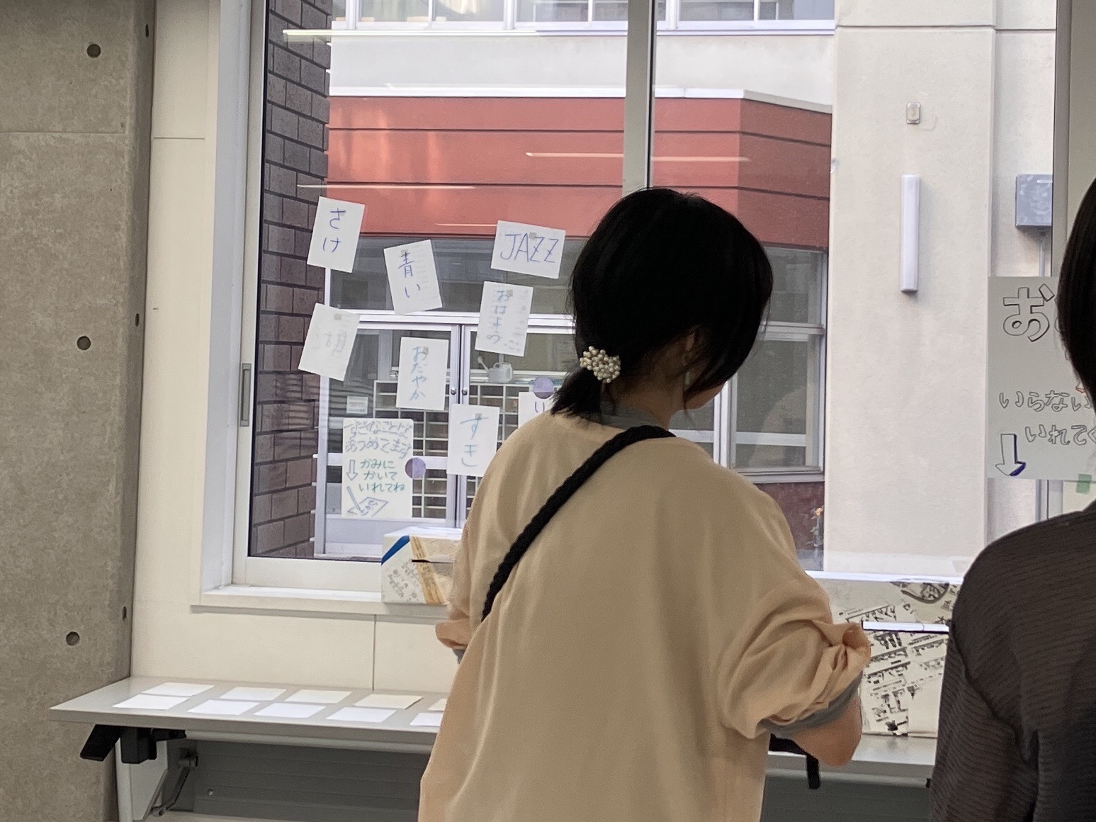 さっそくみんなで考えて自分の「すき」な言葉を書いてみる。「ゆっくりいそぐ」と書いてポストへ。…しまった!裏紙集めの「ウラミカミサマポスト」(仮称)に入れてしまった! 大丈夫。集めたら、サイクルに乗って……