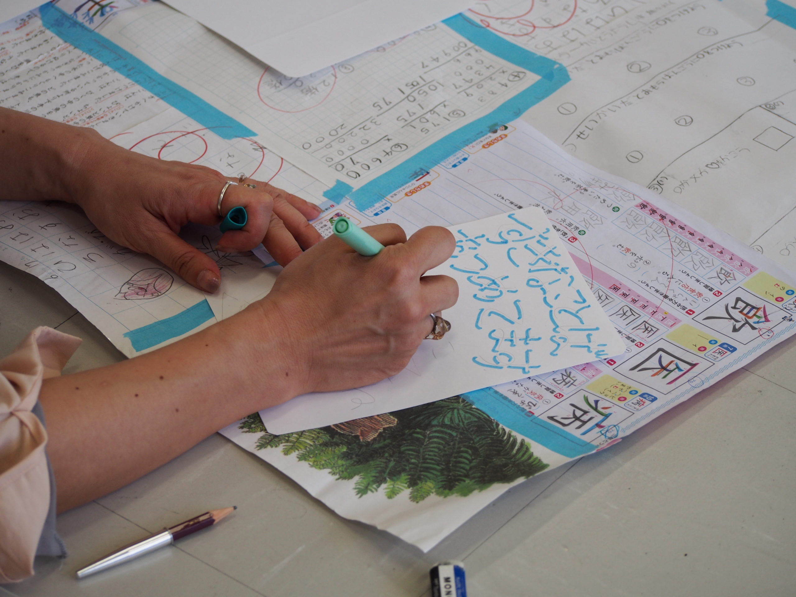 画家の羊さんは、ここに貼るのがしっくり来るという、色の隙間に文字の隙間に、そっと貼った。青虫と緑のコオロギと、しっくり。