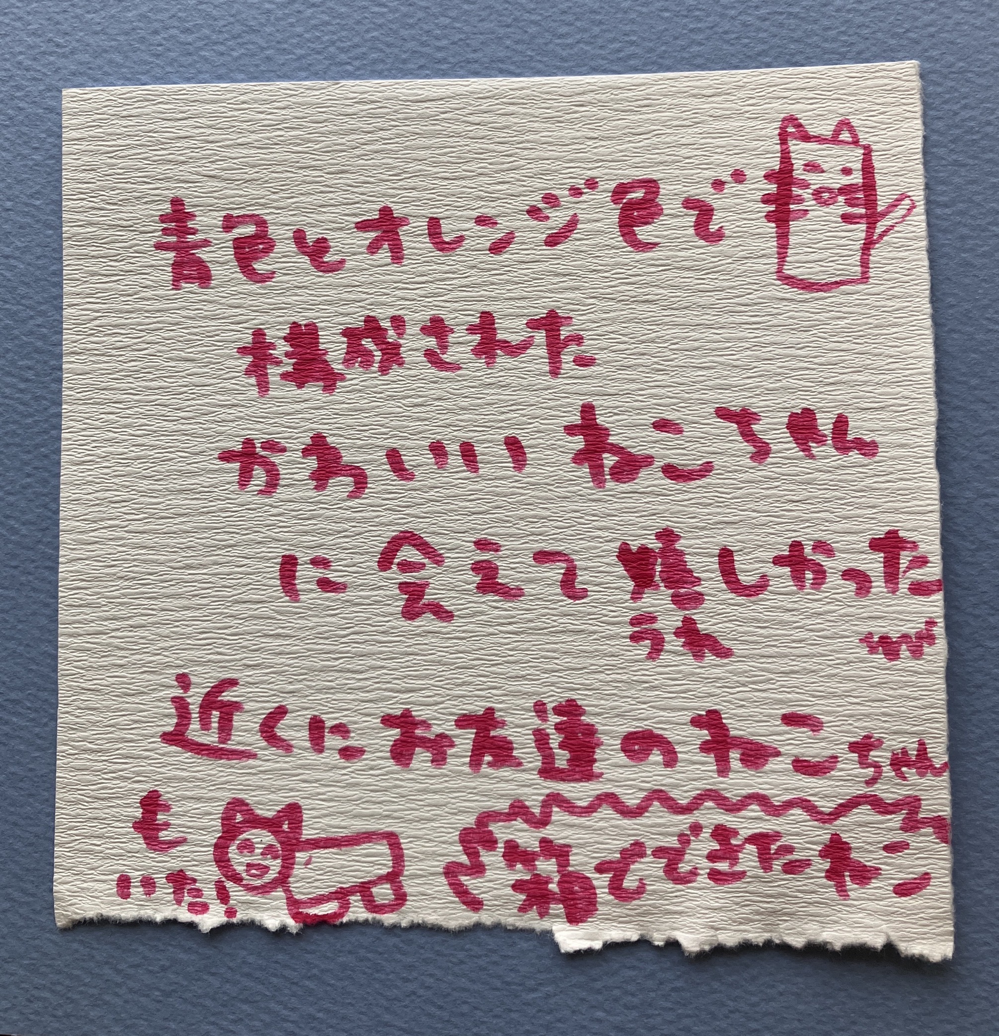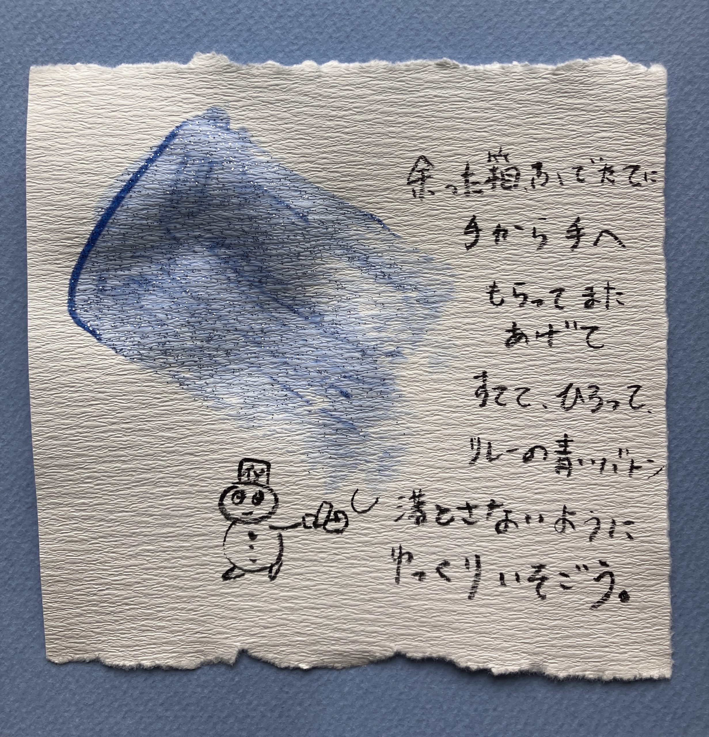図工の時間に箱が余ったからあげる、ともらった箱は偶然青い筒箱。あっちが何かペンを入れるものがないかな〜と探していたので、プレゼント。青い筆立てに。中に青い色のペンを入れてポストの横に置かれた。あっちが、次回来る時には「すきなことば」を書くための青いペンを持って来ること、とチームのみんなに言った。字が書ける青だったらなんでもいいのかな…?