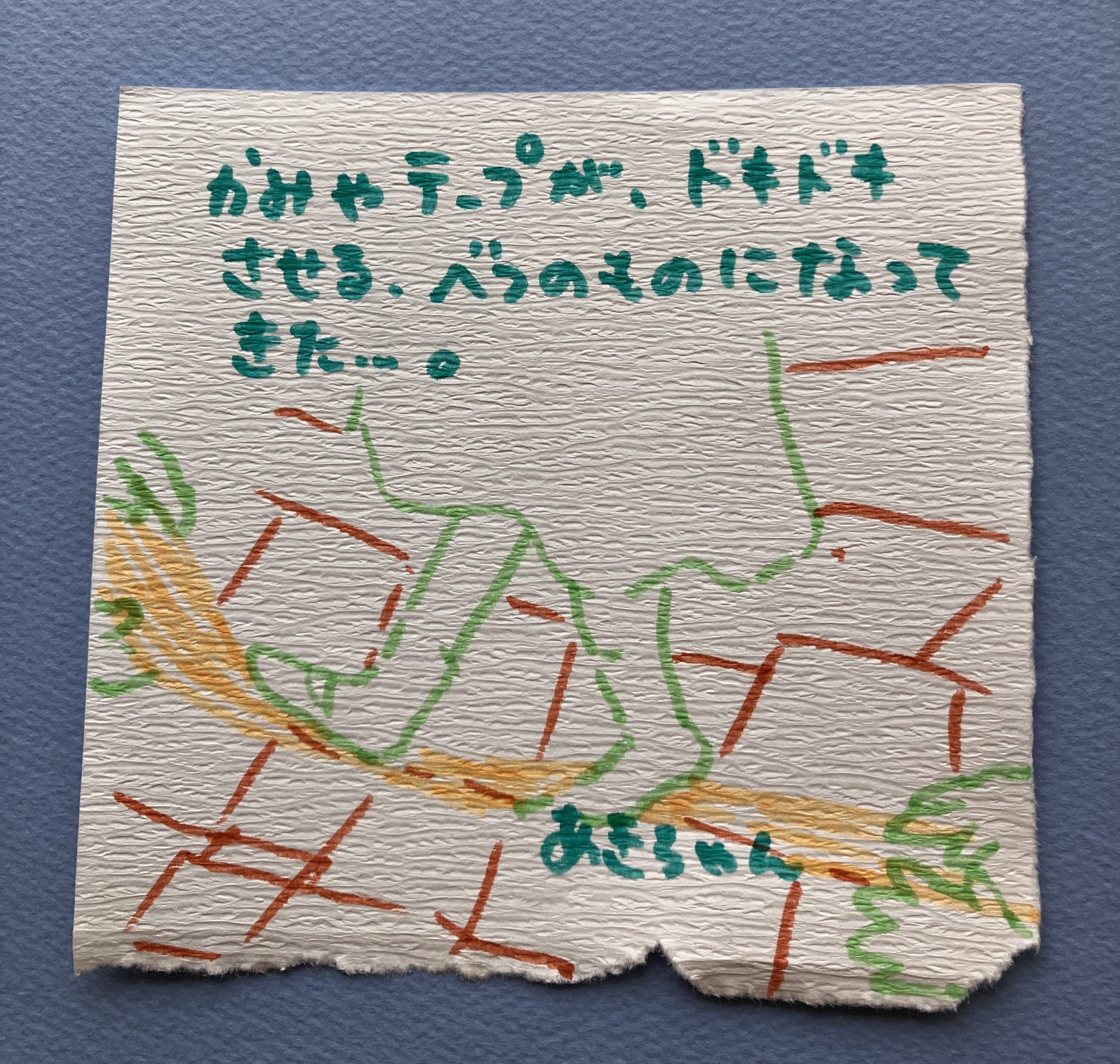 みんなの上手な作品を鑑賞していると、近くにいた先生が、時間が足りない、休みが無い、と言った。あきちゃんも、「もっと居たいのに」と言いながら、用事があって、「ここまで」というギリギリまで居て、下校していった。誰かに盗まれたわけではないけれど、時間が足りない、どうしても隙間時間が取れない時は、溺れないように大きく深呼吸、息継ぎをお忘れなく。