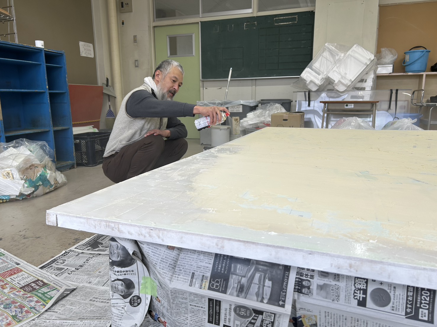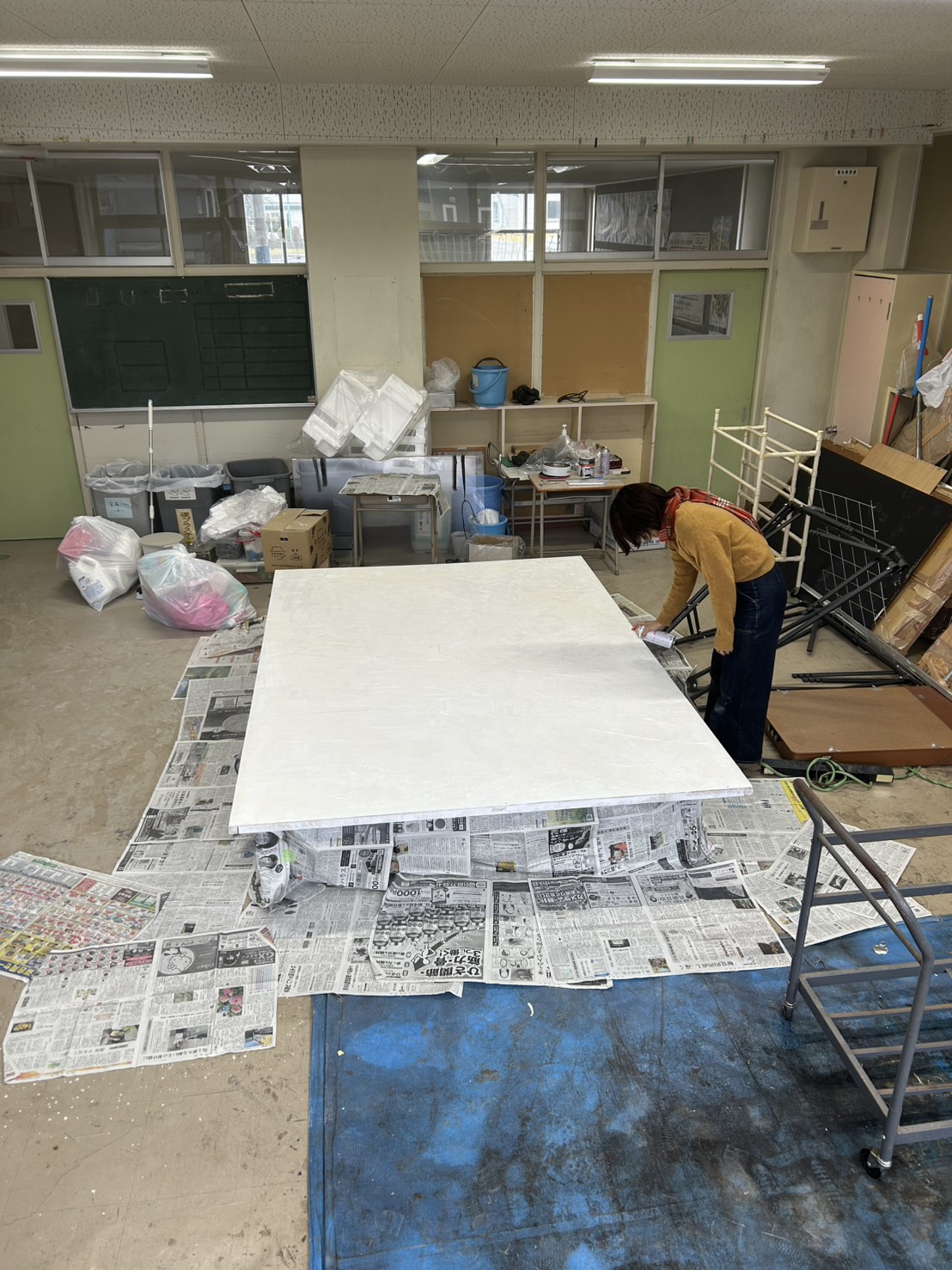 まずアートクラブがあった日、前回下地を塗ったパネルに白スプレーをかけました。スプレーの匂いが充満する中、ひたすらシューーーーッ