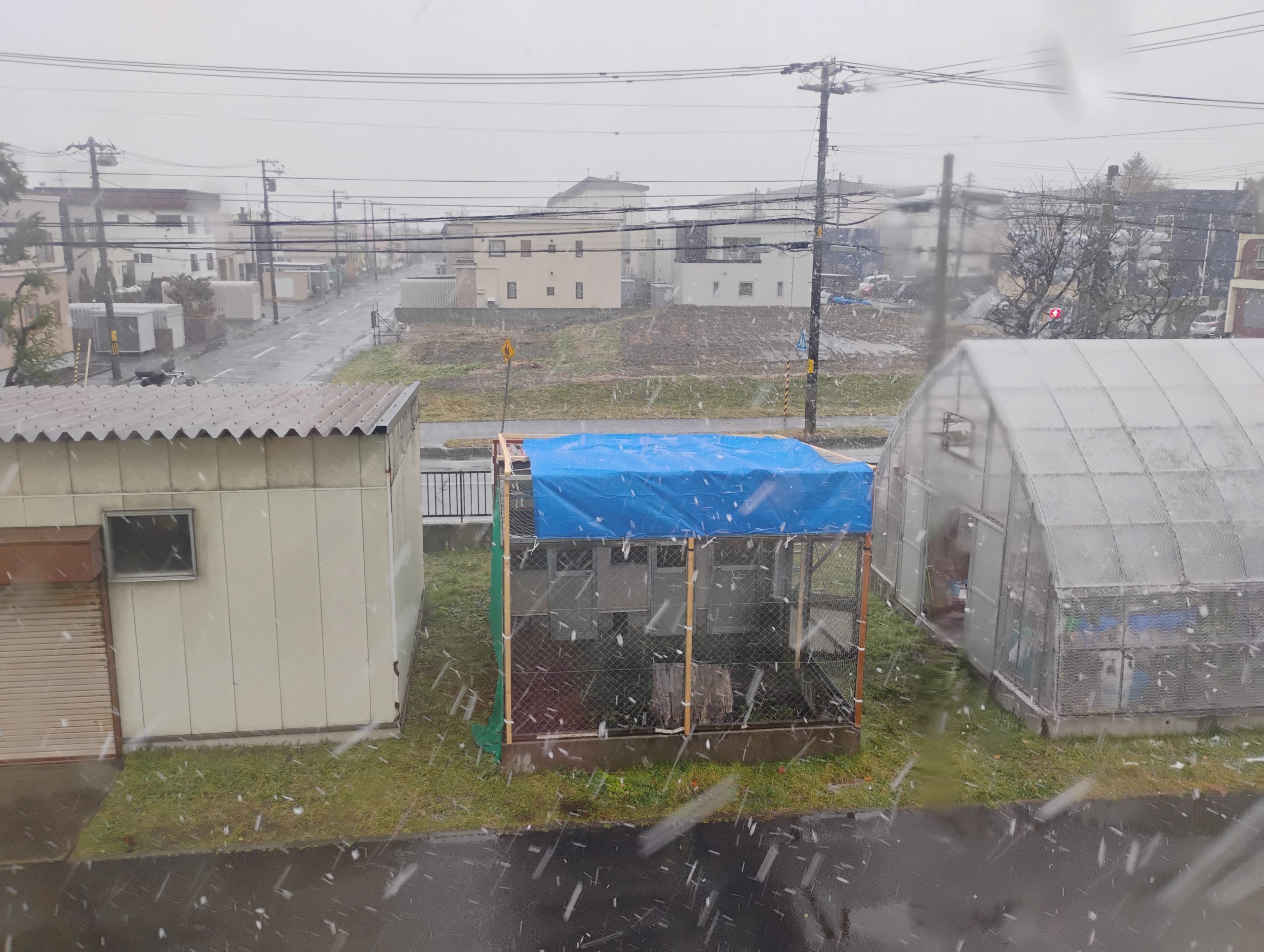 朝、来てみると元うさぎ小屋に張ったブルーシートの上に数日前に降った雪が溶け、完全に水として溜まっていました。