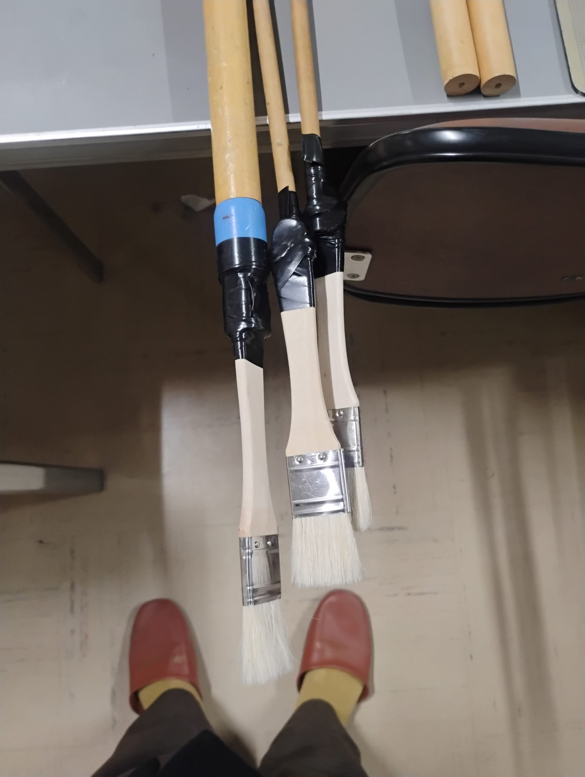 上ノさんが丁寧にみんなの作品を運ぶため準備をしている横で、私(舟迫)はせっせと謎の棒に筆をくくりつけたものを爆誕させていました。完成した筆を受け取ったコーディネーターの小林さん、笑顔で人に向かって指示棒のように振り回していますが。使い方、違いますよ。