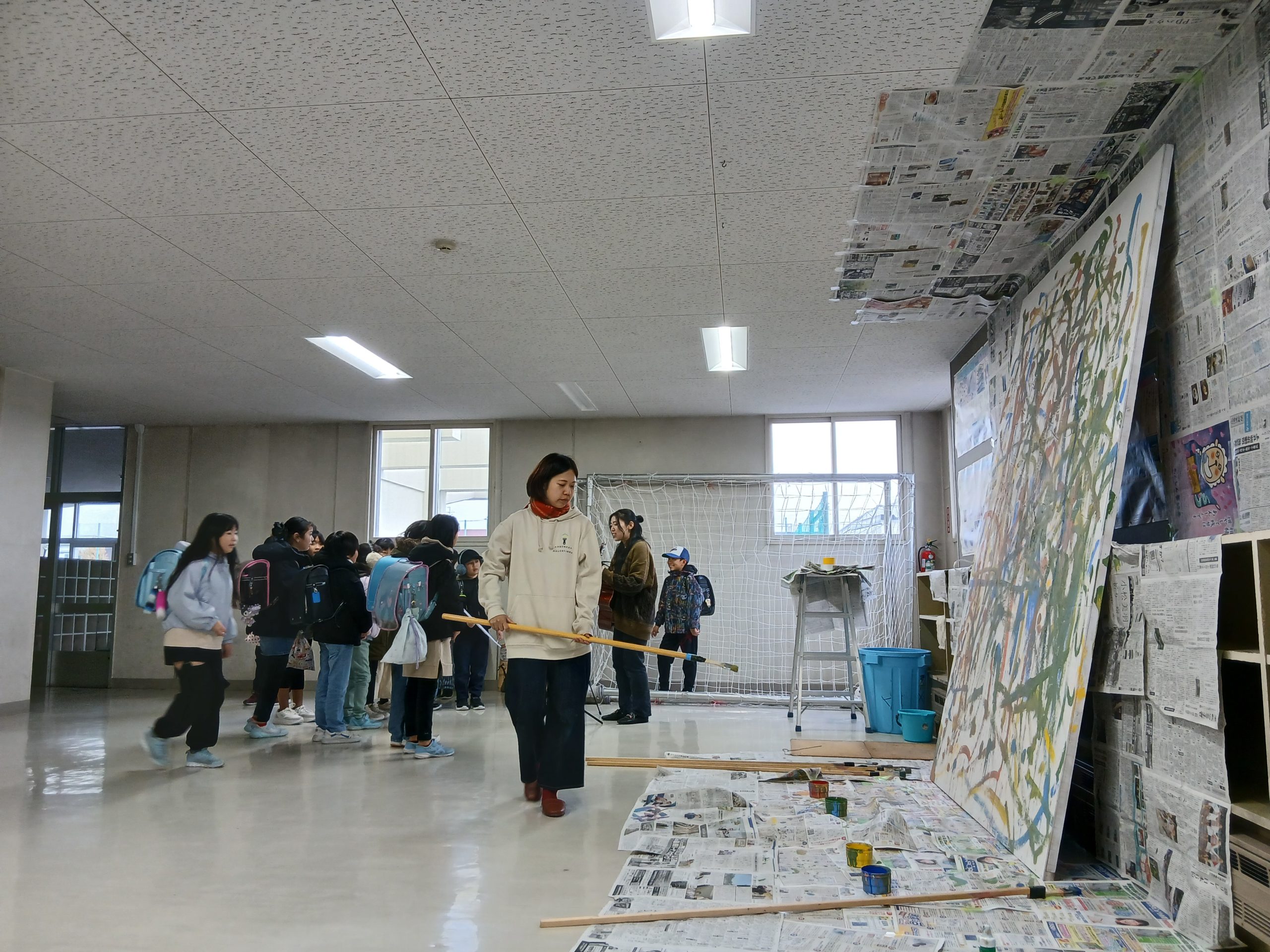 事前アナウンスなしのお試しでやってみたにも関わらず、主に5〜6年生の通りかかった子達が積極的に参加してくれました。みんな「えー?なんでも描いて良いのー?」と言いながら勢いよく好きな線を描いていきます。思いおもいに絵の具を塗り重ね、点を連ねてみたり、工夫する姿も楽しそう。これだけでも素敵な作品に見えてきます。