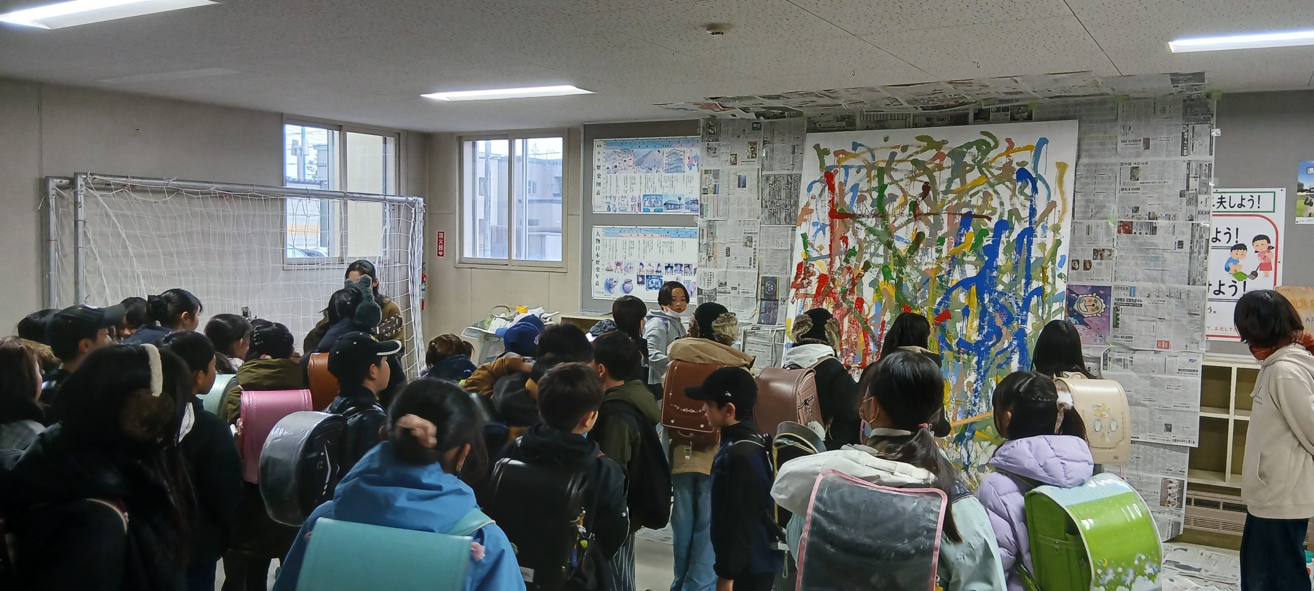 さて一方、こちら同時進行で進んでおります、初沢さんリサイタルと舟迫のペインティング企画。この日は本通小学校のサポートにも行っていた初沢さん、なんとかぎりぎり駆けつけ下校時刻に間に合いました。すぐに子どもたちに囲まれます。