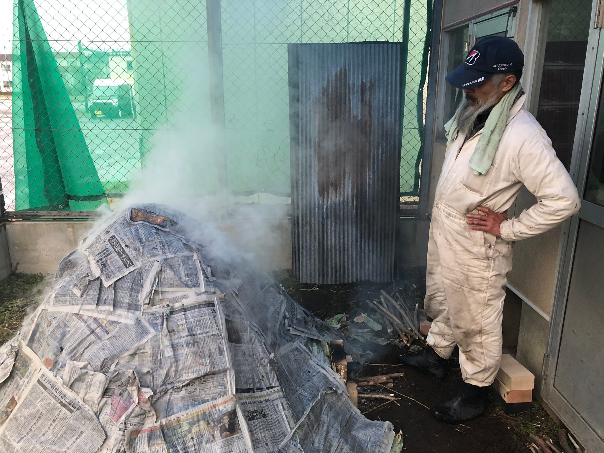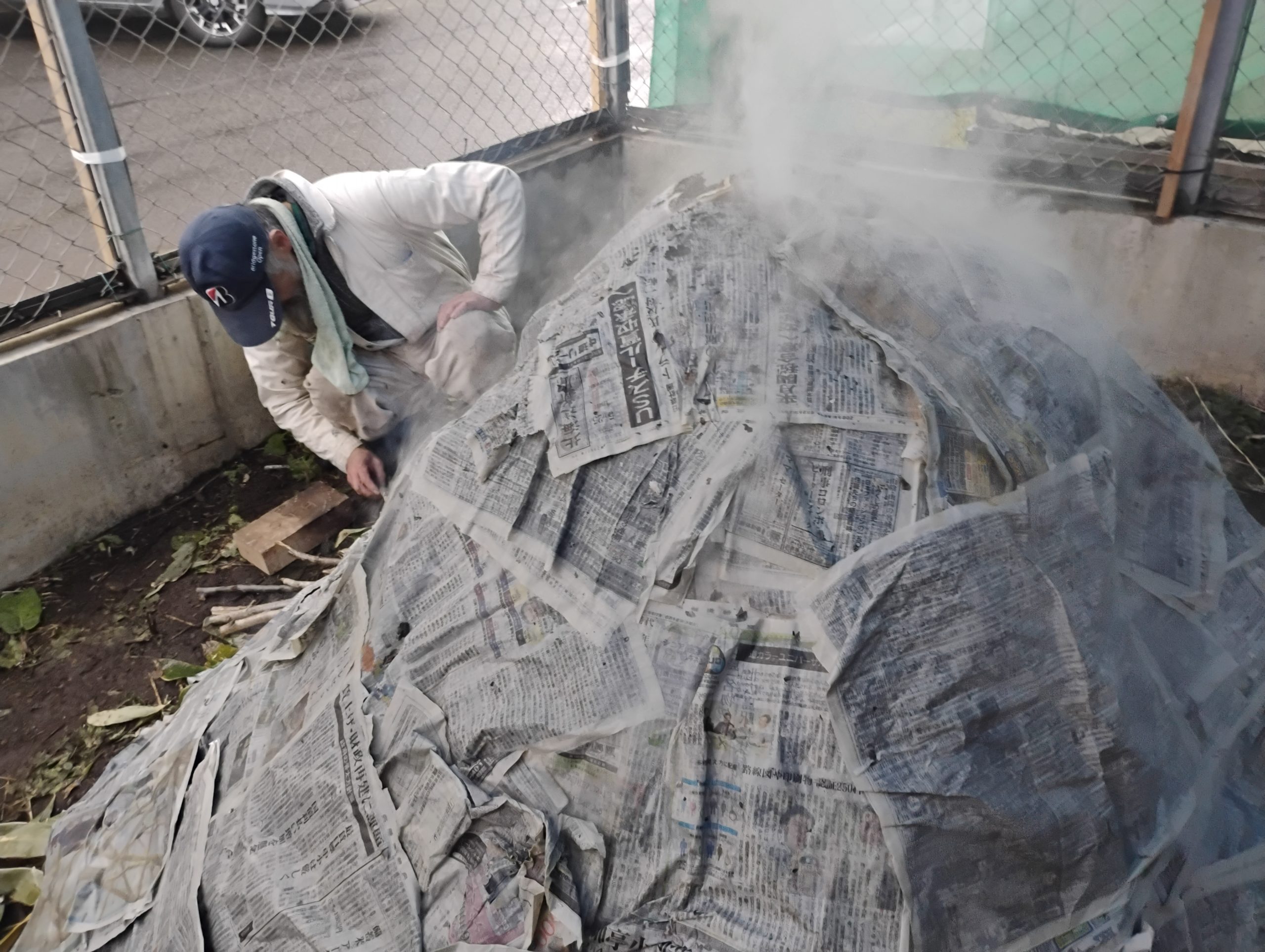 熱を中に閉じ込めるため、濡れた新聞紙で周りを覆います。煙がもくもくと立ち込め始めました。