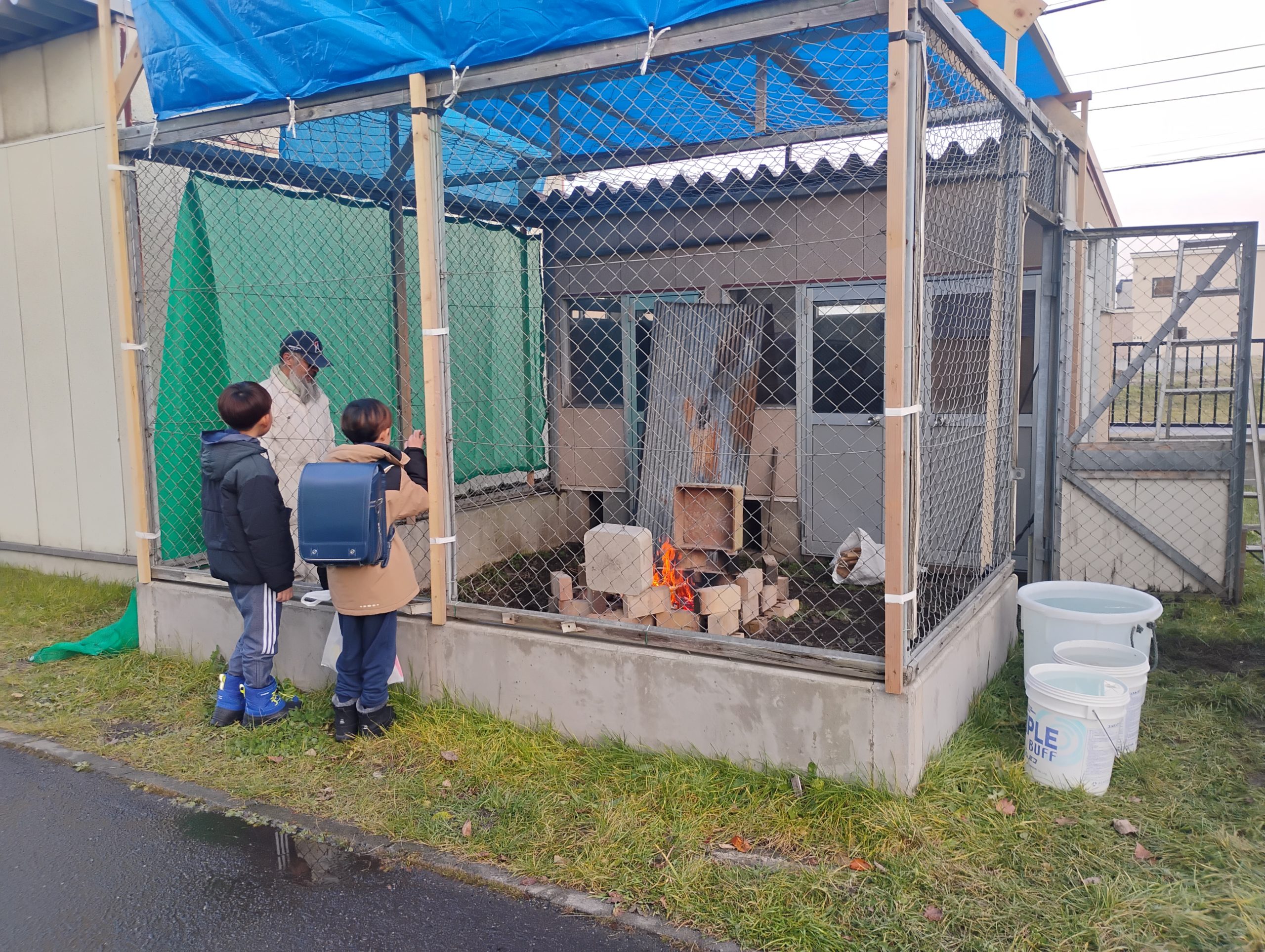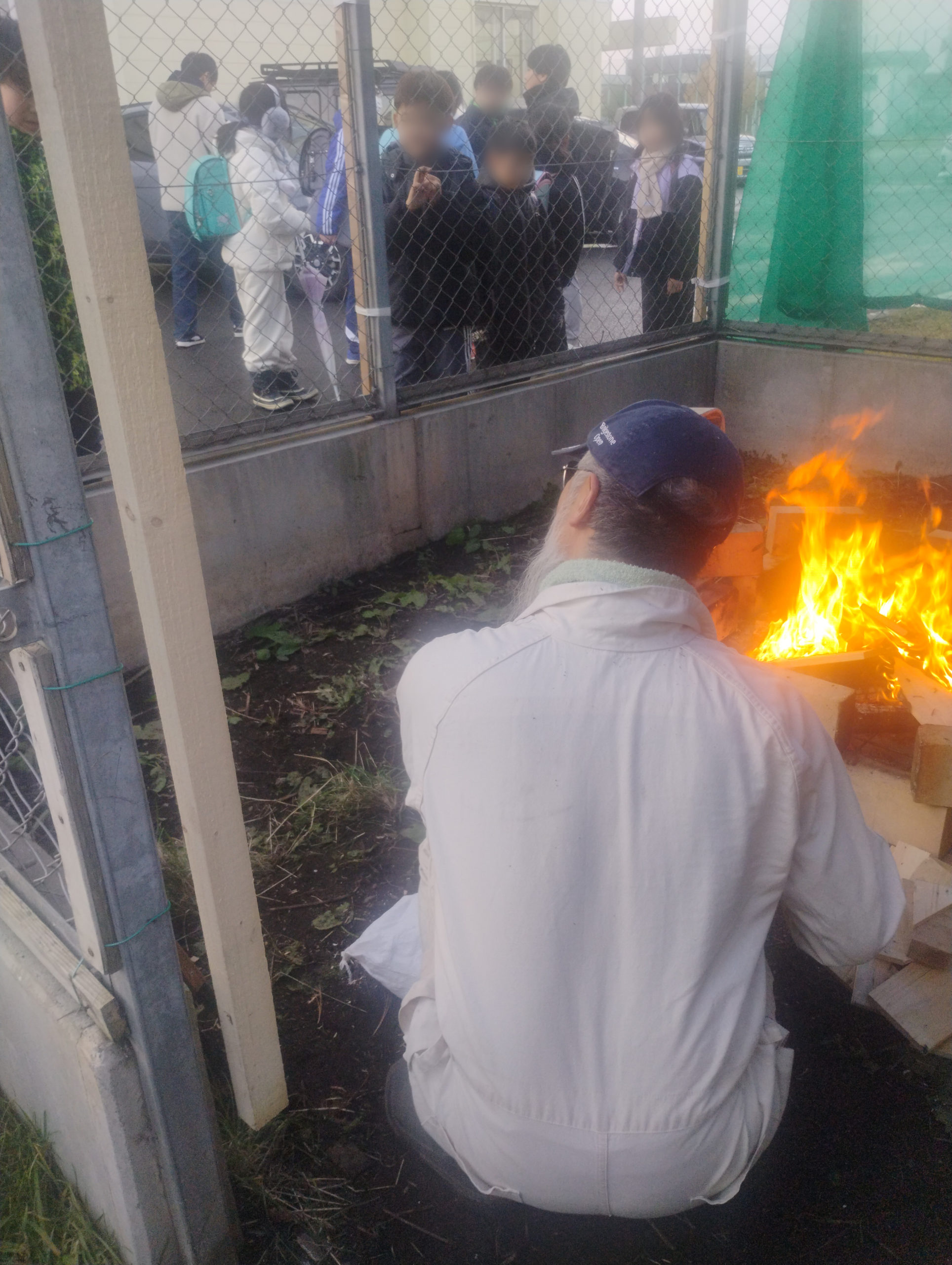 うさぎ小屋の柵があるおかげで、子どもたちが程よい距離を持ってみられているのはこの場所を選んだ特典ですね。安全に、煙に近づきすぎることなく見られます。
