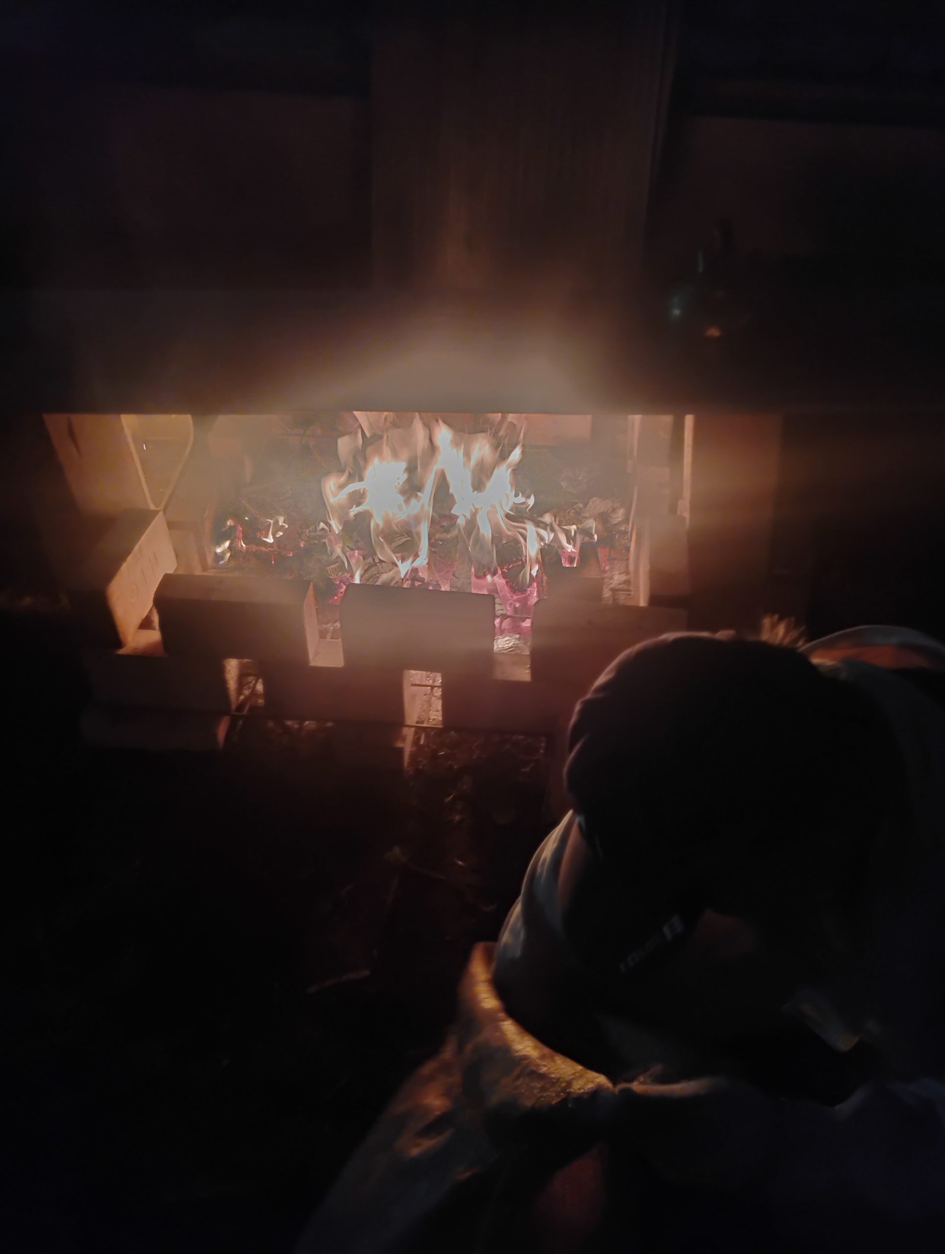 積まれたブロックの中に焚べられる木片たち。