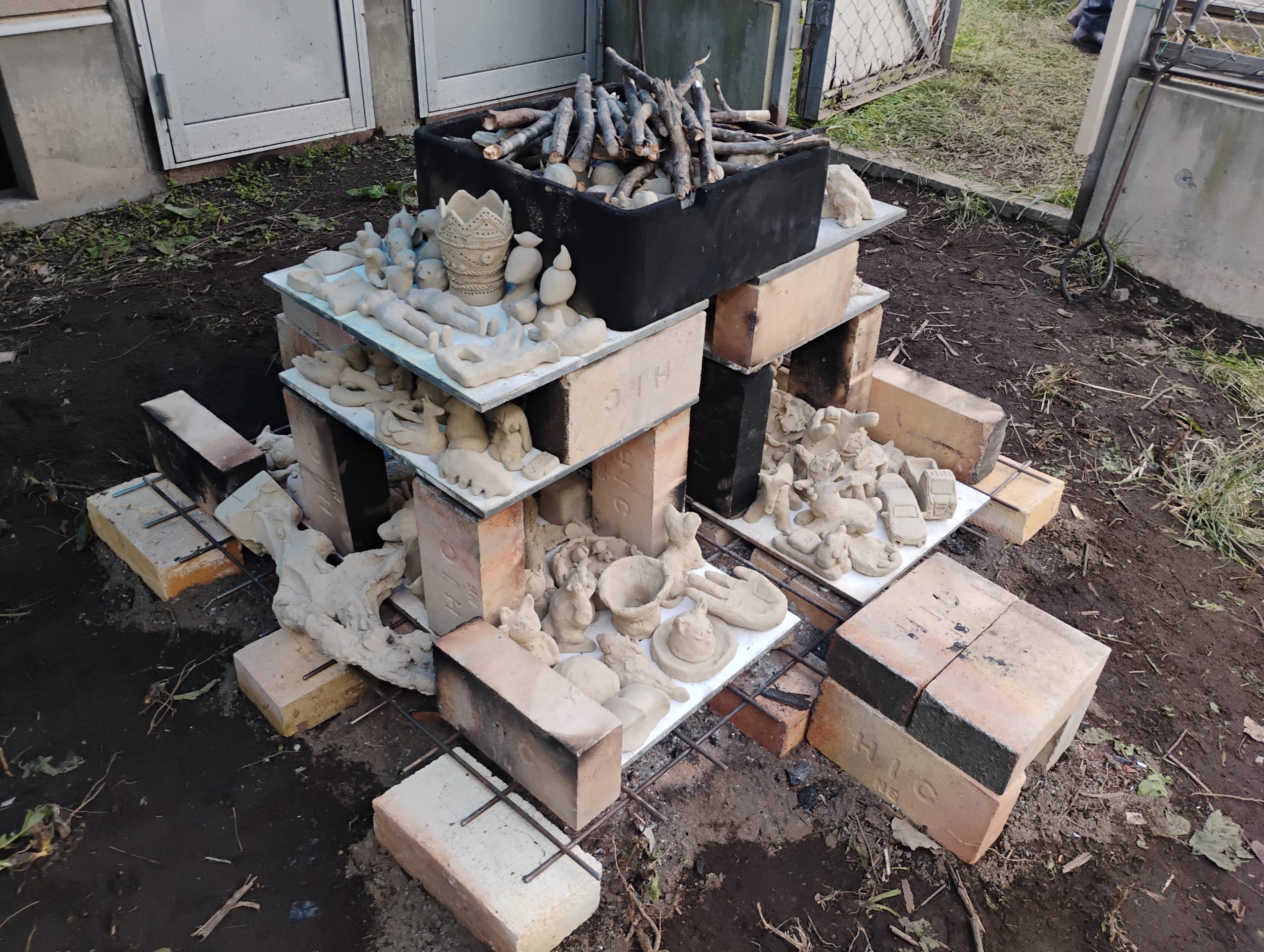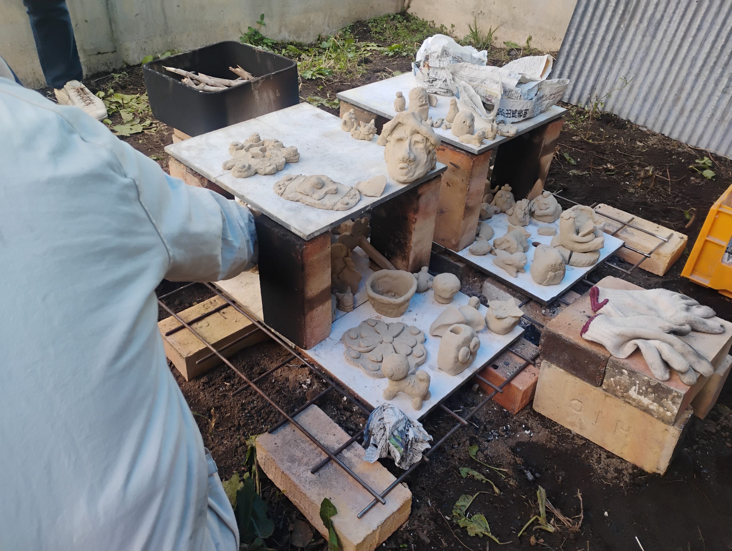同時進行で進んでいる本通小学校でのおとどけアートから預かった、小さな粘土作品(詳しくは本通小学校の記事を参照!)も箱の中に詰めました。火が通るためと固定のために枝を間に敷き詰め、うまくおさまりました。