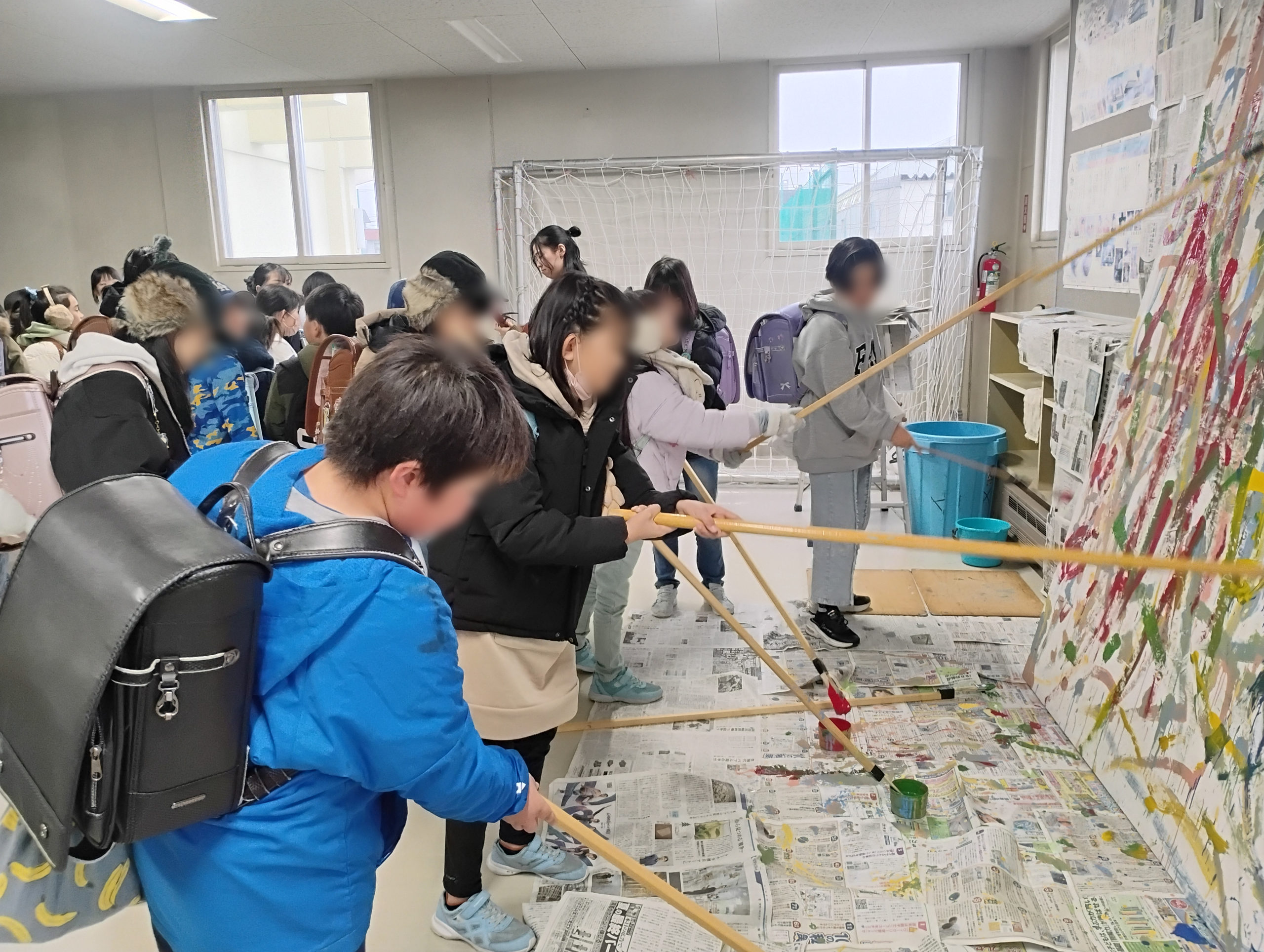 汚さないように念入りに新聞紙を引き、天井まで貼ります。筆が長いので身長の高い子は天井まで届いてしまうかもしれません。そして、倒れないように紐でくくりつけてくださる上ノさん。流石の気配りです。
