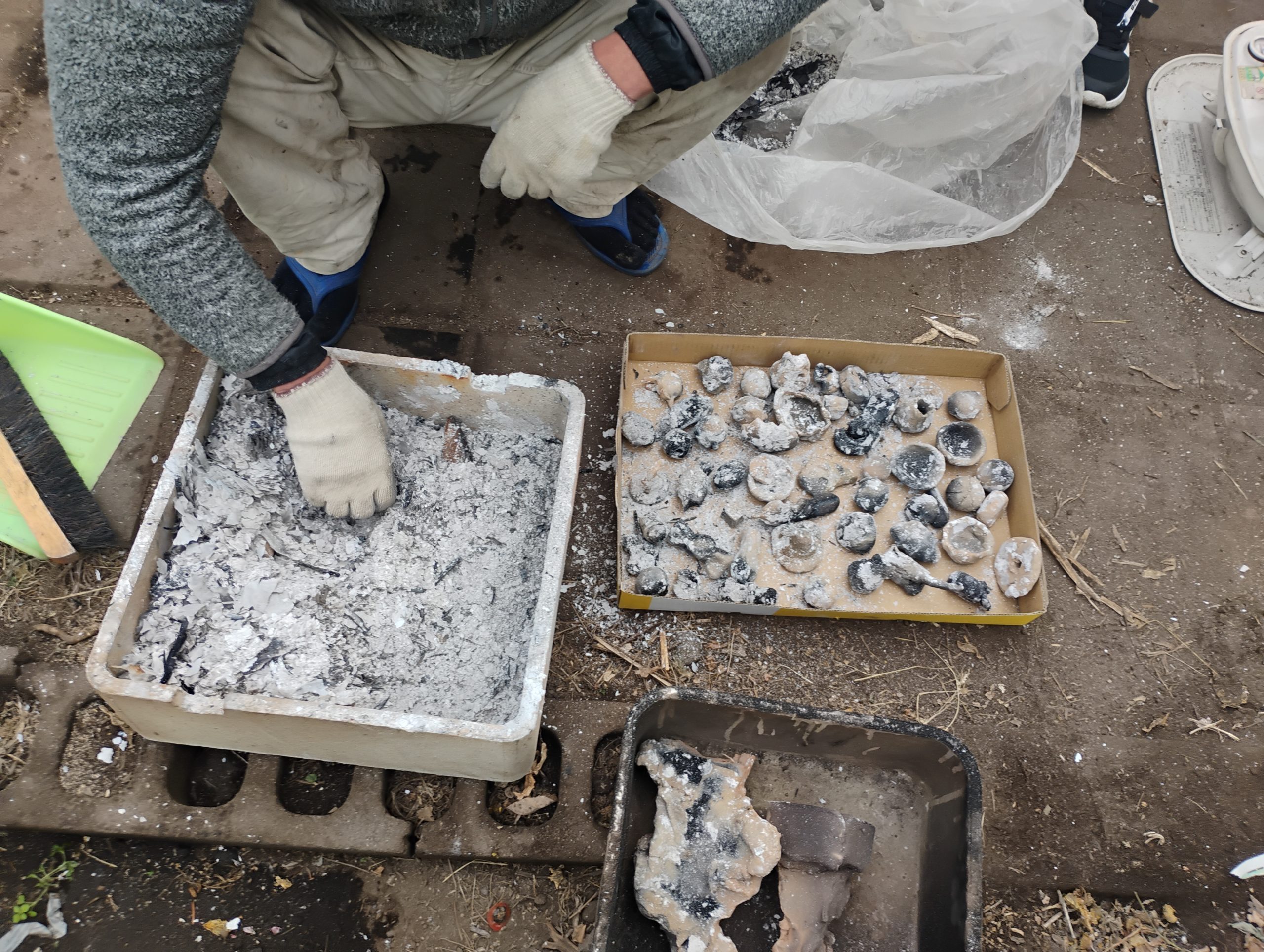 野焼き会場は思いのほか熱さも取れていたため、さっそく粘土を取り出していきます。