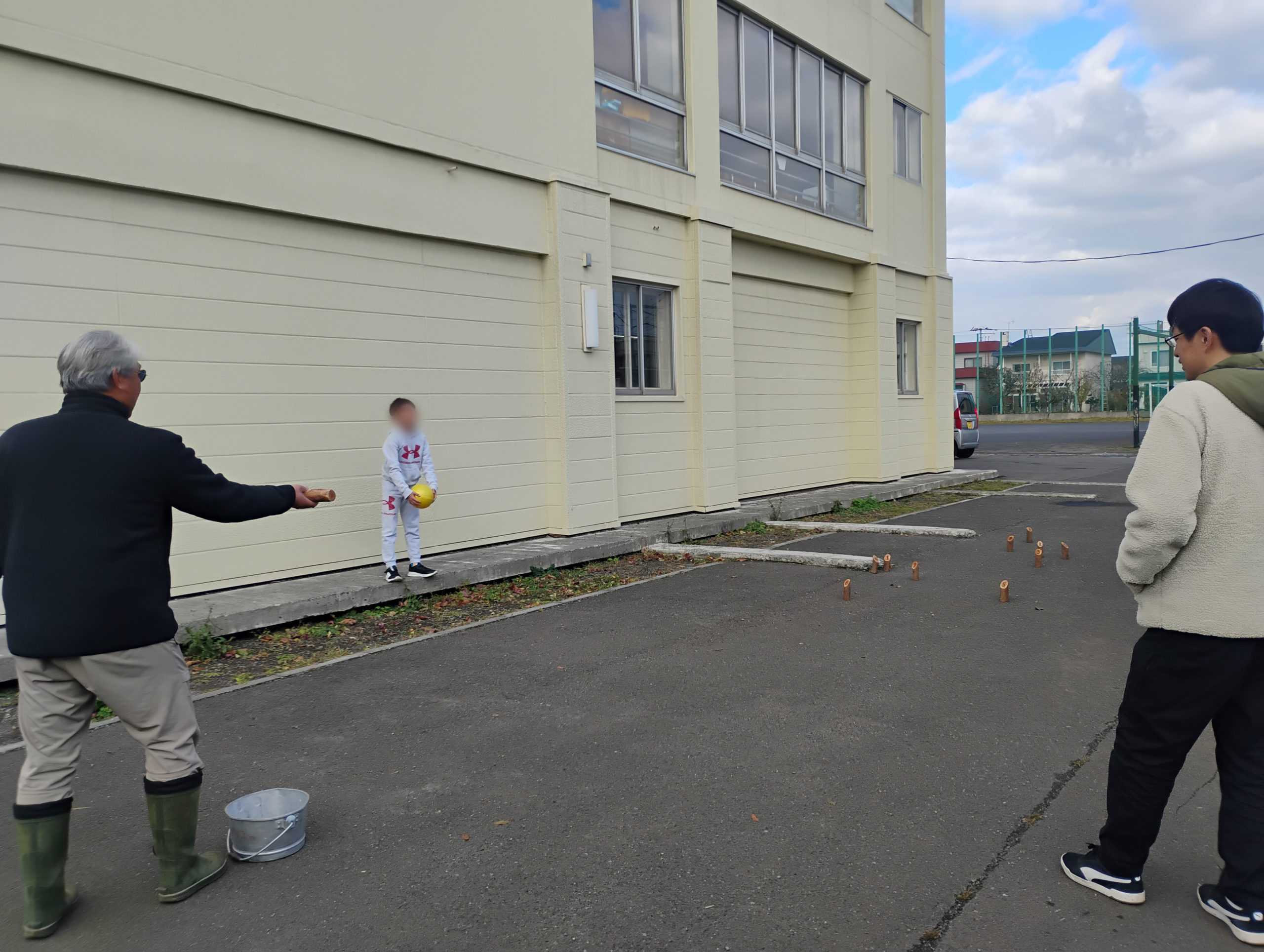 一方こちら校長先生とコーディネーター小林チームは、朝起こしに来てくれた子と一緒に「第一回野良モルック大会」を開催していました。