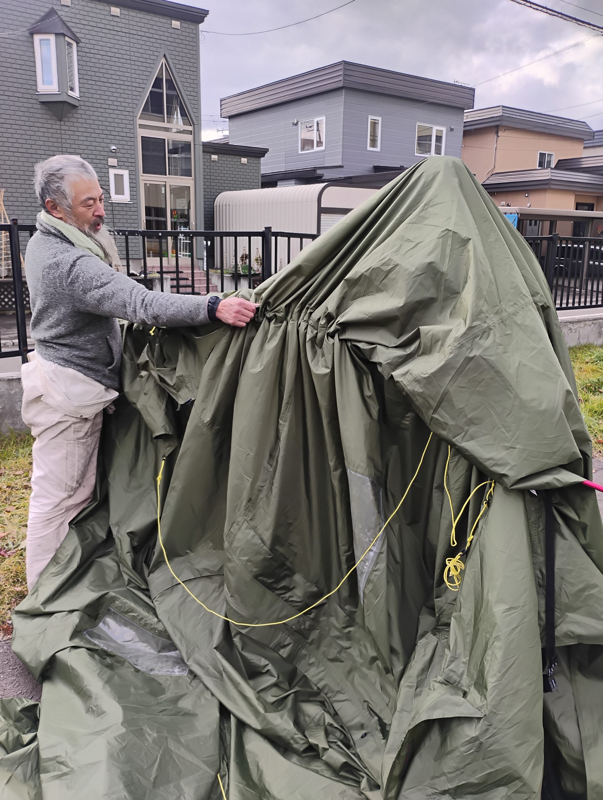 朝、校長先生が持ってきてくださったテントを建てる際も、風に煽られながら・・・大変だったんです。野焼きのサポート組は交代交代テントで暖を取りながらやっていましたが、やはり寒い。