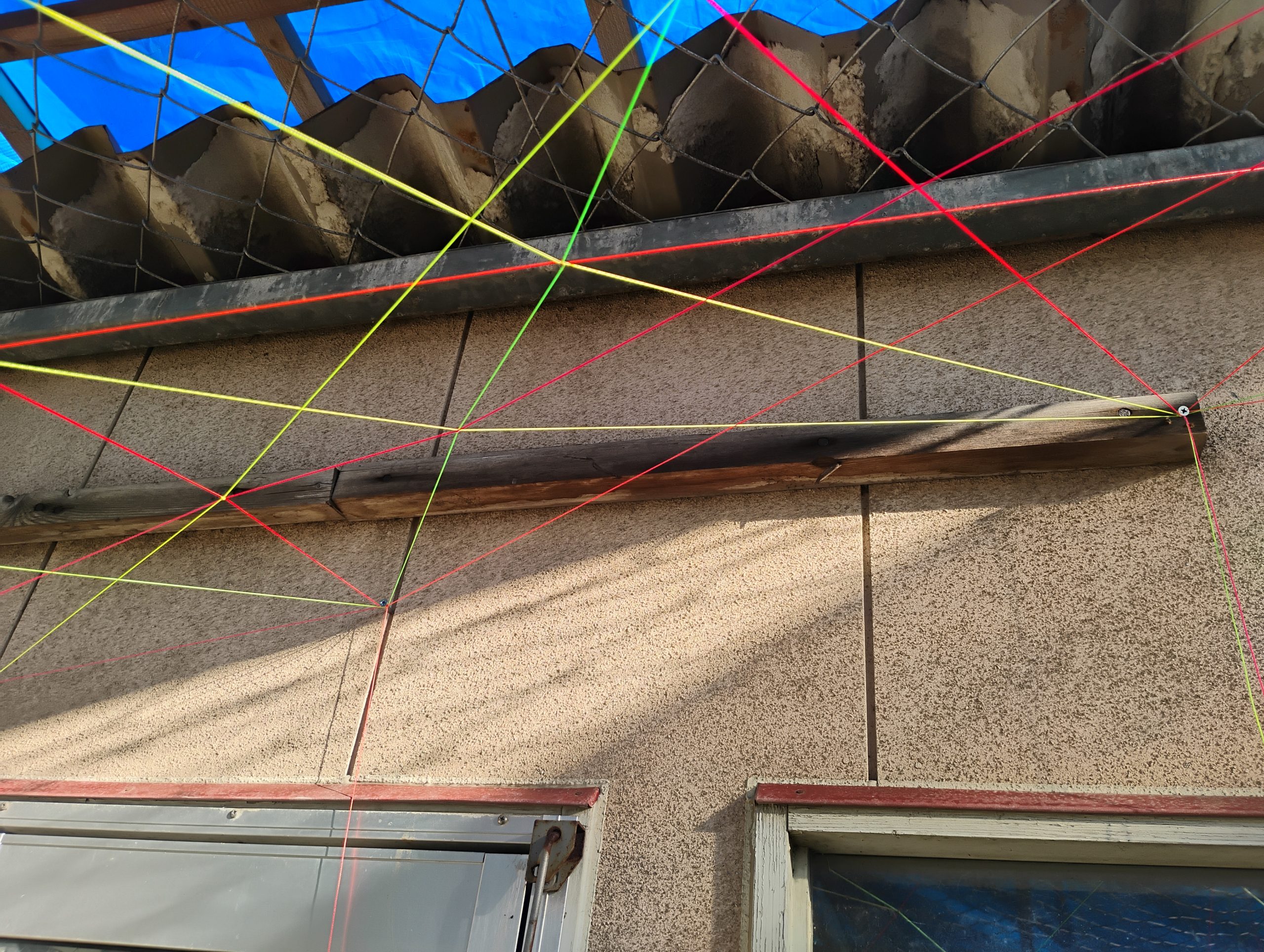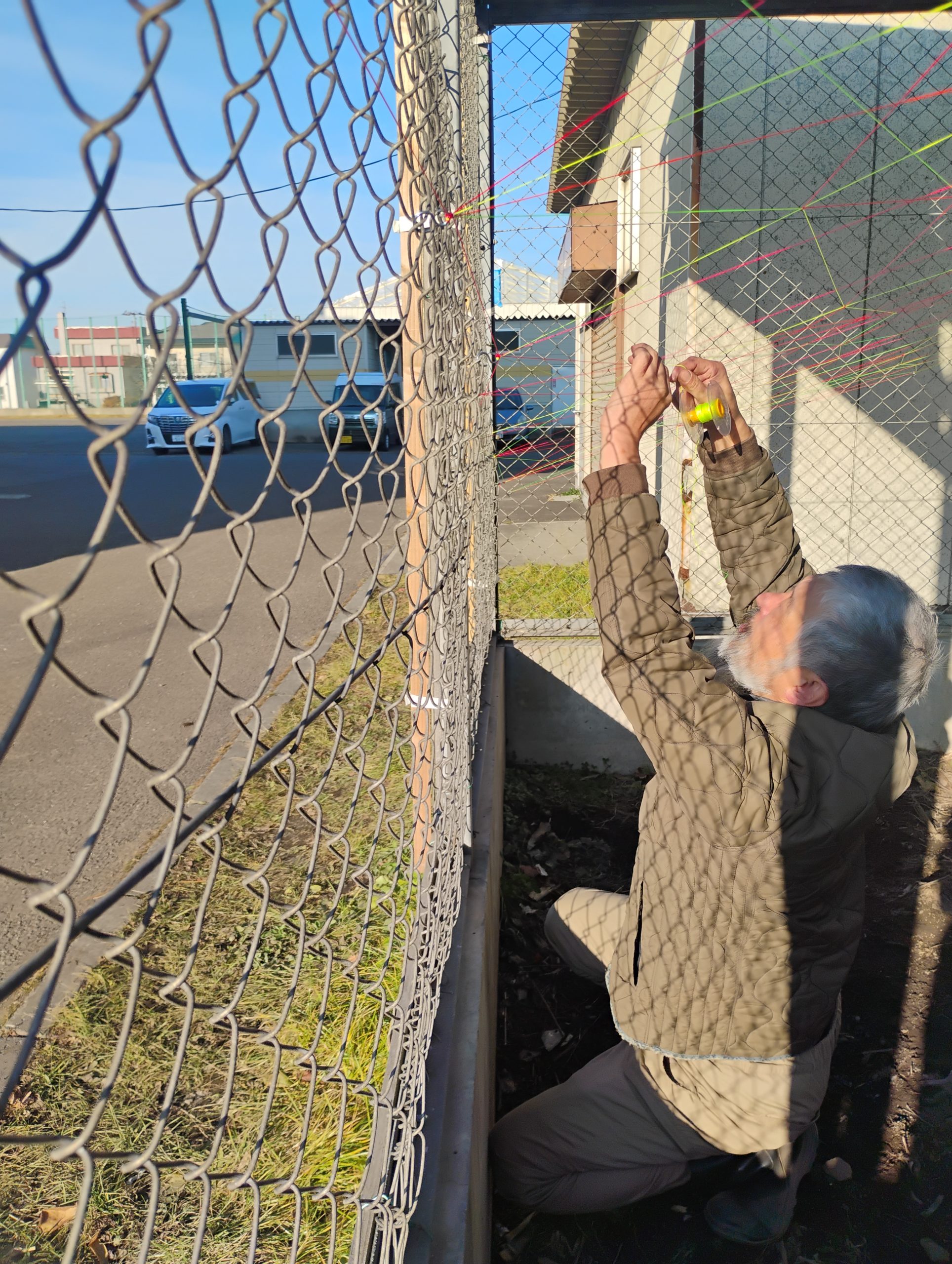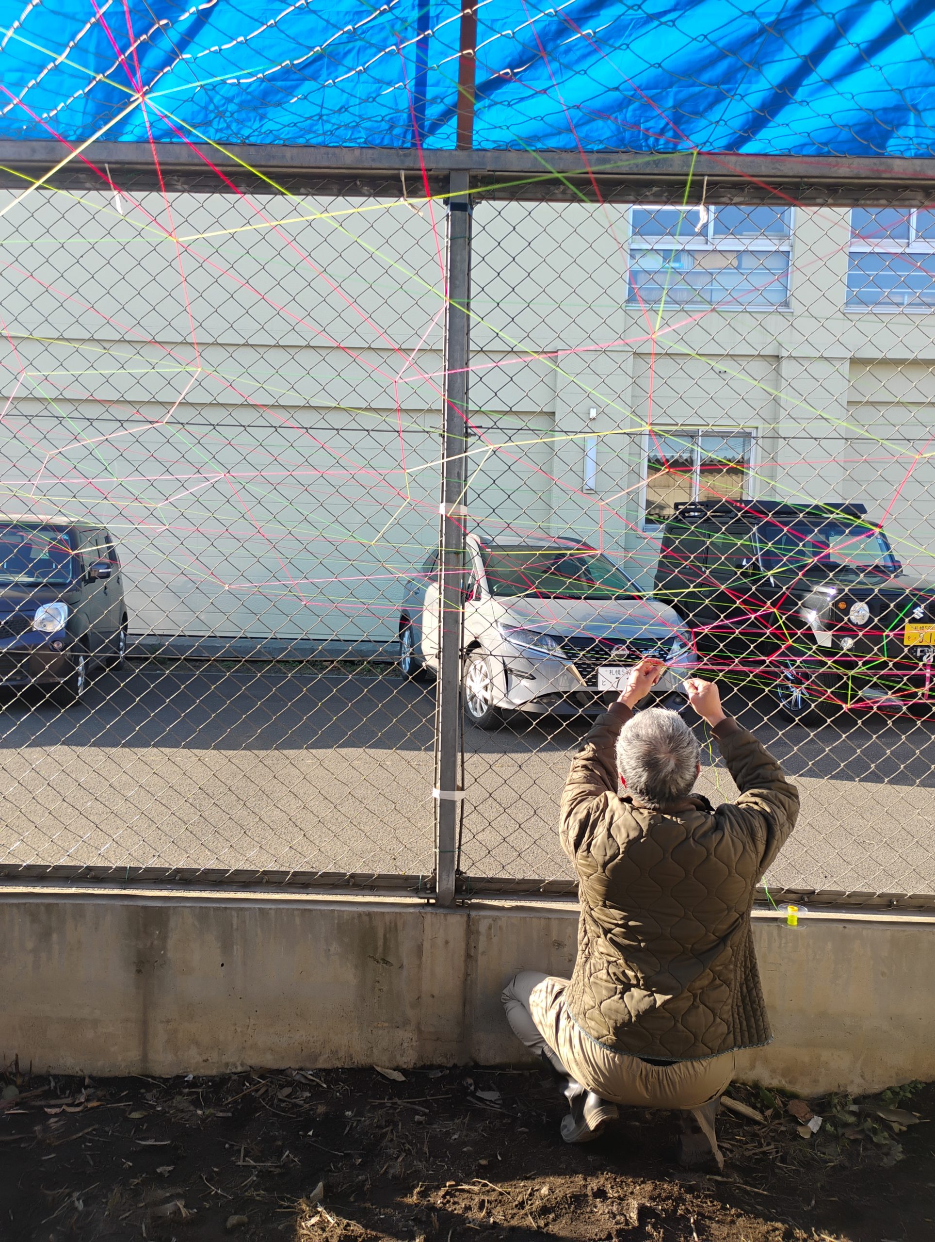 このカラフルな糸たちは建築現場などで使われる水糸というものだそう。建築や土木工事の現場で、水平や高さを出すための基準線を示すために使われる細い糸。