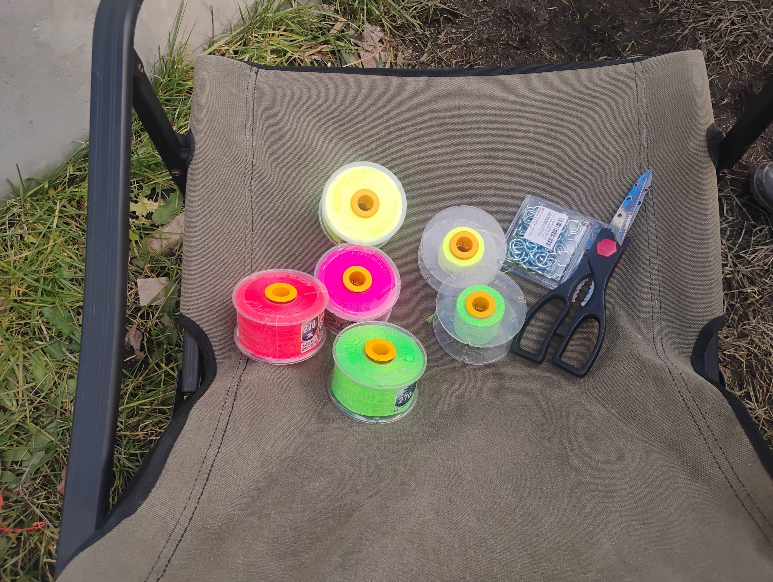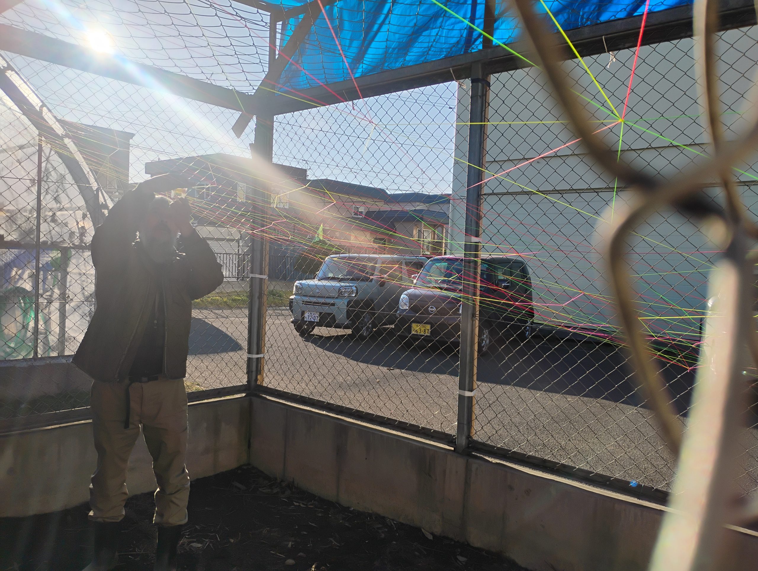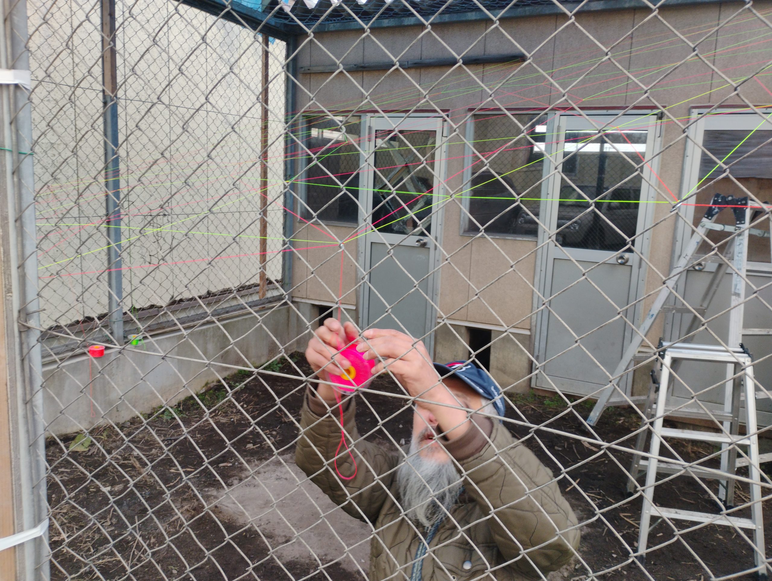 このカラフルな糸たちは建築現場などで使われる水糸というものだそう。建築や土木工事の現場で、水平や高さを出すための基準線を示すために使われる細い糸。