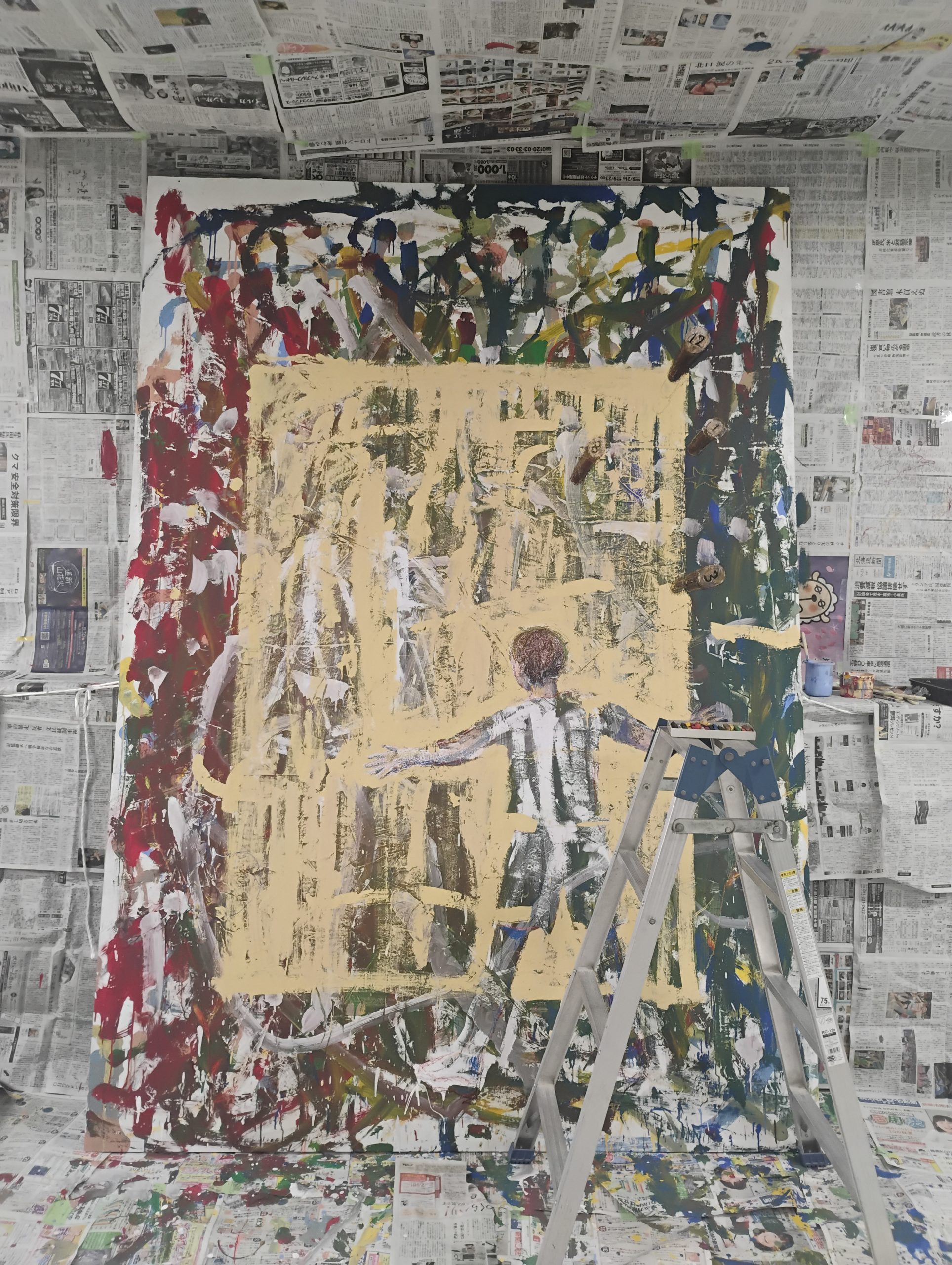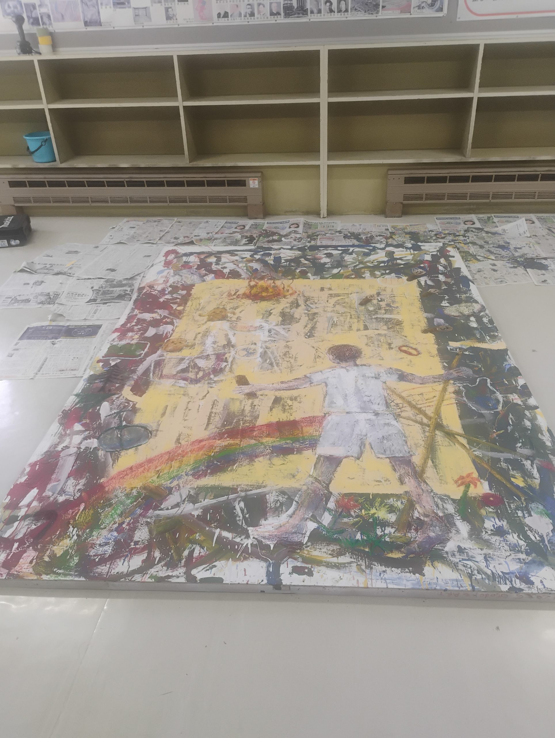 絵の具を使うと乾くのを待ったり、色を作ったりで時間がかかる為、今回はオイルパステルでがしがし描いていくことにしました。子どもたちが描いてくれた白い線が人に見えたところから、子どもの姿を描き起こしてみたり。また飛び散っている絵の具から「上ノさんのおとどけアート」を通して出会ったアイテムなども散りばめてみよう、と思いついたり試行錯誤。