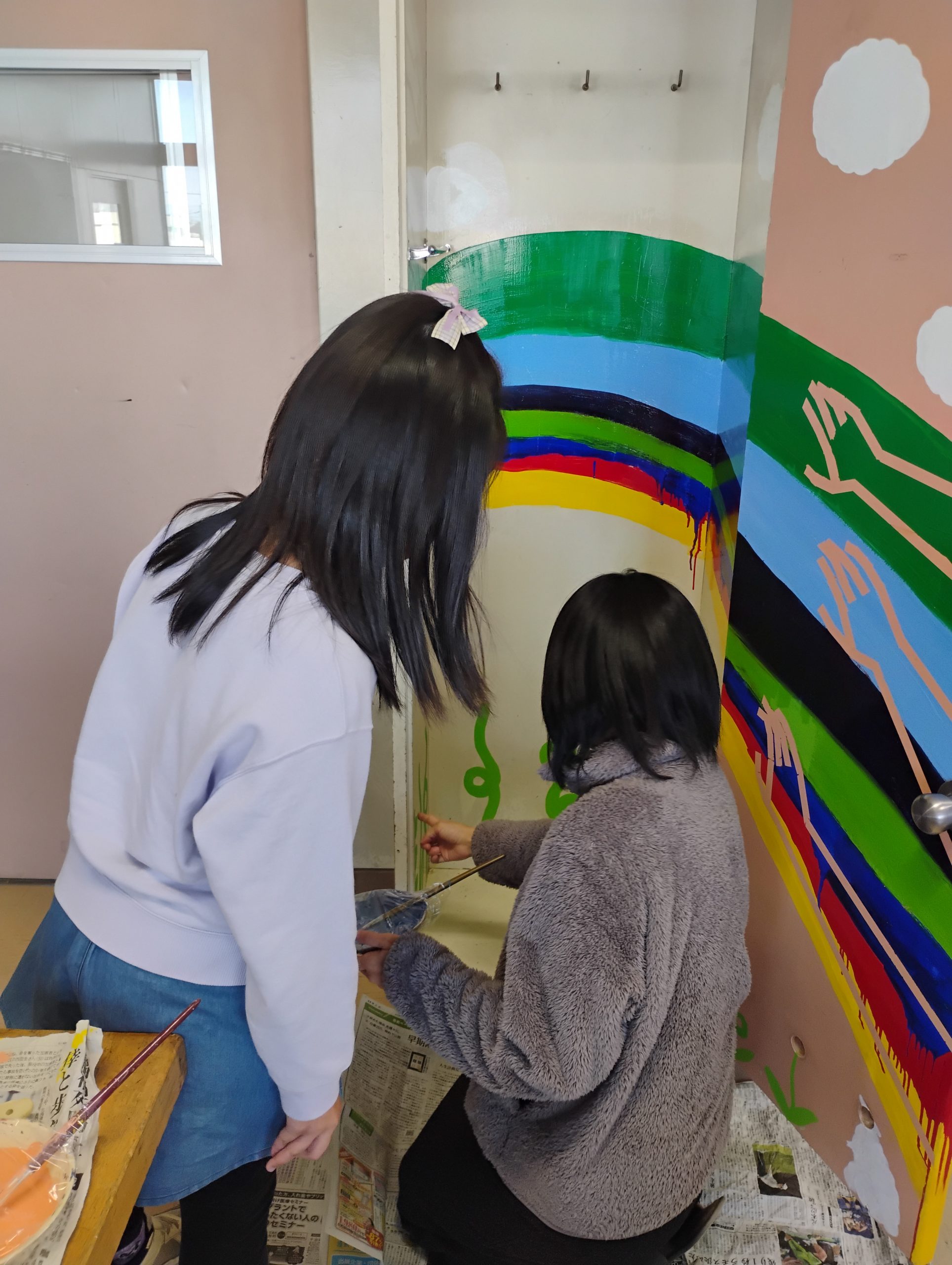 このように微調整をしていく木野さん。そんな中で「やはり子どもたちにも描いてもらいたいな」と言うことで、お昼休みに子どもたちに声をかけ一緒に描くことしました。
