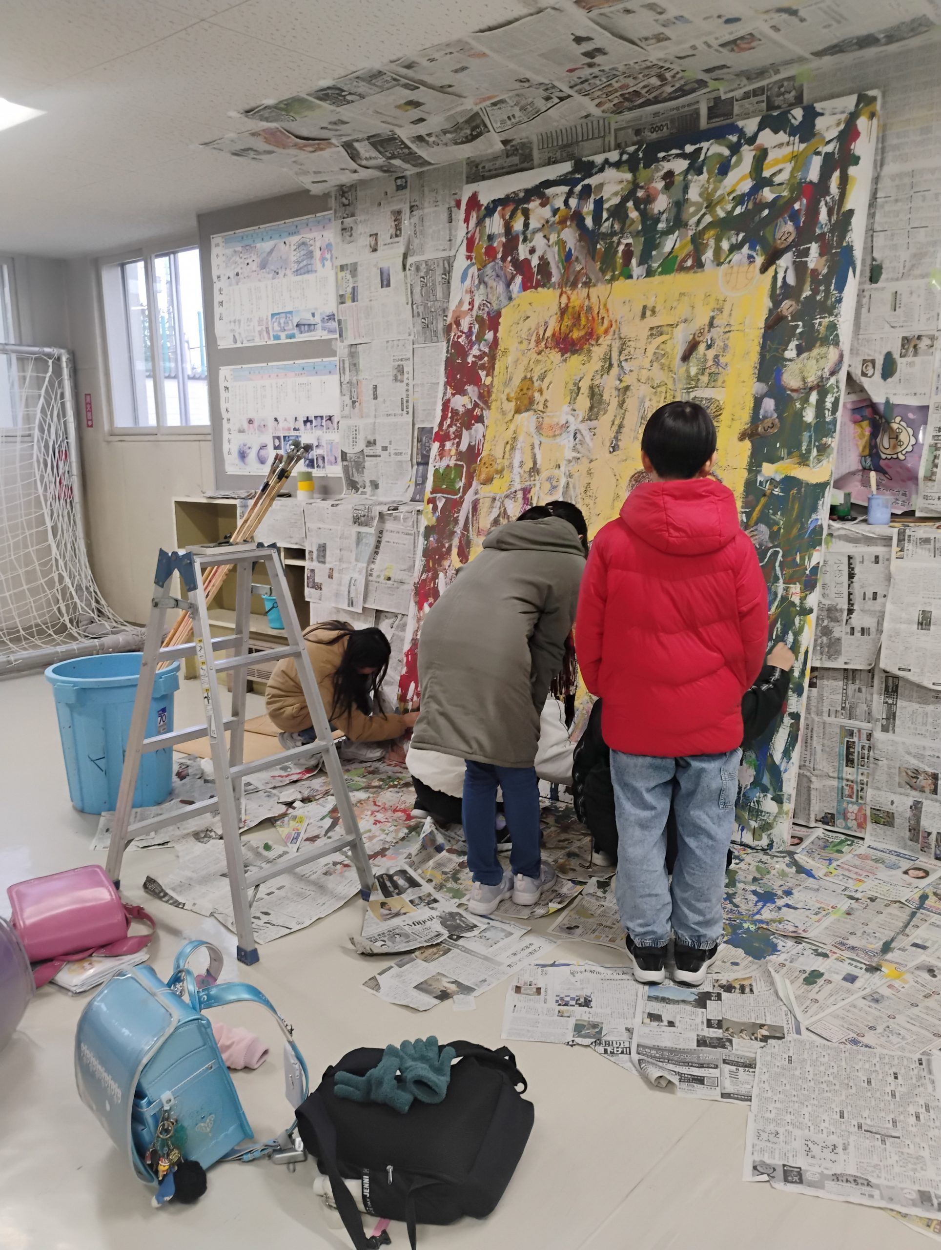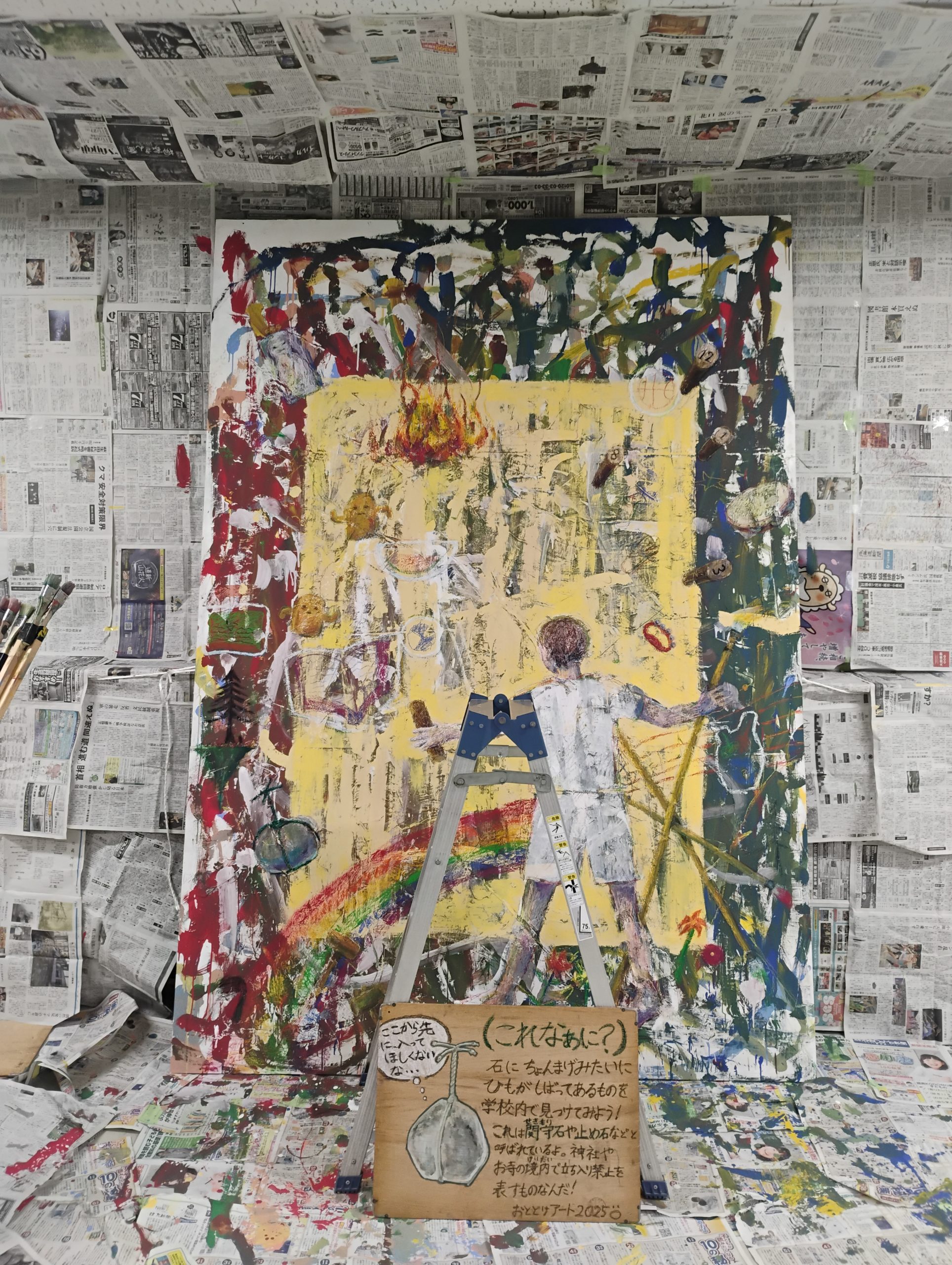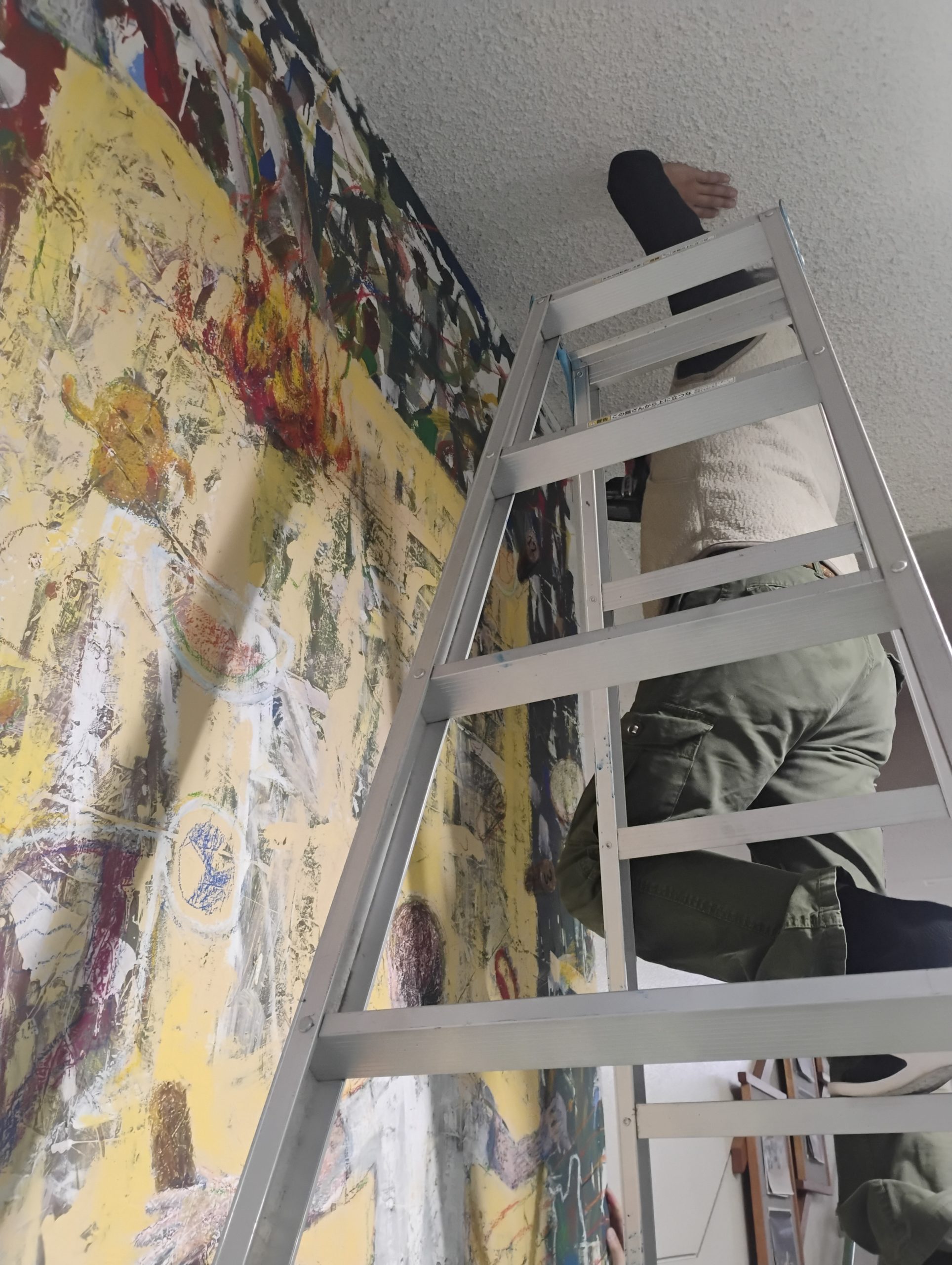 上ノさんは資材の運び込み、舟迫は絵を横にして手が届かなかった上の部分に「編み編み」などすこし描き加え。