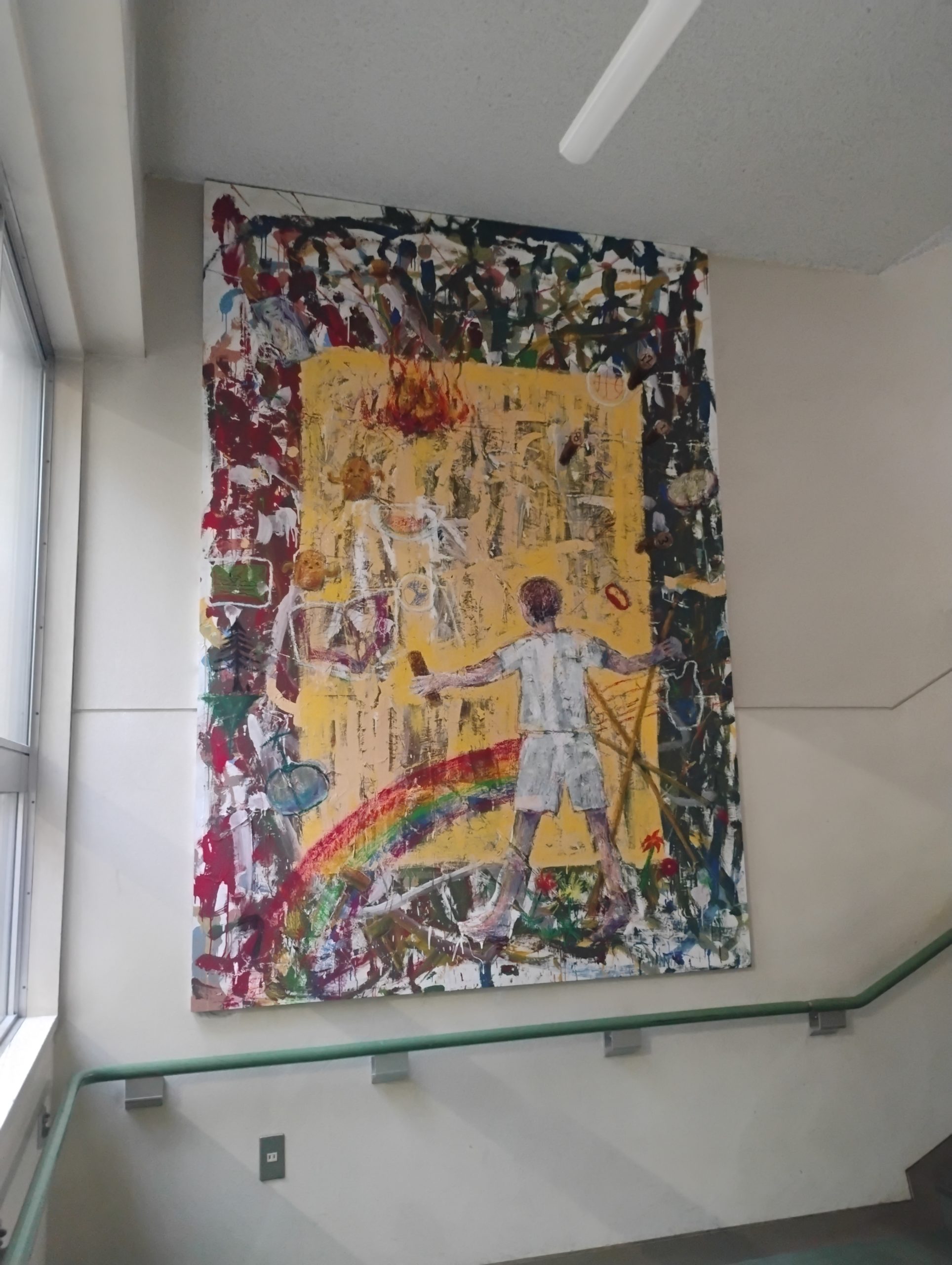 たくさんの子が協力して出来上がった一枚の絵。モルックコートがある「光の庭」も見える1階と2階の間の踊り場に飾られています。