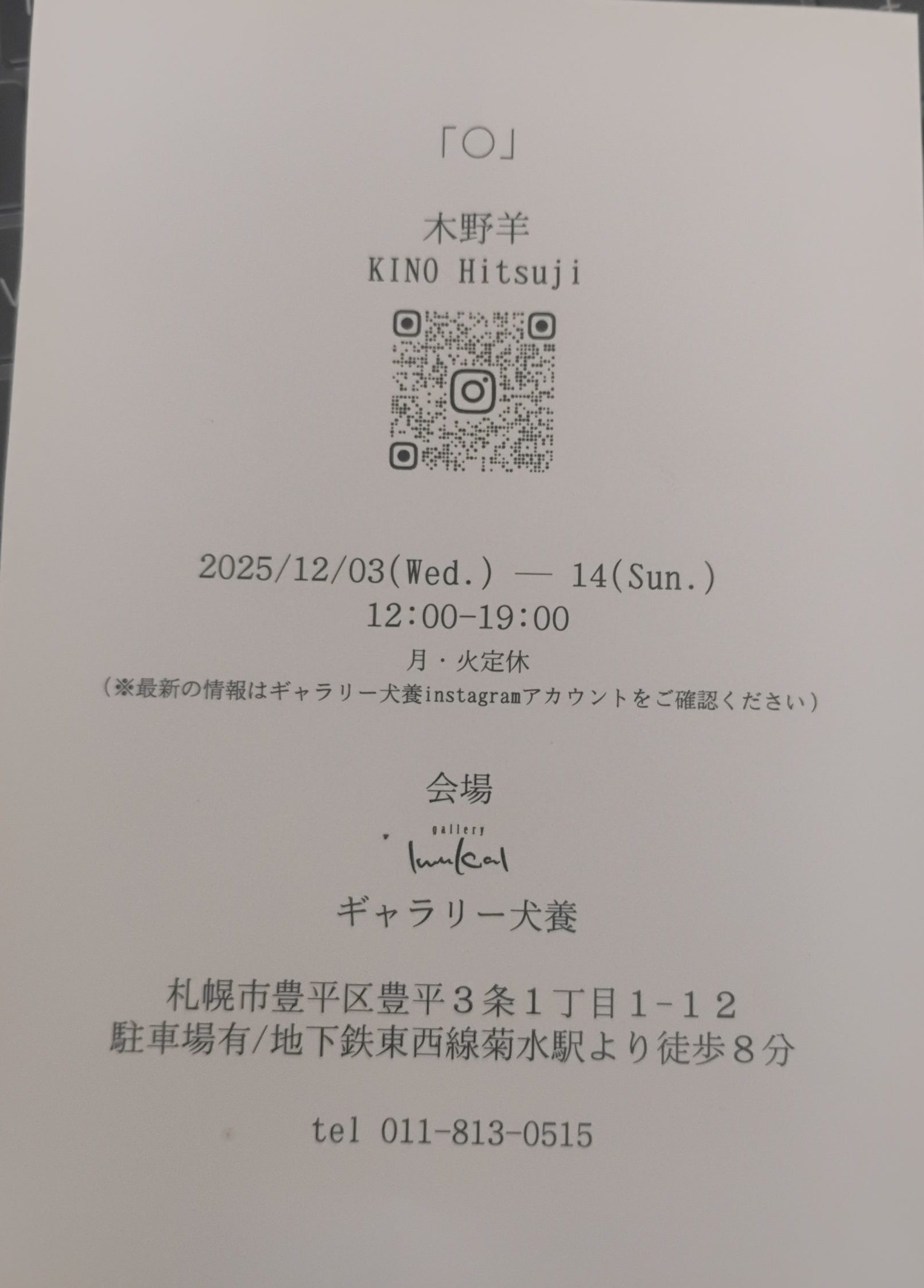 そんな木野さんの展示「◯」はギャラリー犬養さんにて25年12月3日(水)〜15日(月)(※チラシでは14日までですが