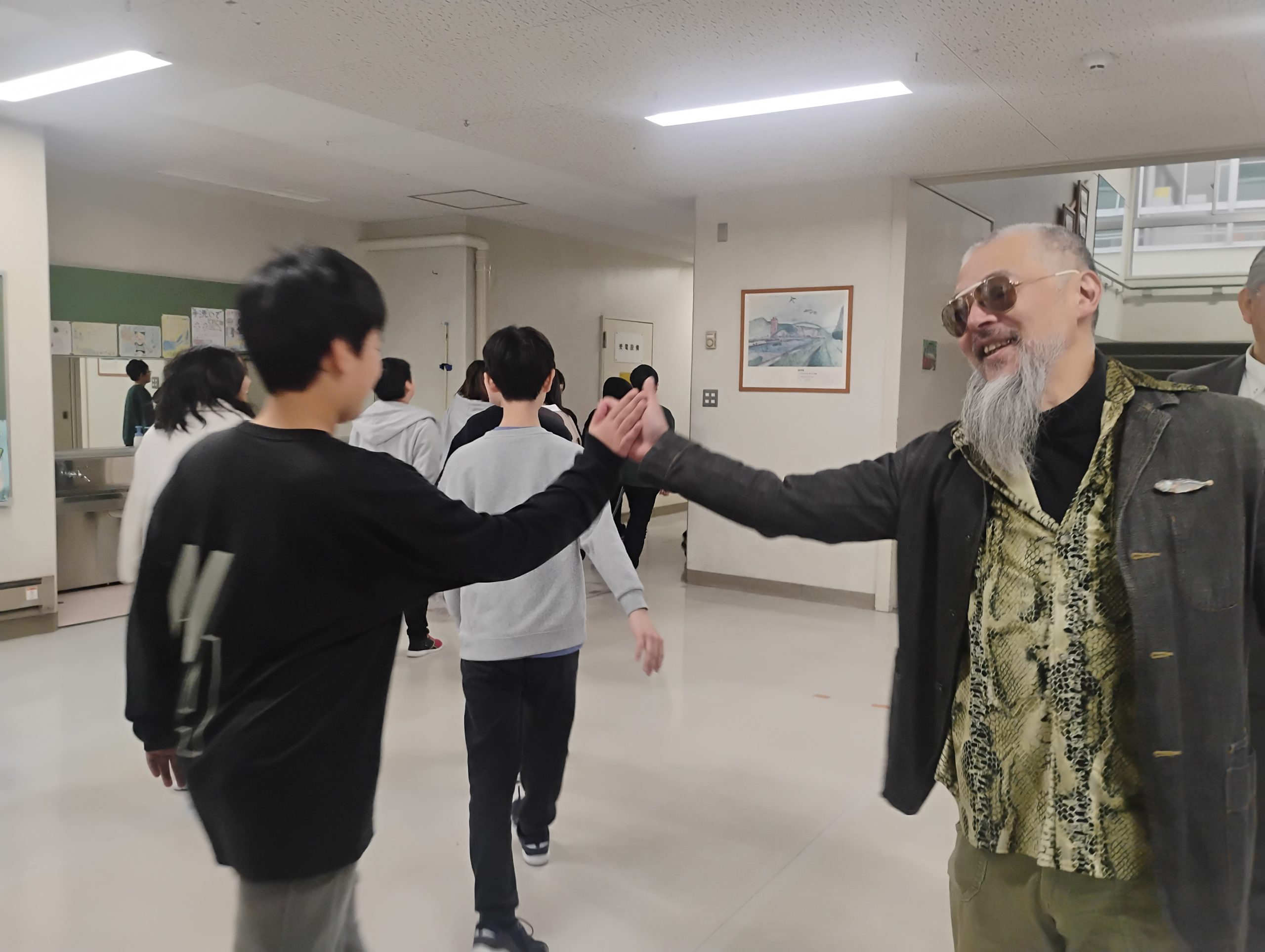 そして生徒たちが体育館からそれぞれの教室へ戻るときも、廊下でみんなとハイタッチ!