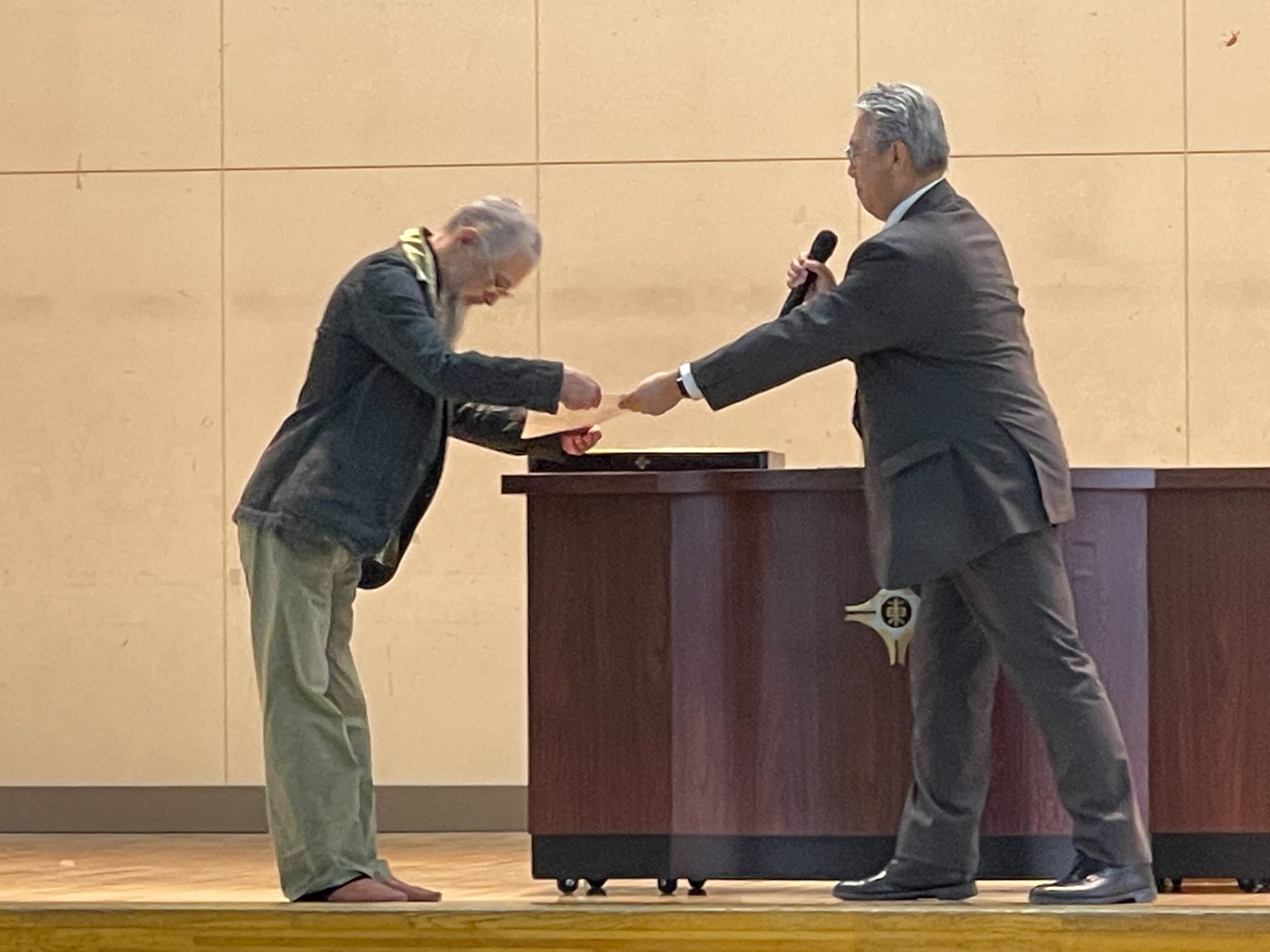 校長先生に呼ばれ、壇上にあがります。いつもと違ってやや緊張している上ノさん。