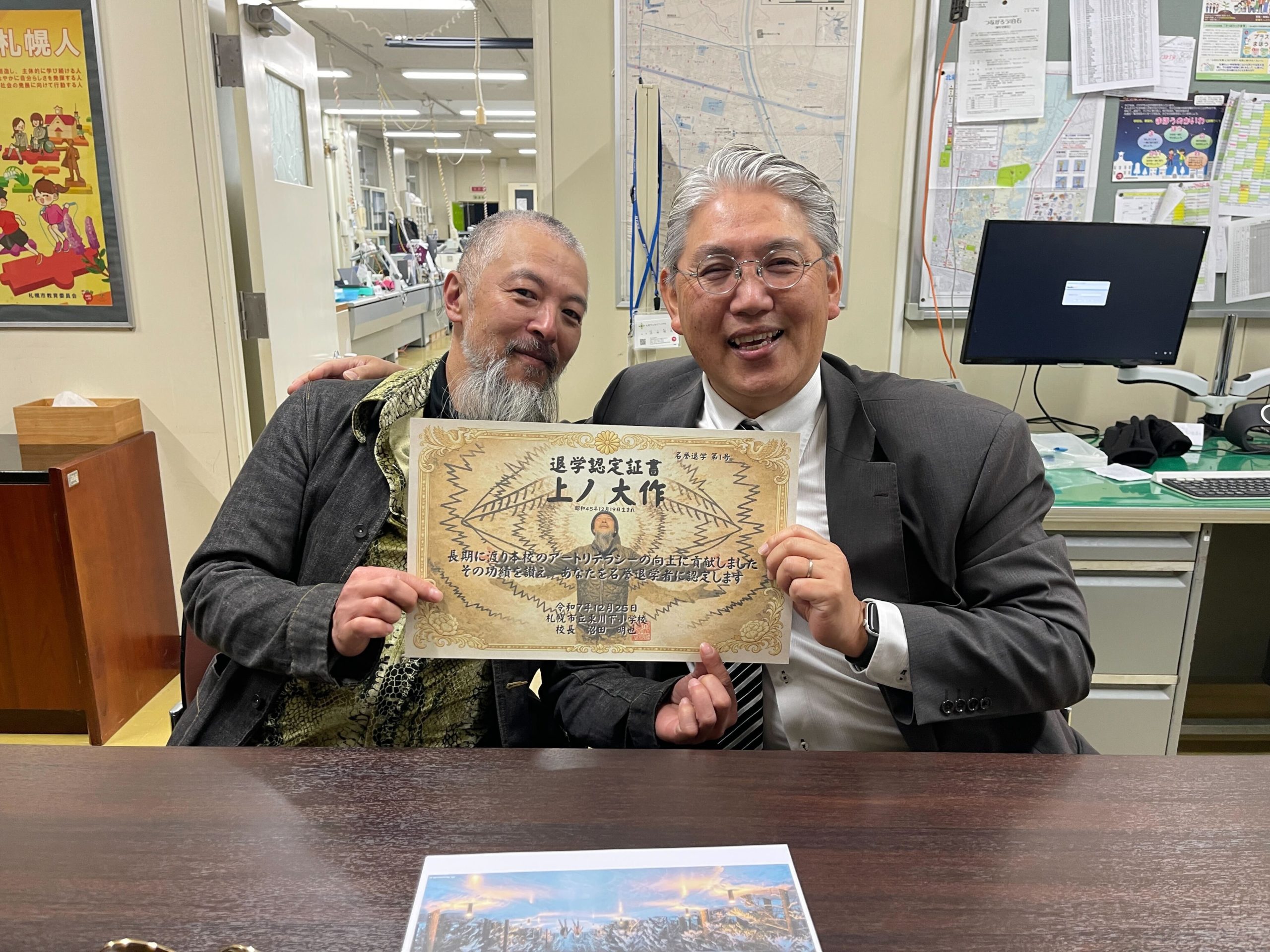校長室へ戻り、上ノさんと校長先生で記念写真。