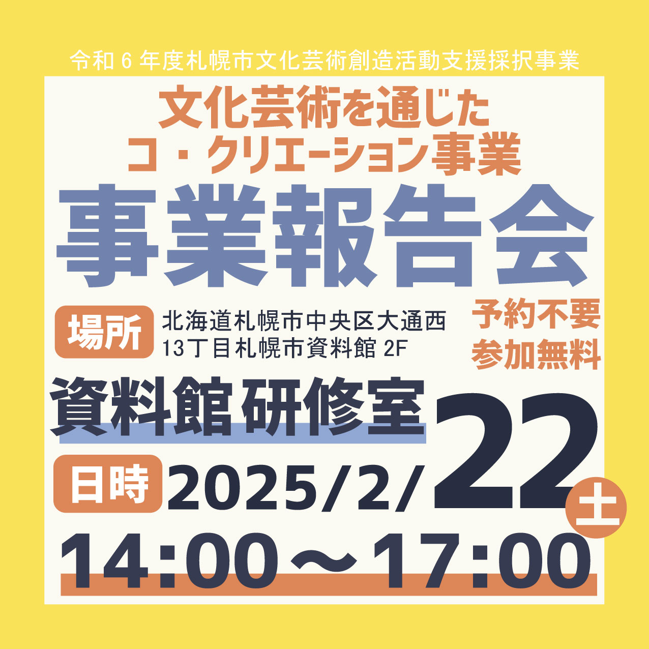 令和6年度札幌市創造活動支援事業 文化芸術活動を通じたコ・クリエーション事業 報告会 by AISプランニング 内容: 本事業では、令和6年度において、文化芸術活動を通じたコ・クリエーション事業として、アーティストによ … 続きを読む 【2/22(土)】文化芸術活動を通じたコ・クリエーション事業【事業報告会】