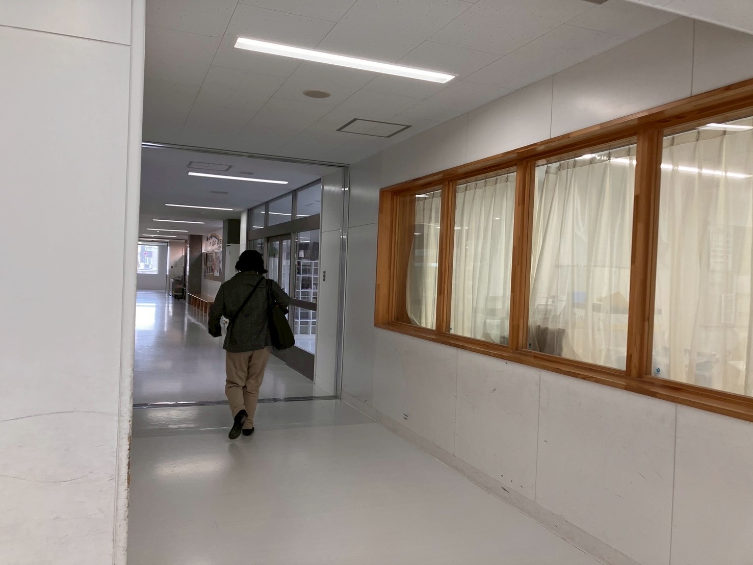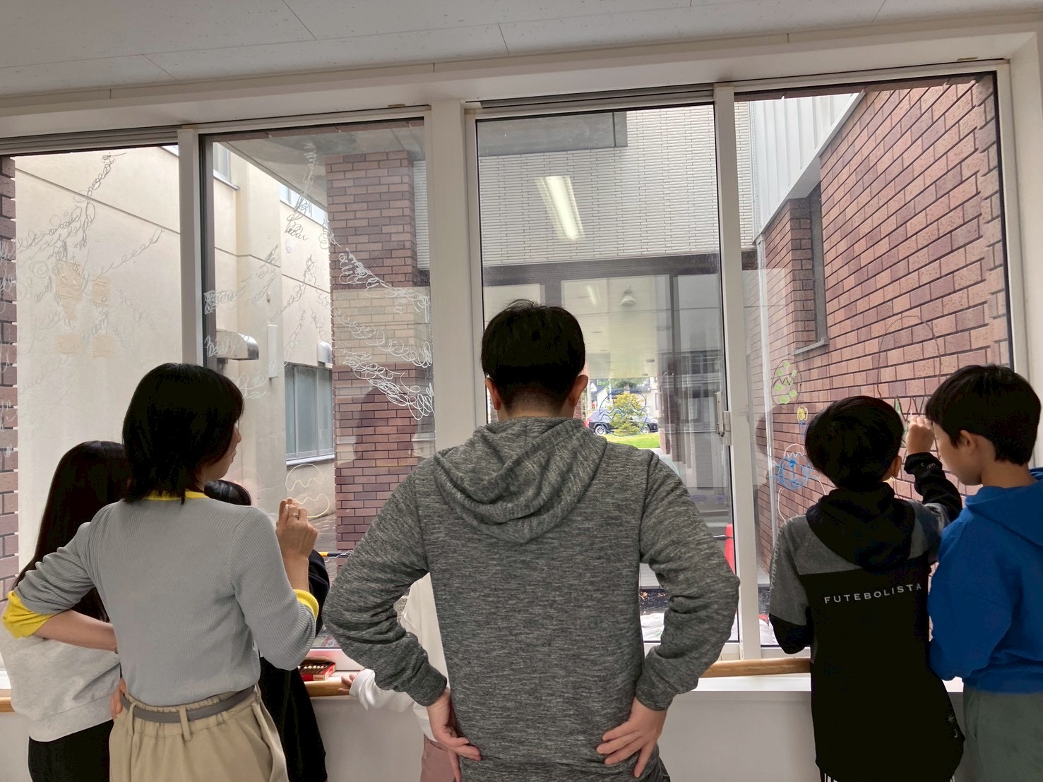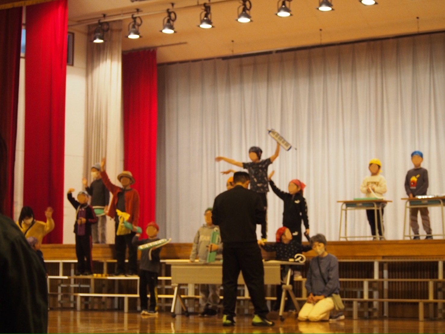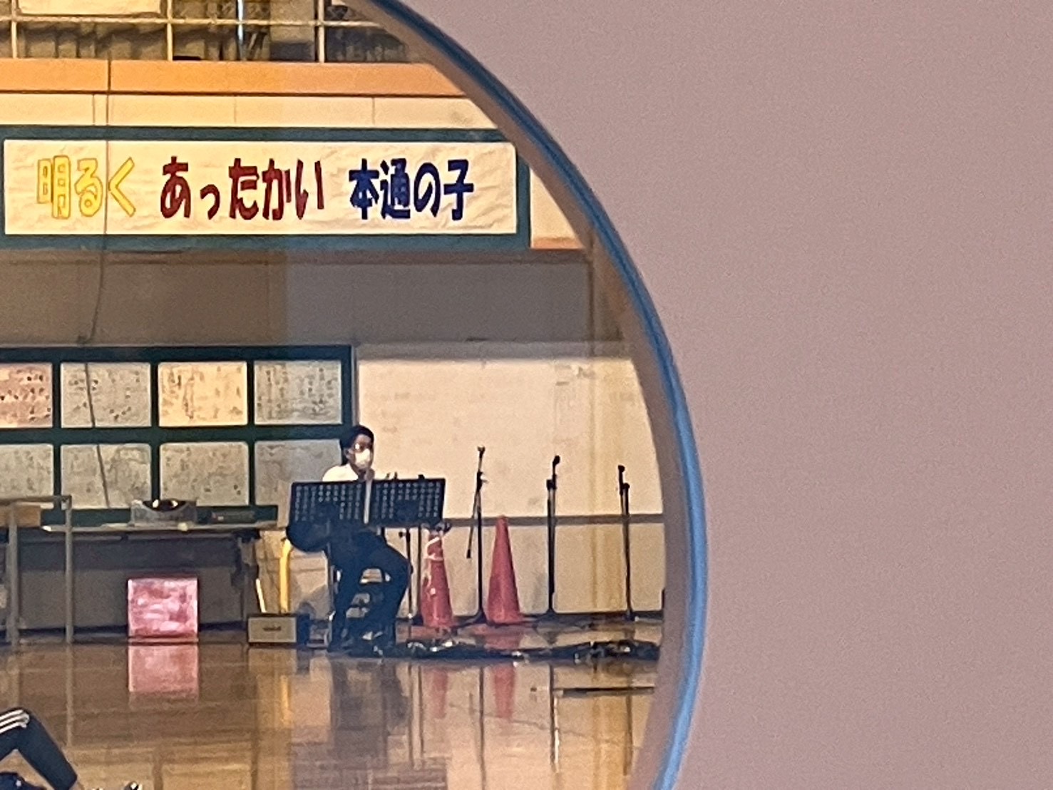 中休みの前に一階に降りていくと、子どもたちが廊下を行ったり来たりしている。ホール前に待機している子どもたちが見えた。