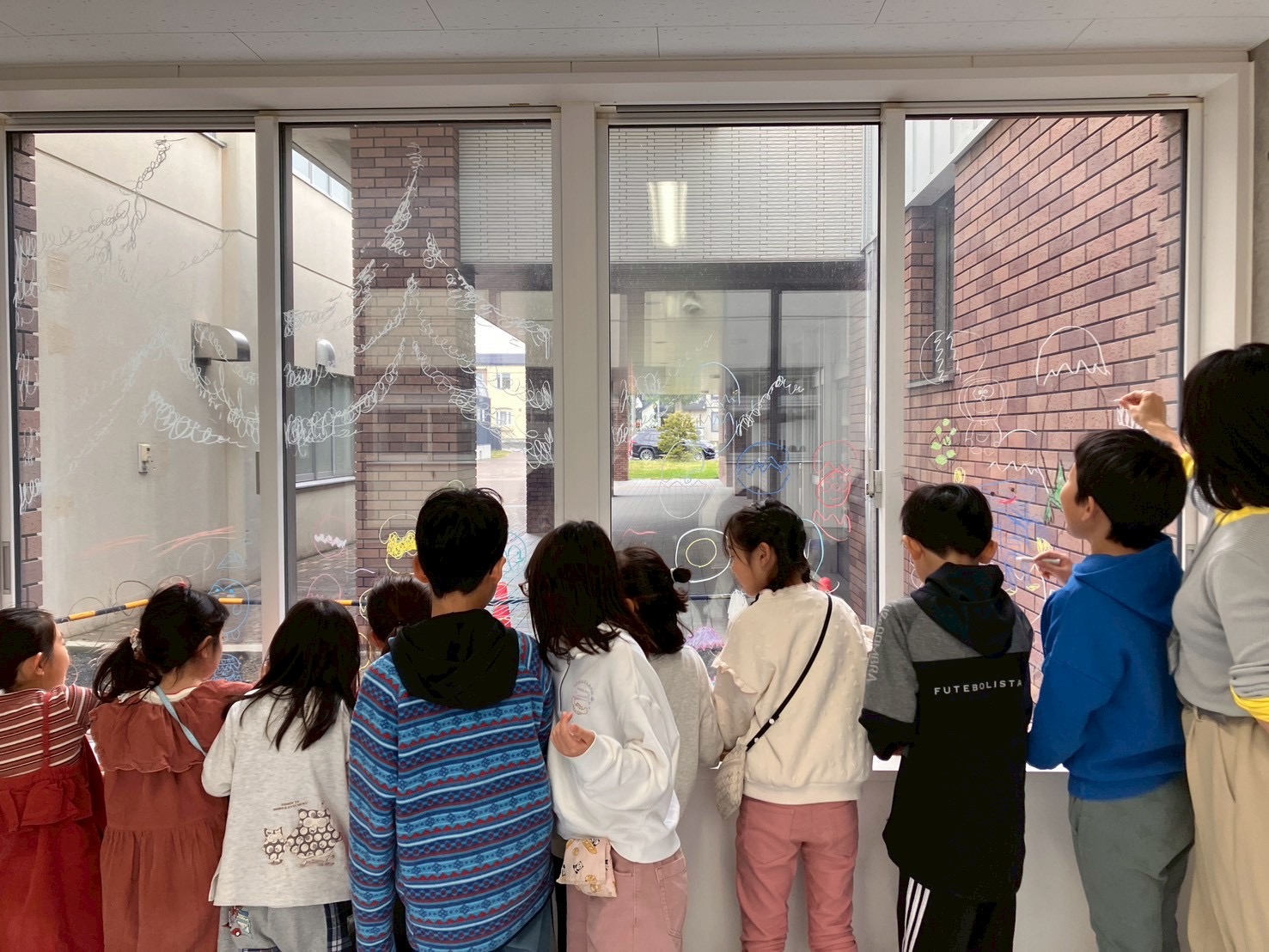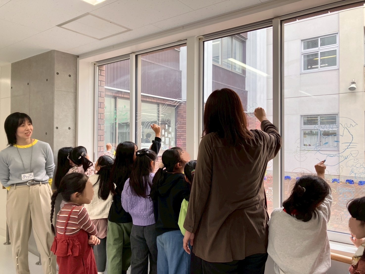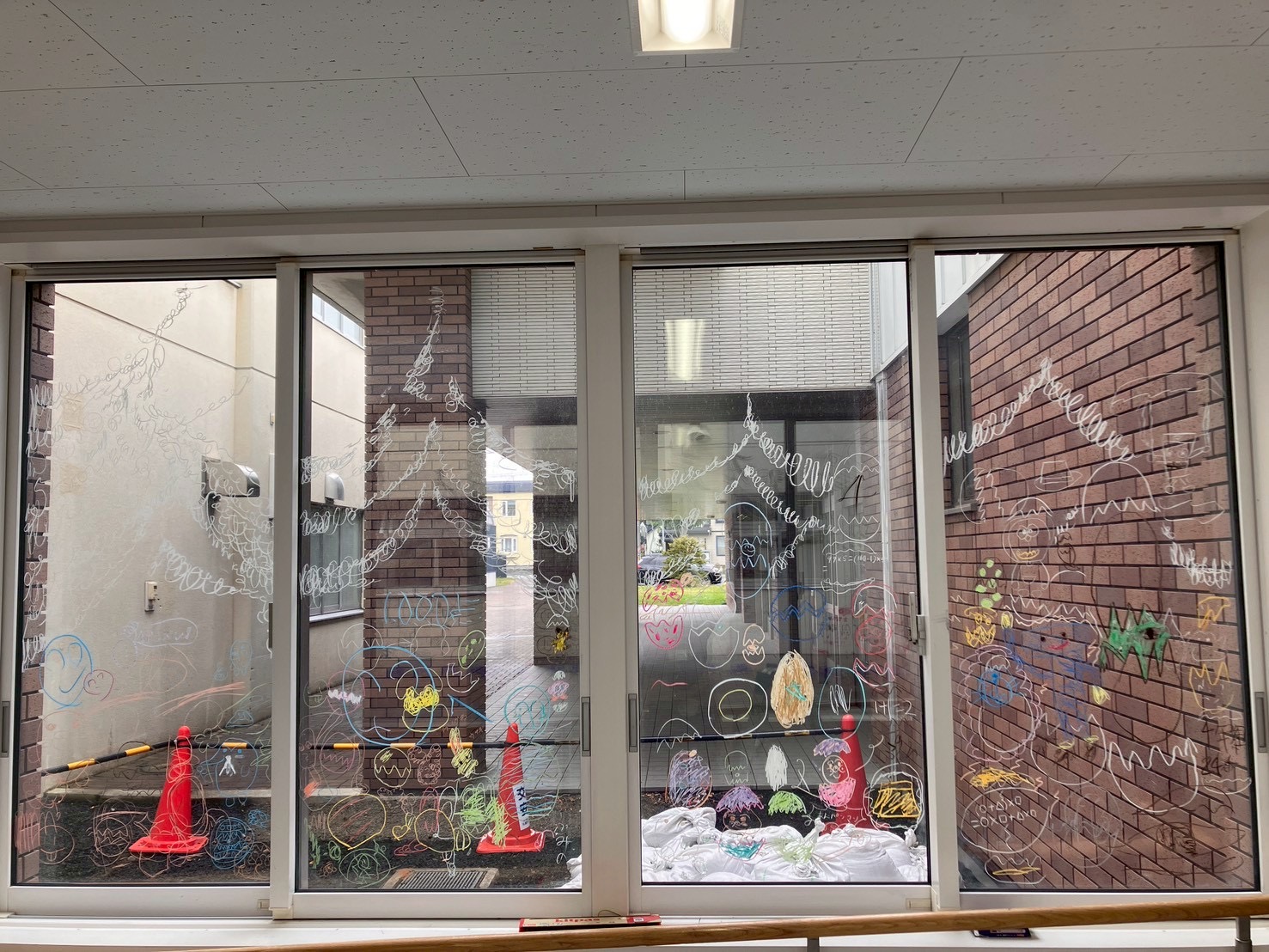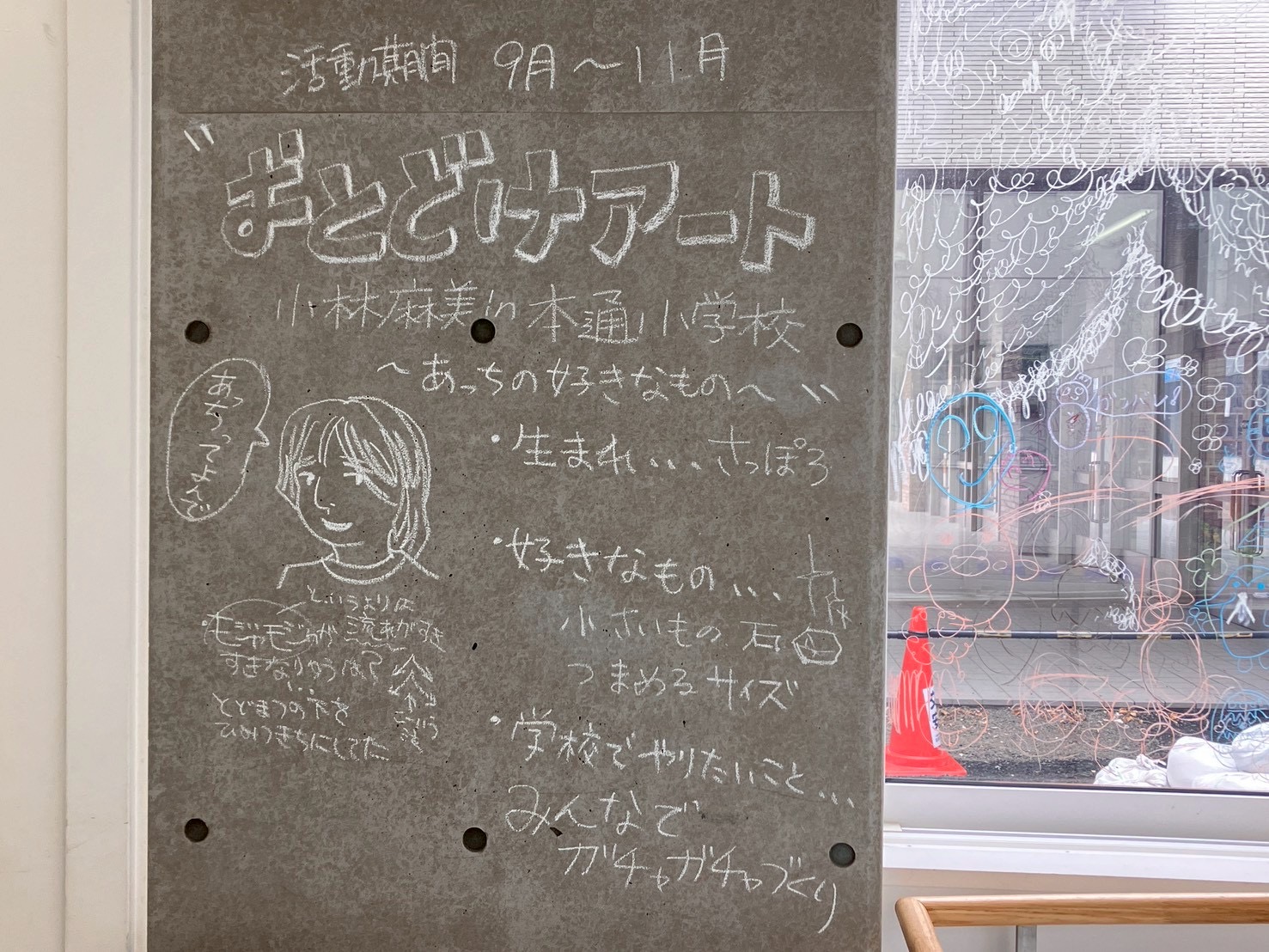 「あっち」ことアーティスト小林麻美さんの、おとどけアート7日目の活動模様は、発表会のために準備する子どもたちとキットパスで「まどクレヨン」のお絵描きと、広がる壁画!