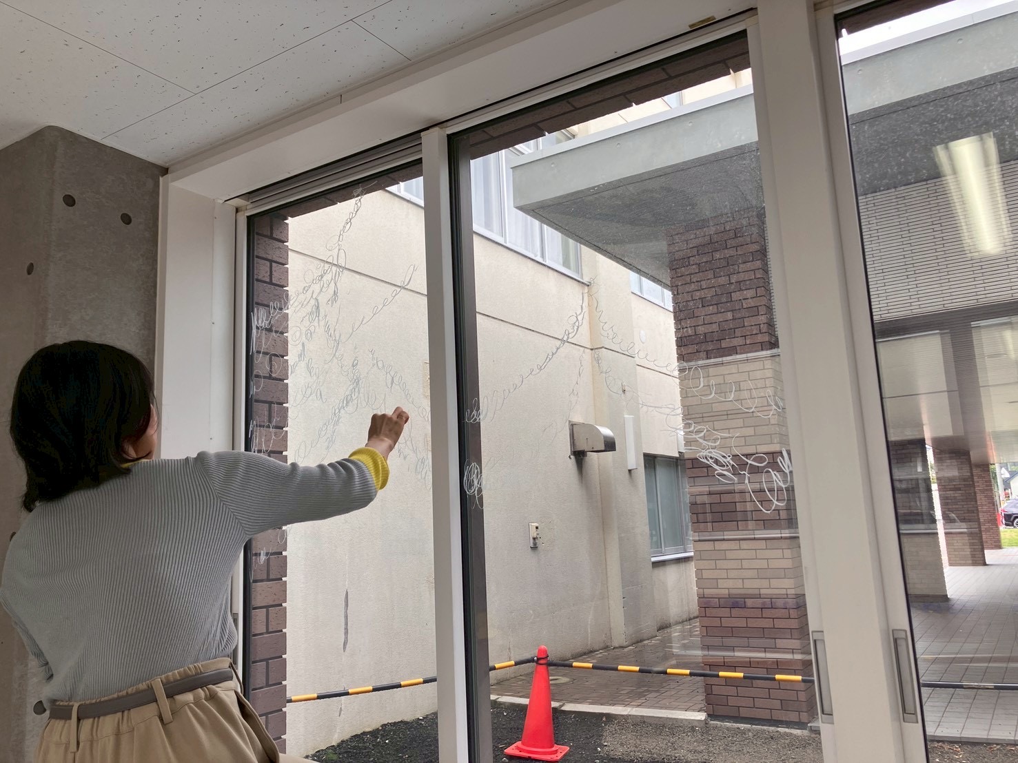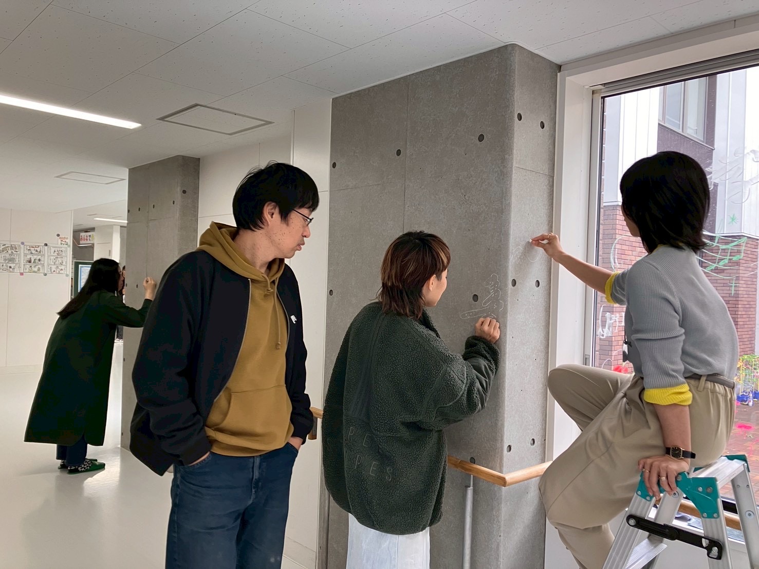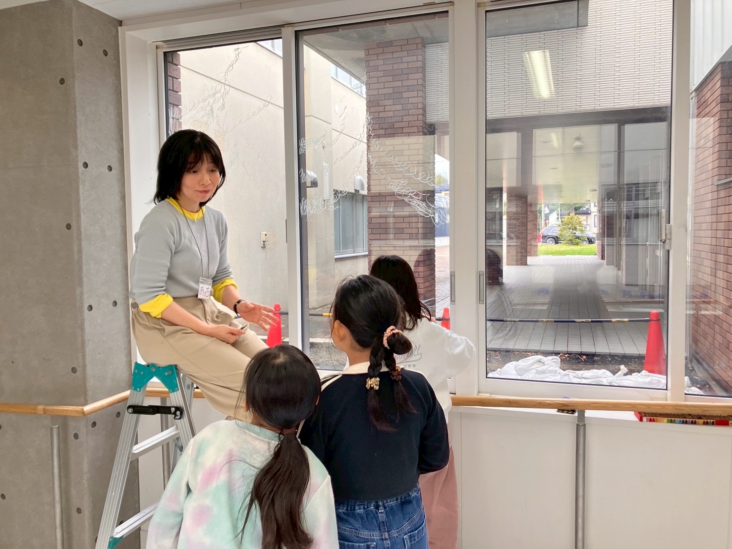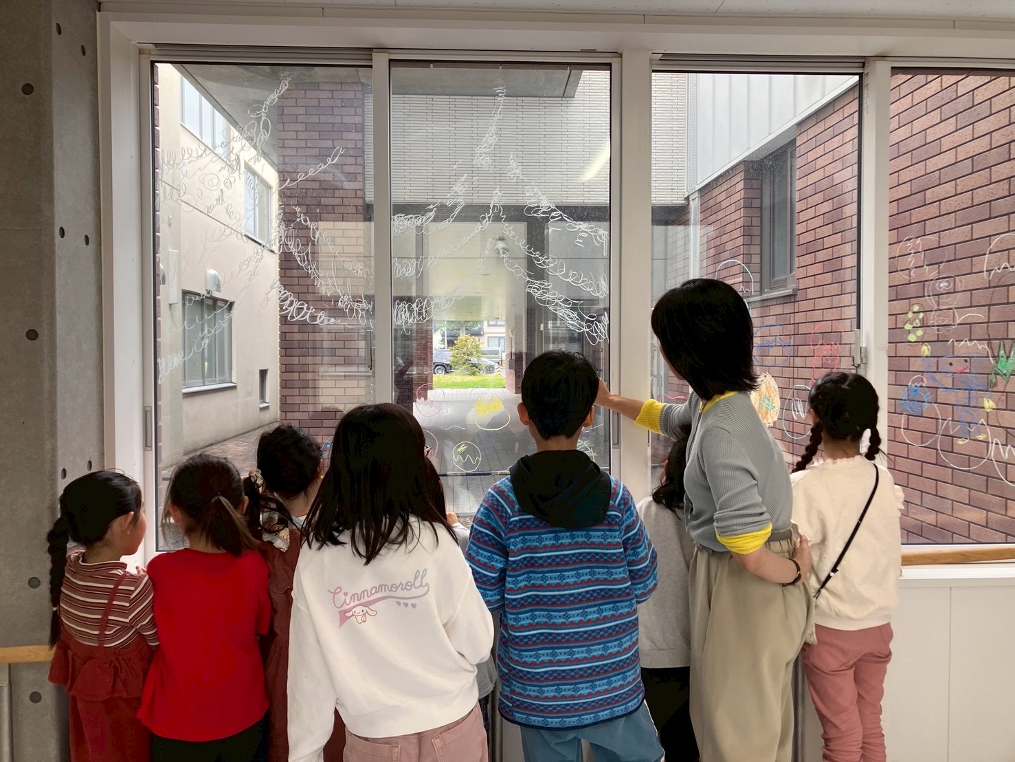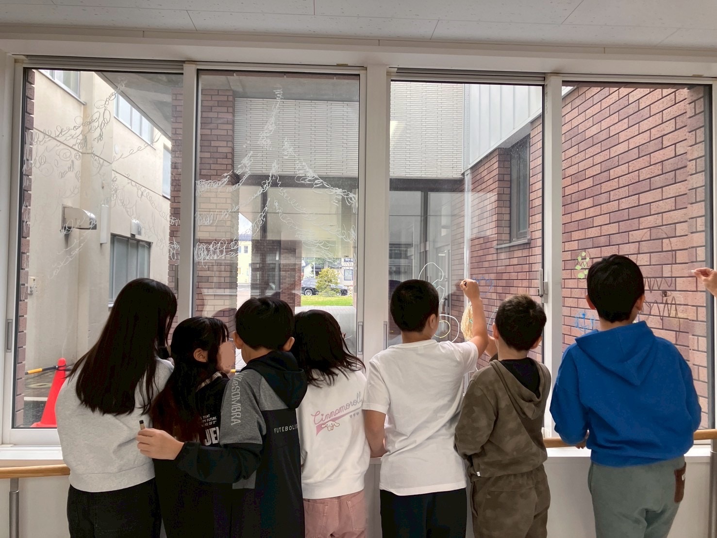 「あっち」ことアーティスト小林麻美さんの、おとどけアート7日目の活動模様は、発表会のために準備する子どもたちとキットパスで「まどクレヨン」のお絵描きと、広がる壁画!