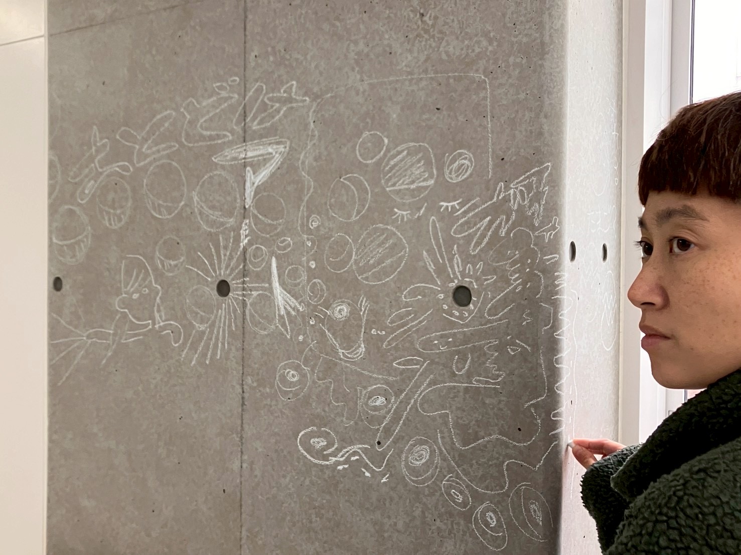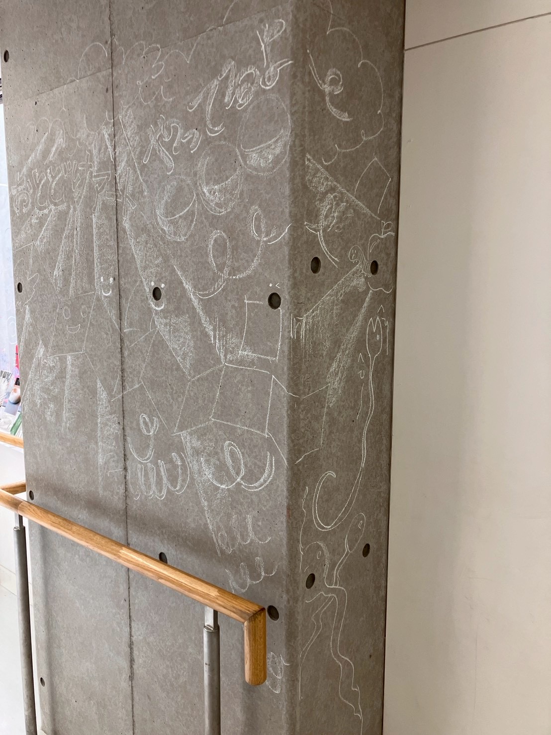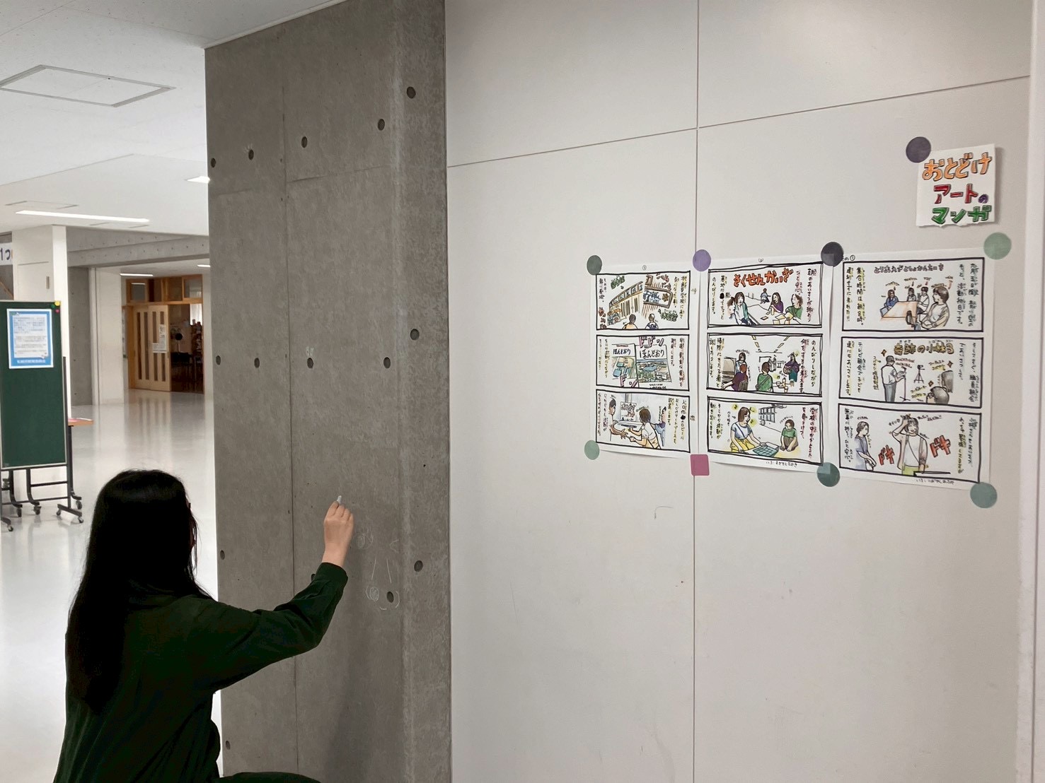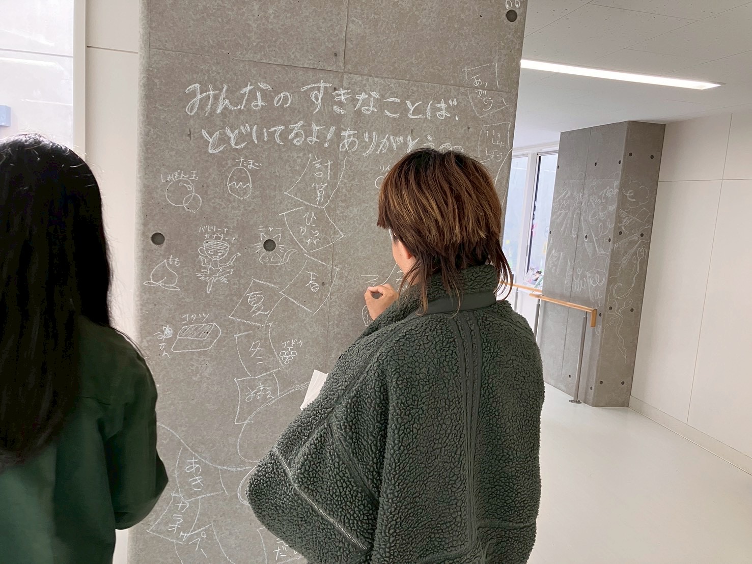 「あっち」ことアーティスト小林麻美さんの、おとどけアート7日目の活動模様は、発表会のために準備する子どもたちとキットパスで「まどクレヨン」のお絵描きと、広がる壁画!