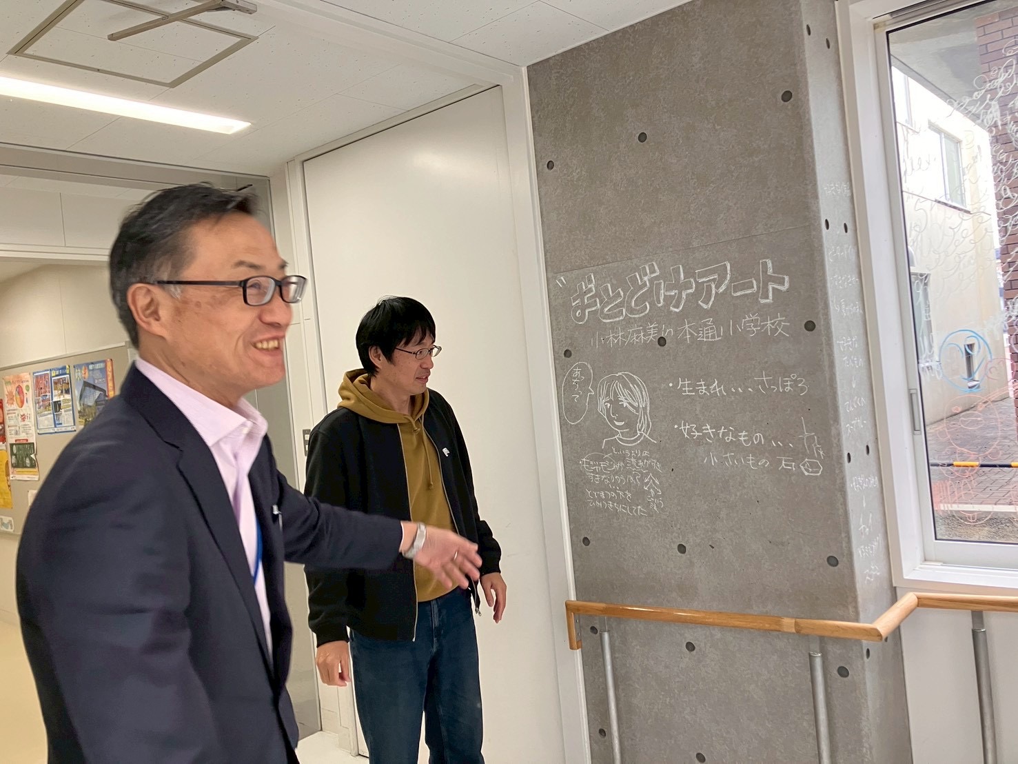 本通小学校のおとどけアートに初参加のベーさんに、ひかりさんがこれまでどんなすきなことばがポストに入っていたか、ガイド。