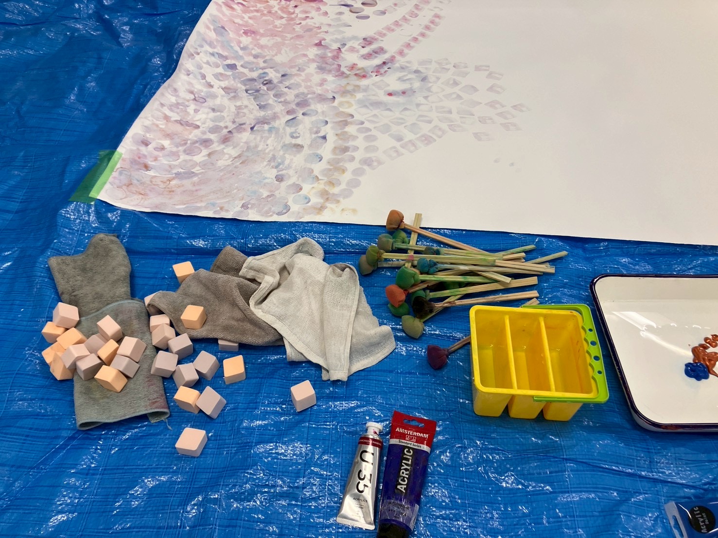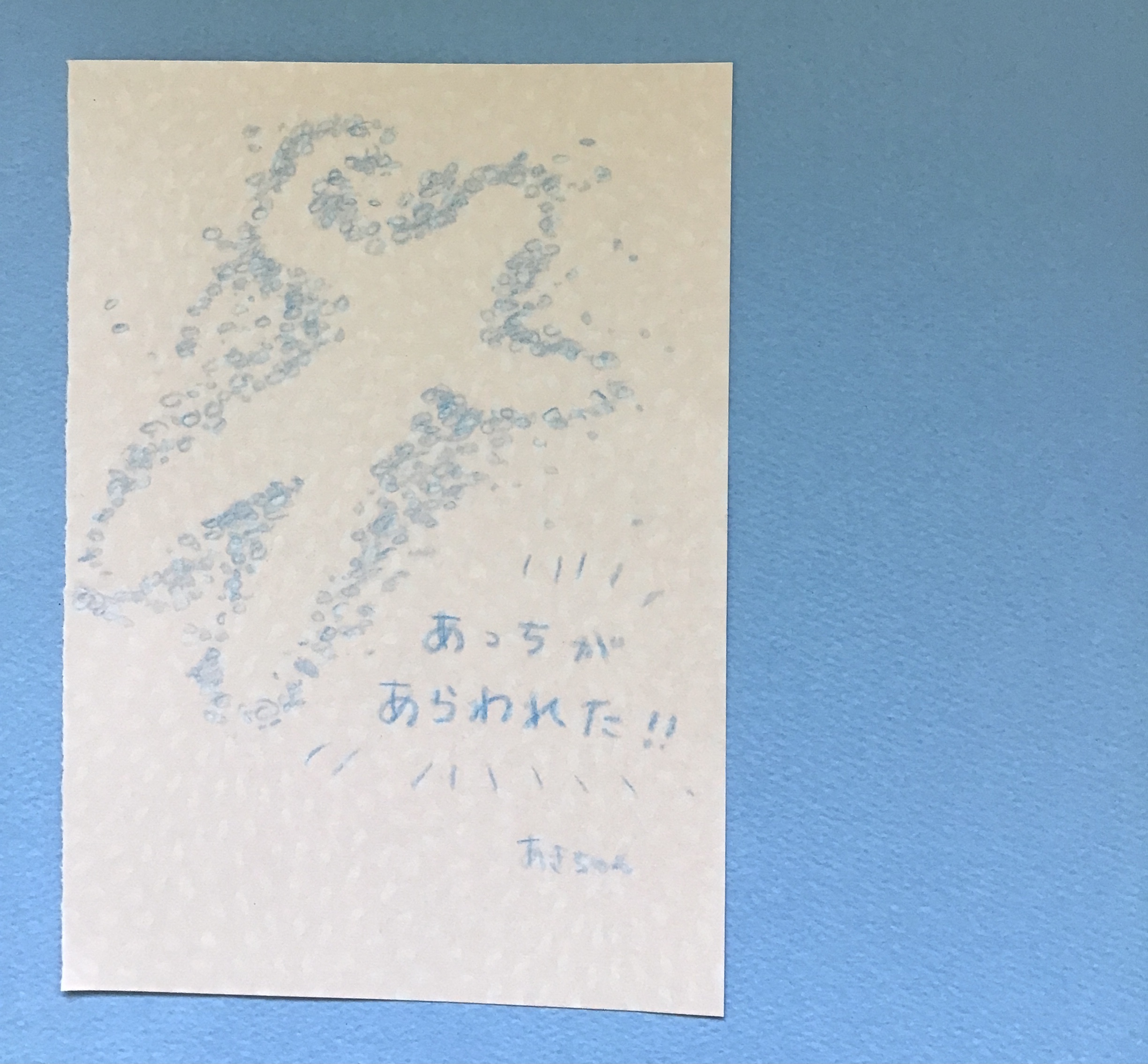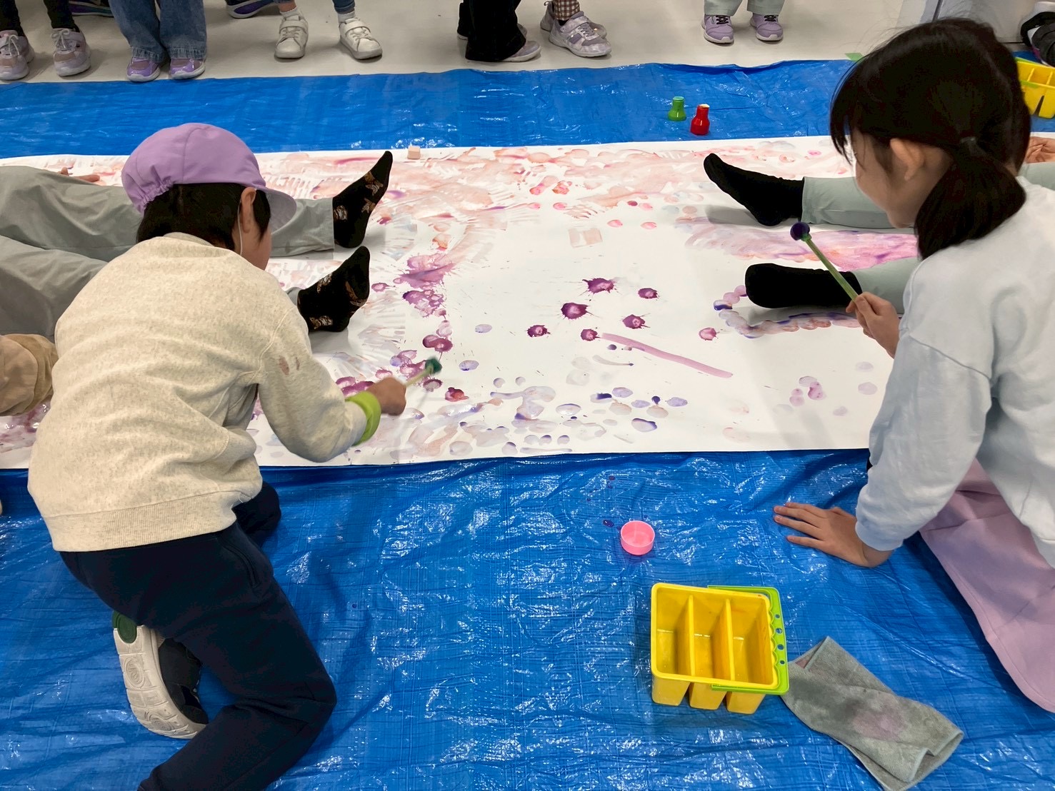 本日のおとどけアートは、巻紙の宇宙を遊泳をするあっちとひかりさんの、「お絵描き屋」のポンポンスポンジ画。ガチャの準備など。