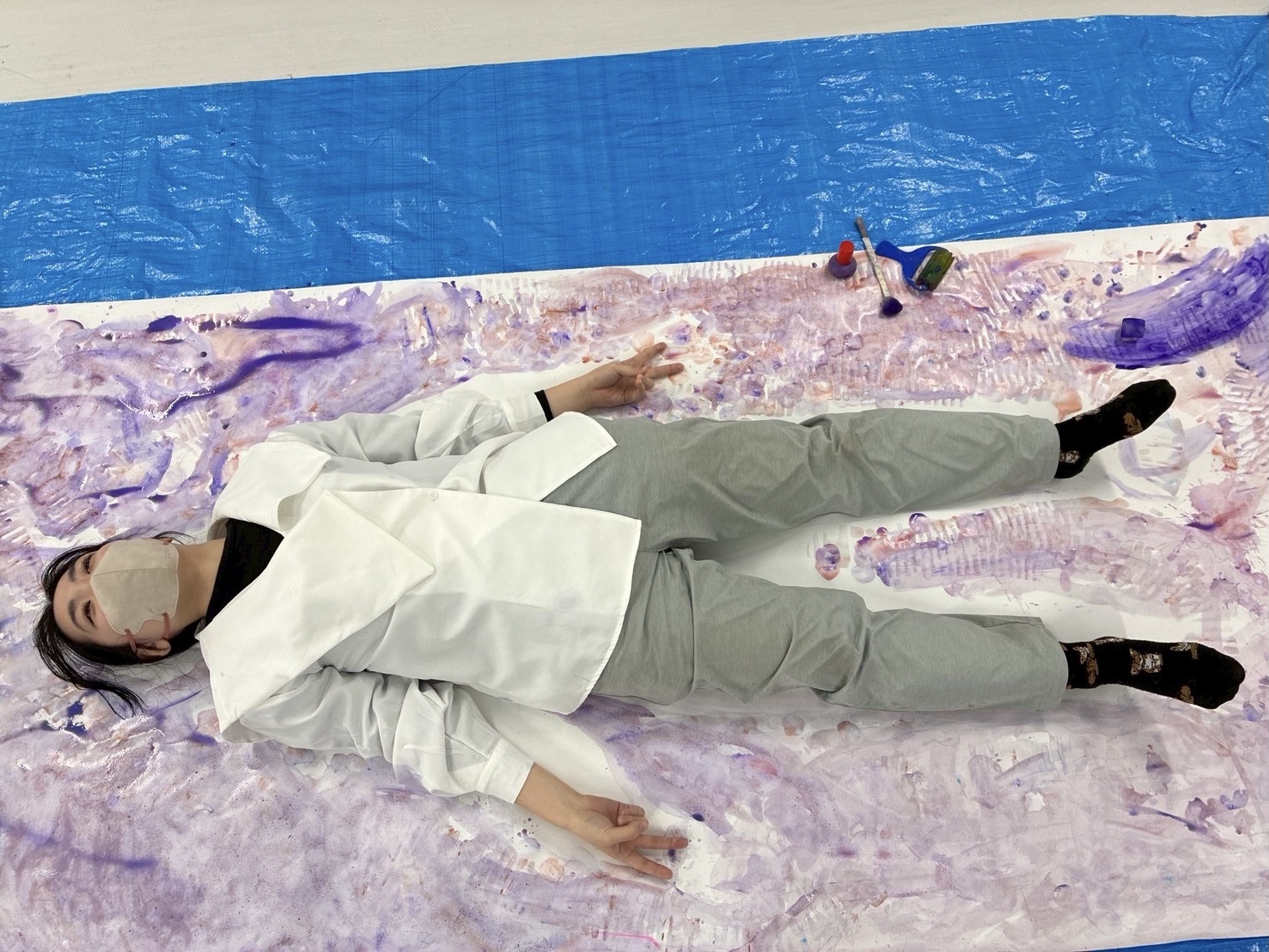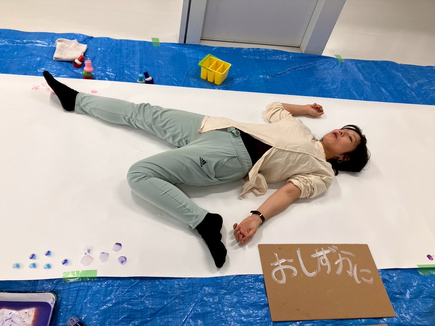 白い服に着替えたひかりさんとあっちが登場。紙の上に寝て待ちます。
