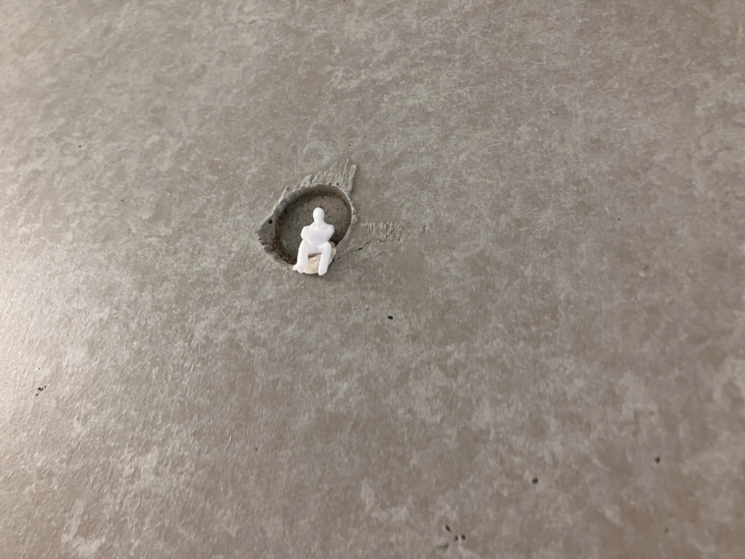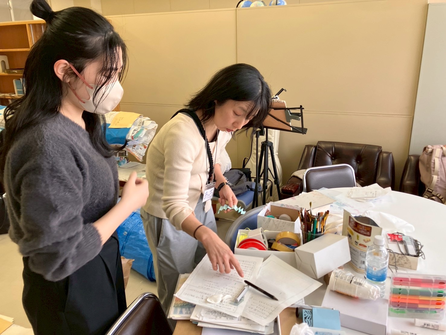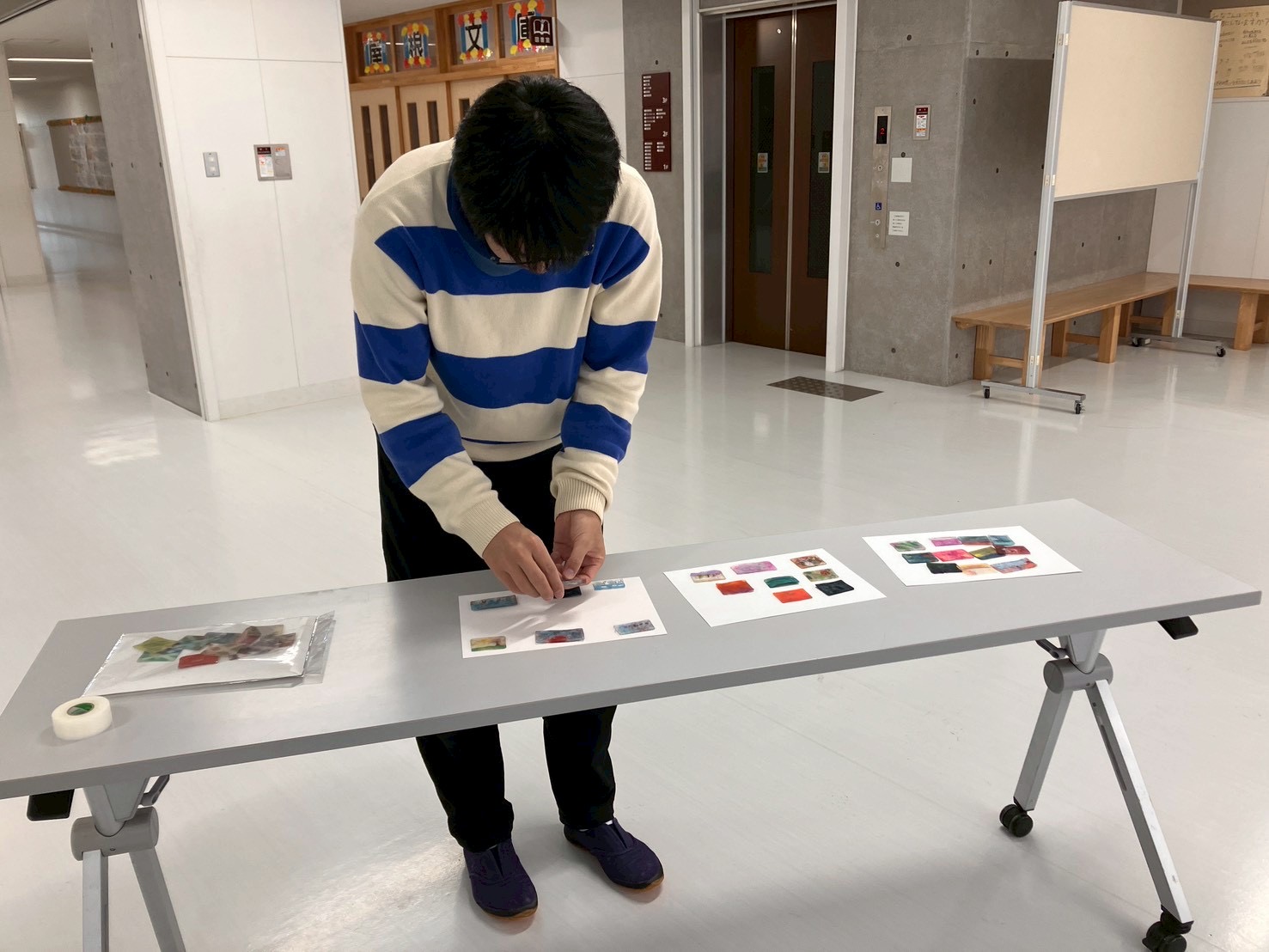 本日は、AISコーディネーター三本の矢の一人である漆崇博氏と、アートの勉強されている学生さんが見学に。お二人が手に持っているのは、例の小さなものたち。