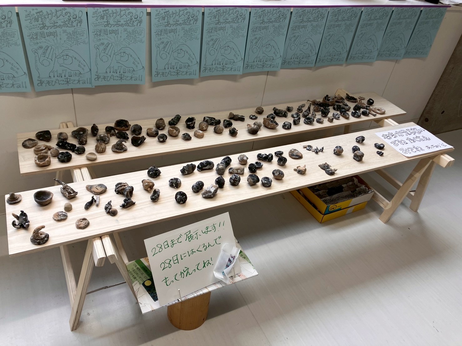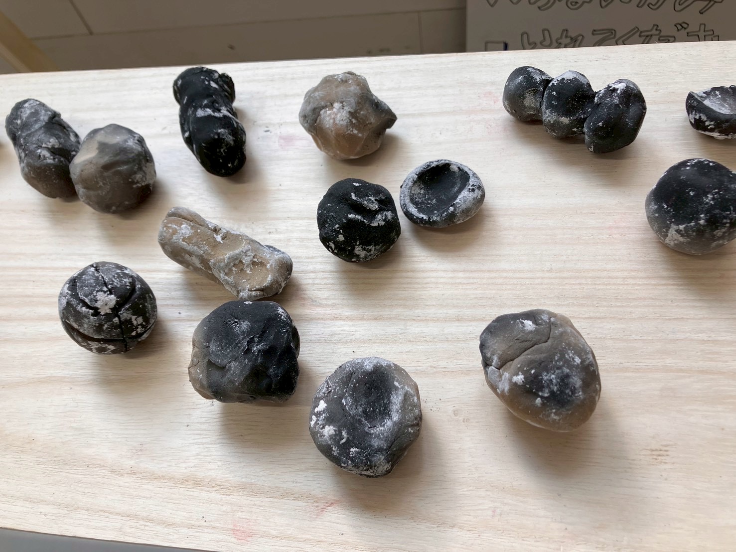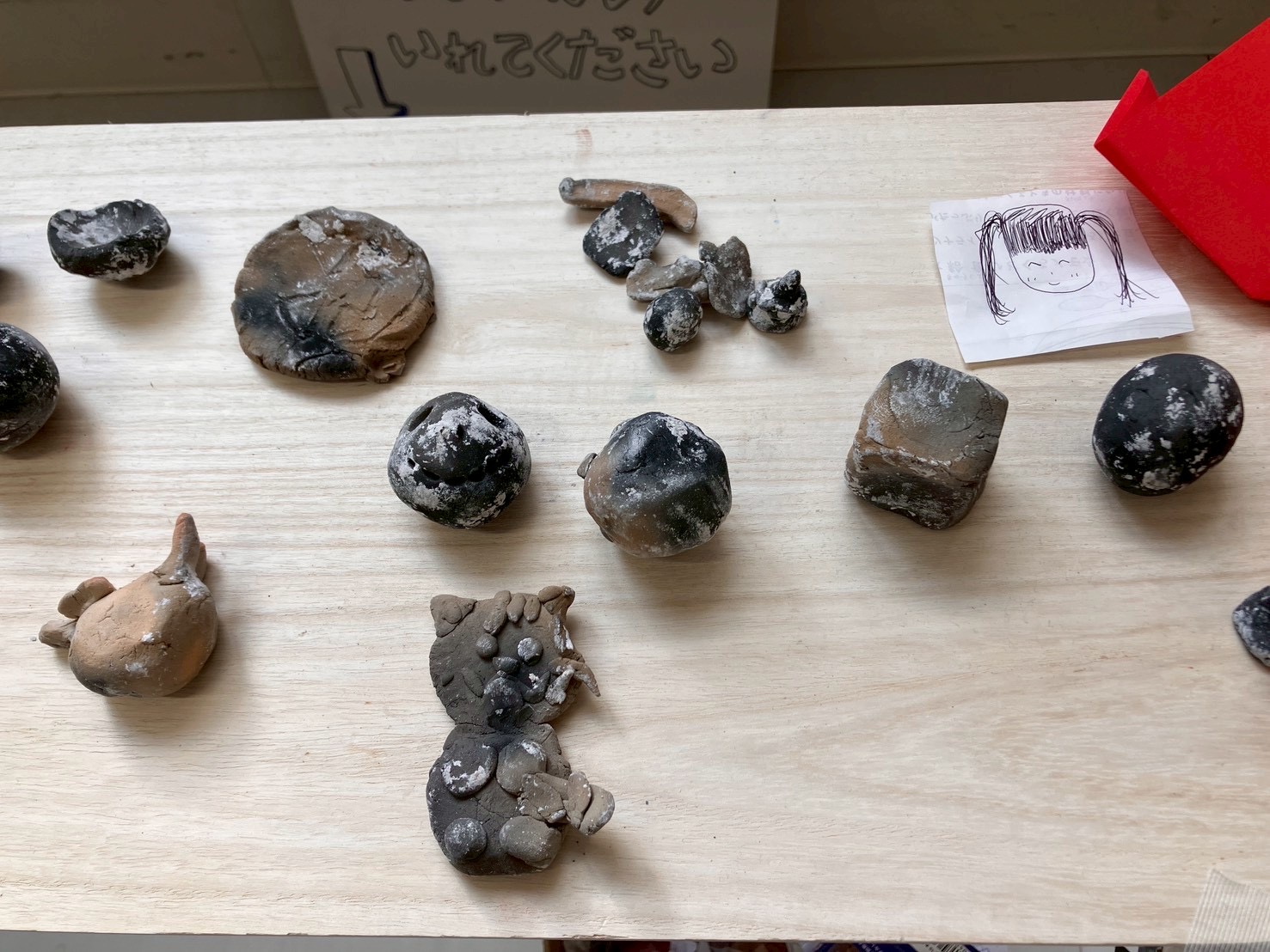 「おねんどBAR」で作っていた小さなものも、上ノ大作さんの東川下小の廃屋となったうさぎ小屋で野焼きしてもらって、出来上がったばかり。まだ灰を被っている小さなものたちを、明るい白木の板の上にコロンコロンと並べて行く。