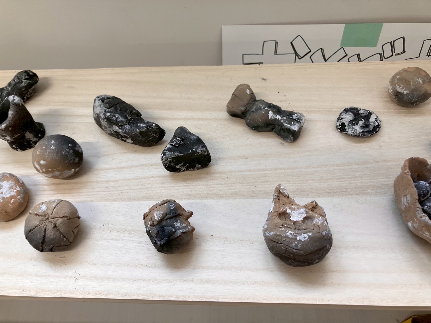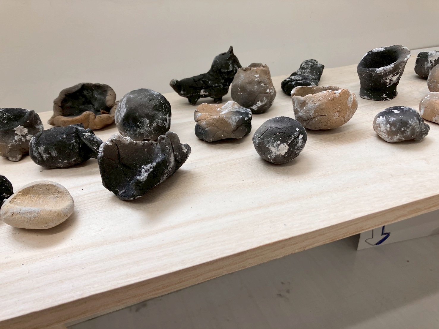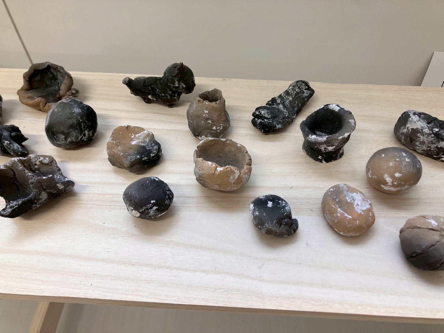 「おねんどBAR」で作っていた小さなものも、上ノ大作さんの東川下小の廃屋となったうさぎ小屋で野焼きしてもらって、出来上がったばかり。まだ灰を被っている小さなものたちを、明るい白木の板の上にコロンコロンと並べて行く。