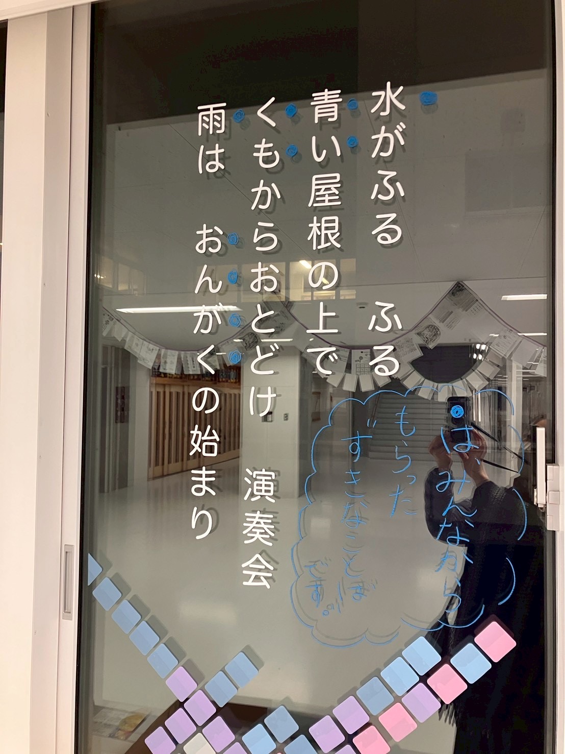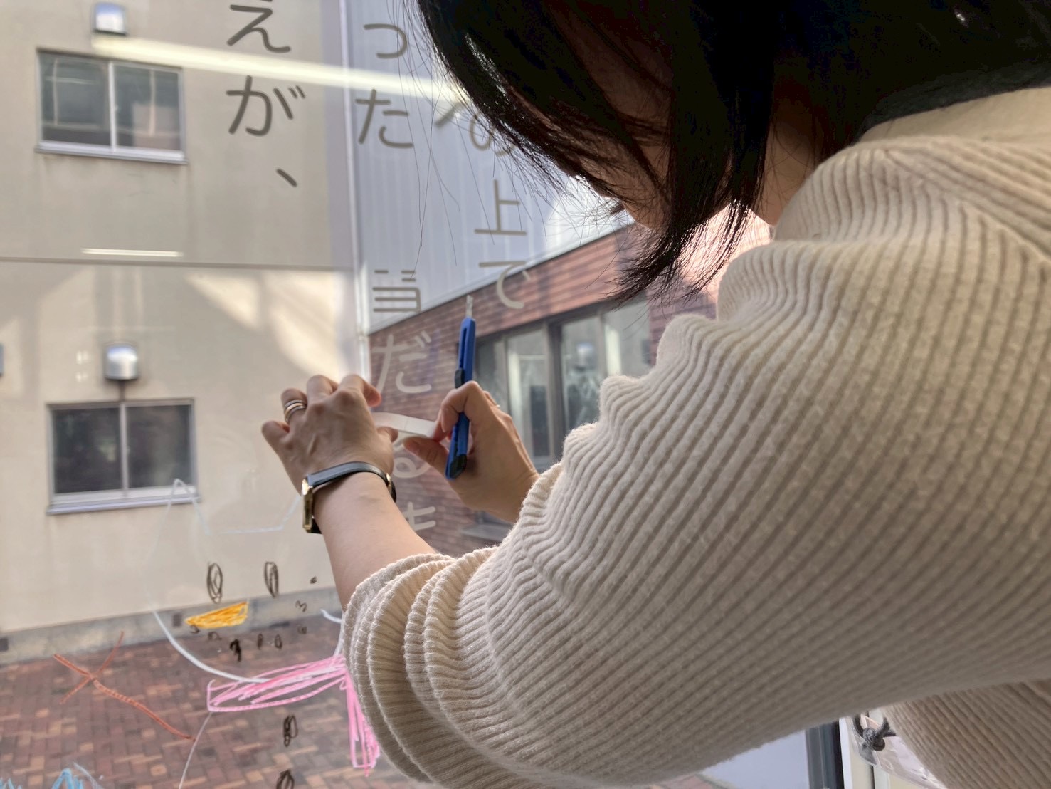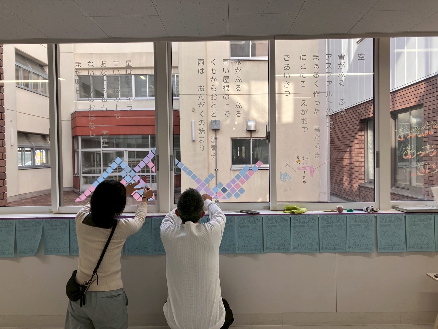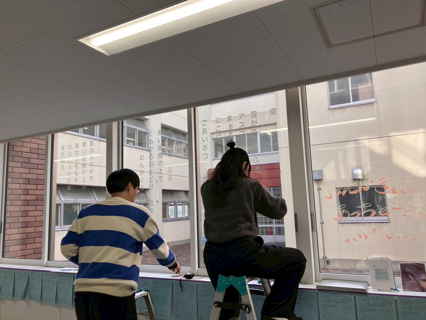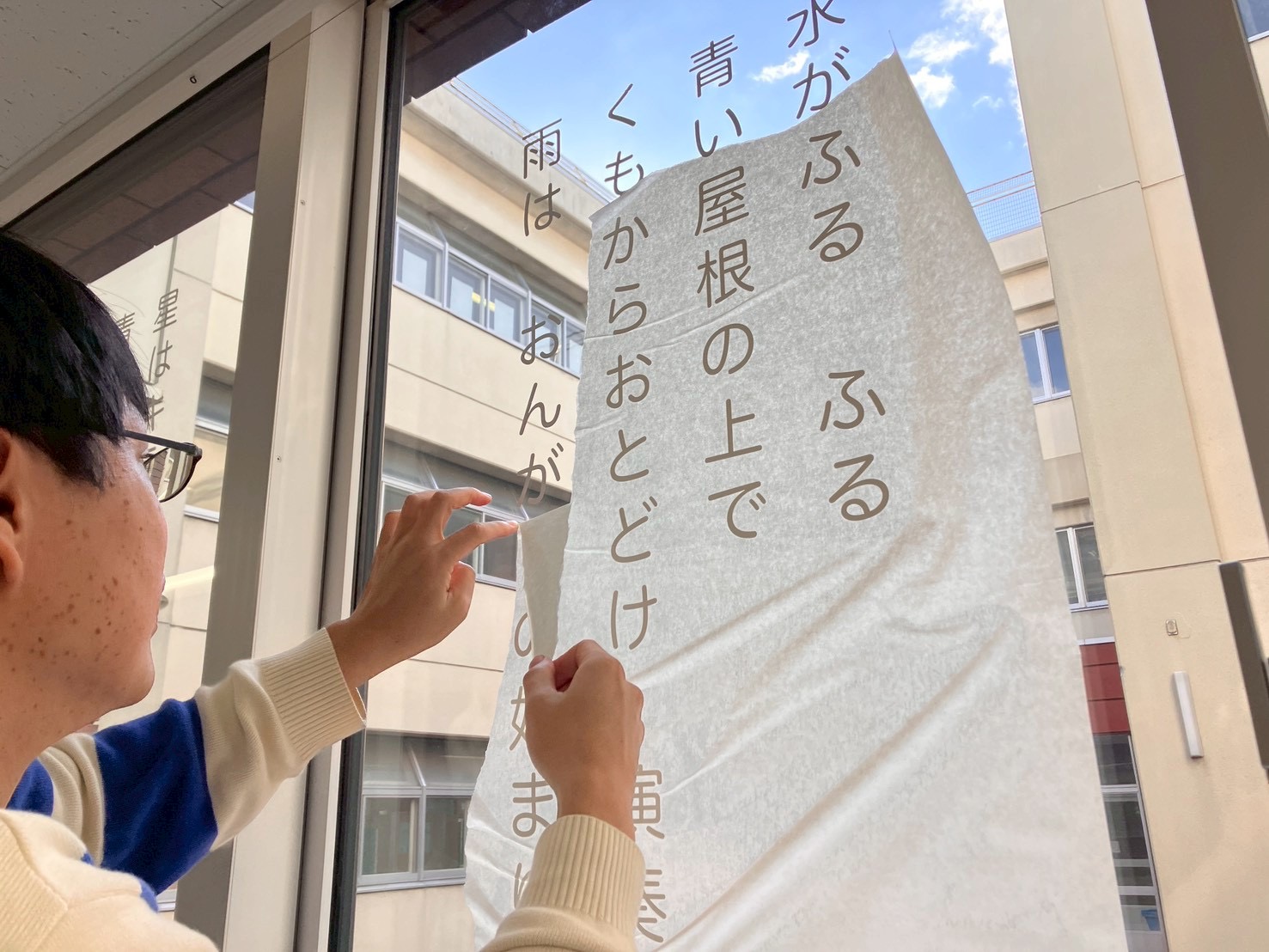 中休み終了後は、みんなからあつめた「すきなことば」でひかりさんが作ってくれた「空」の歌詞を、あっちが作ってきた。みんなで窓に貼っていく。