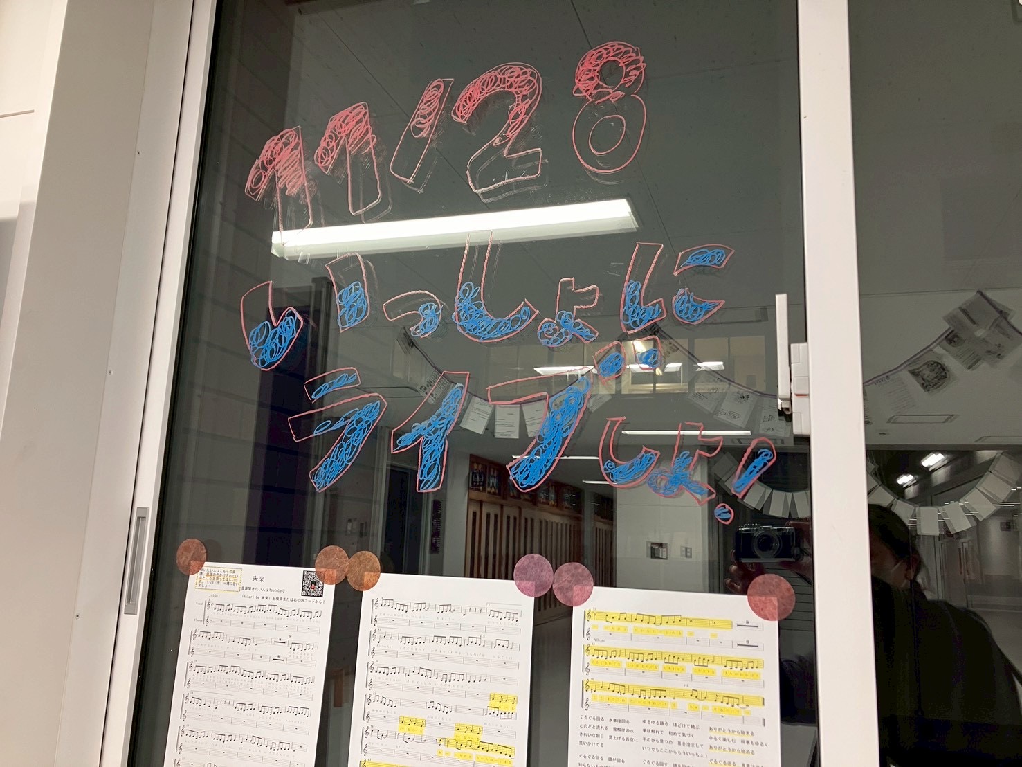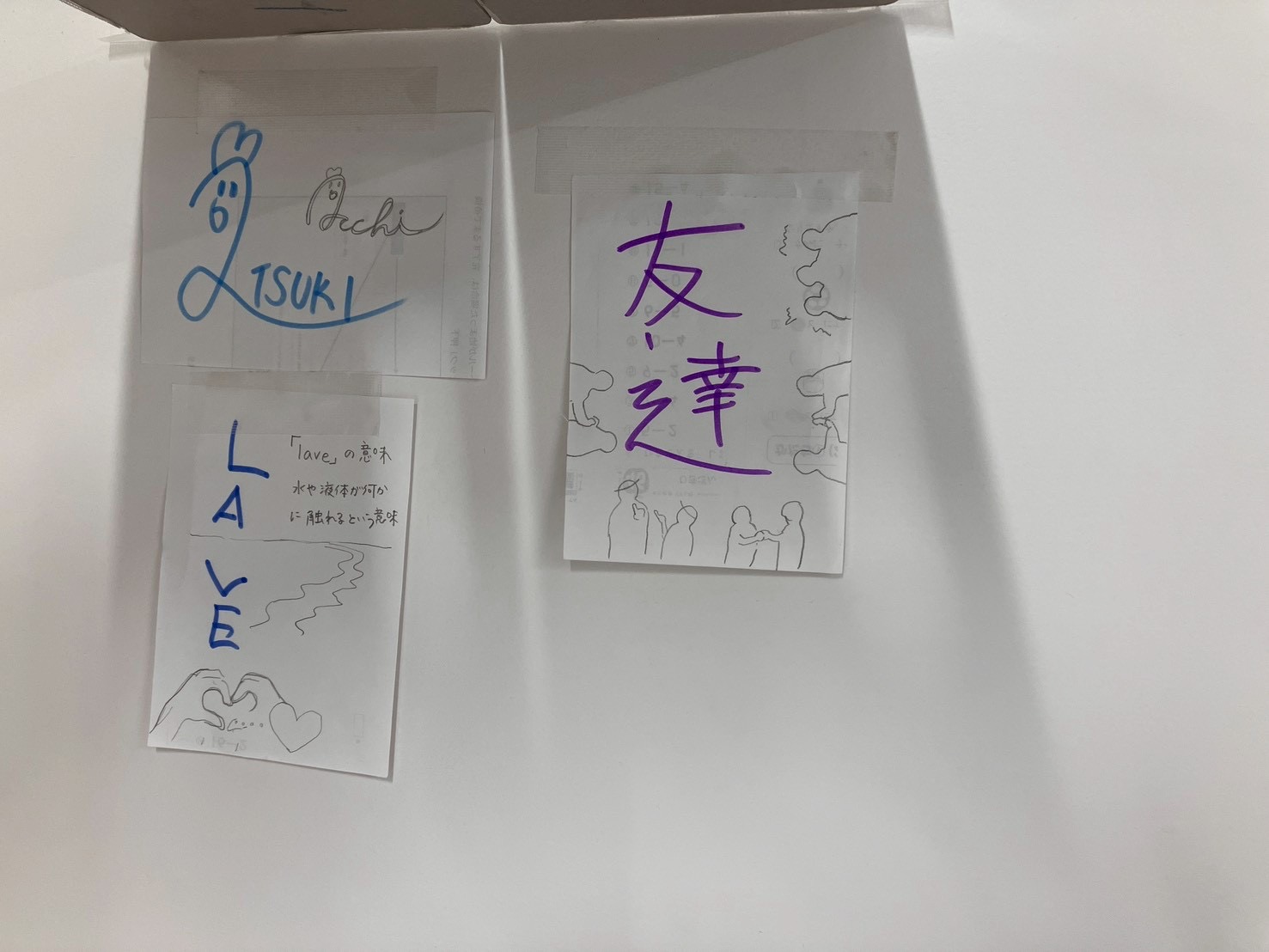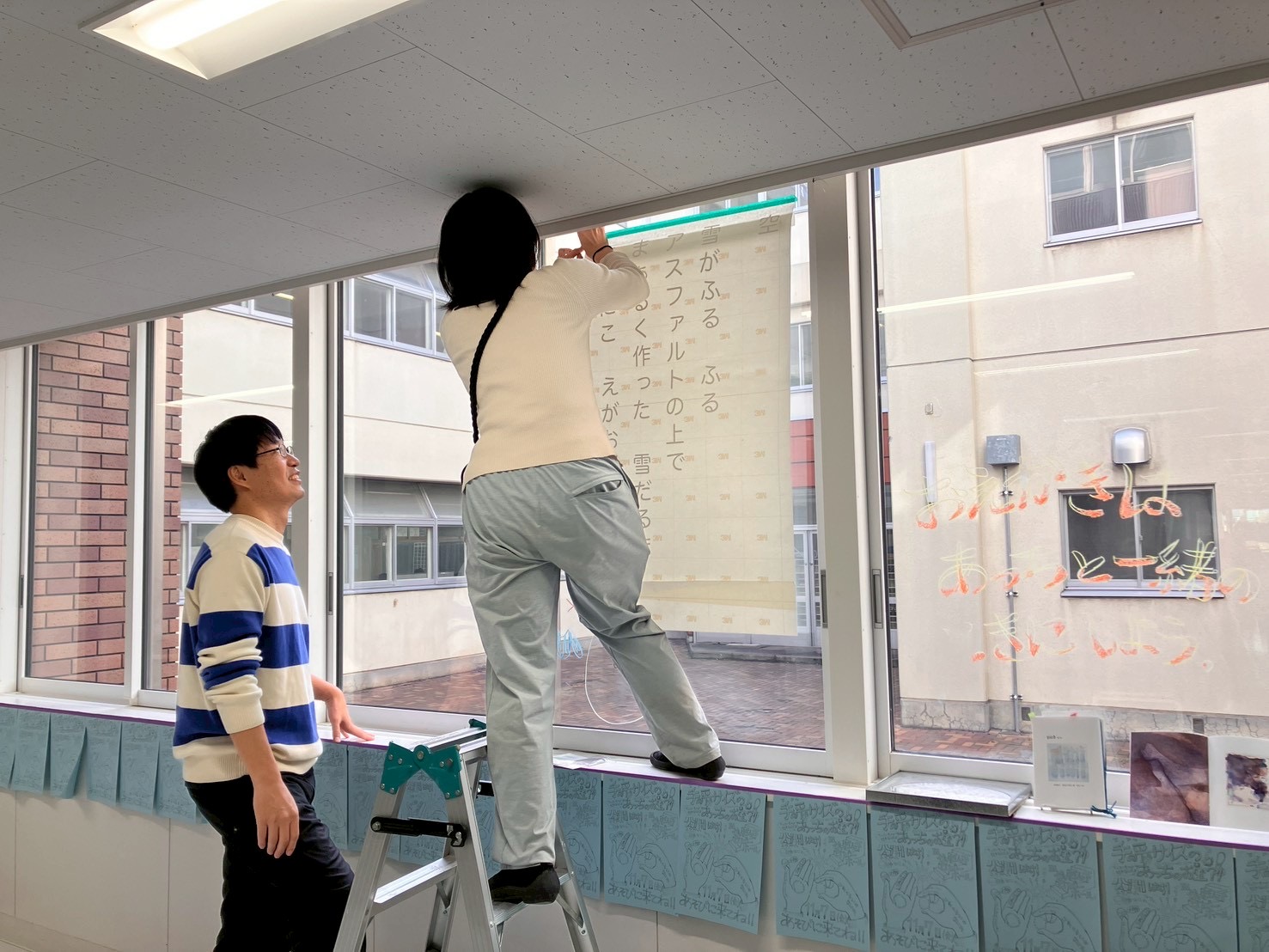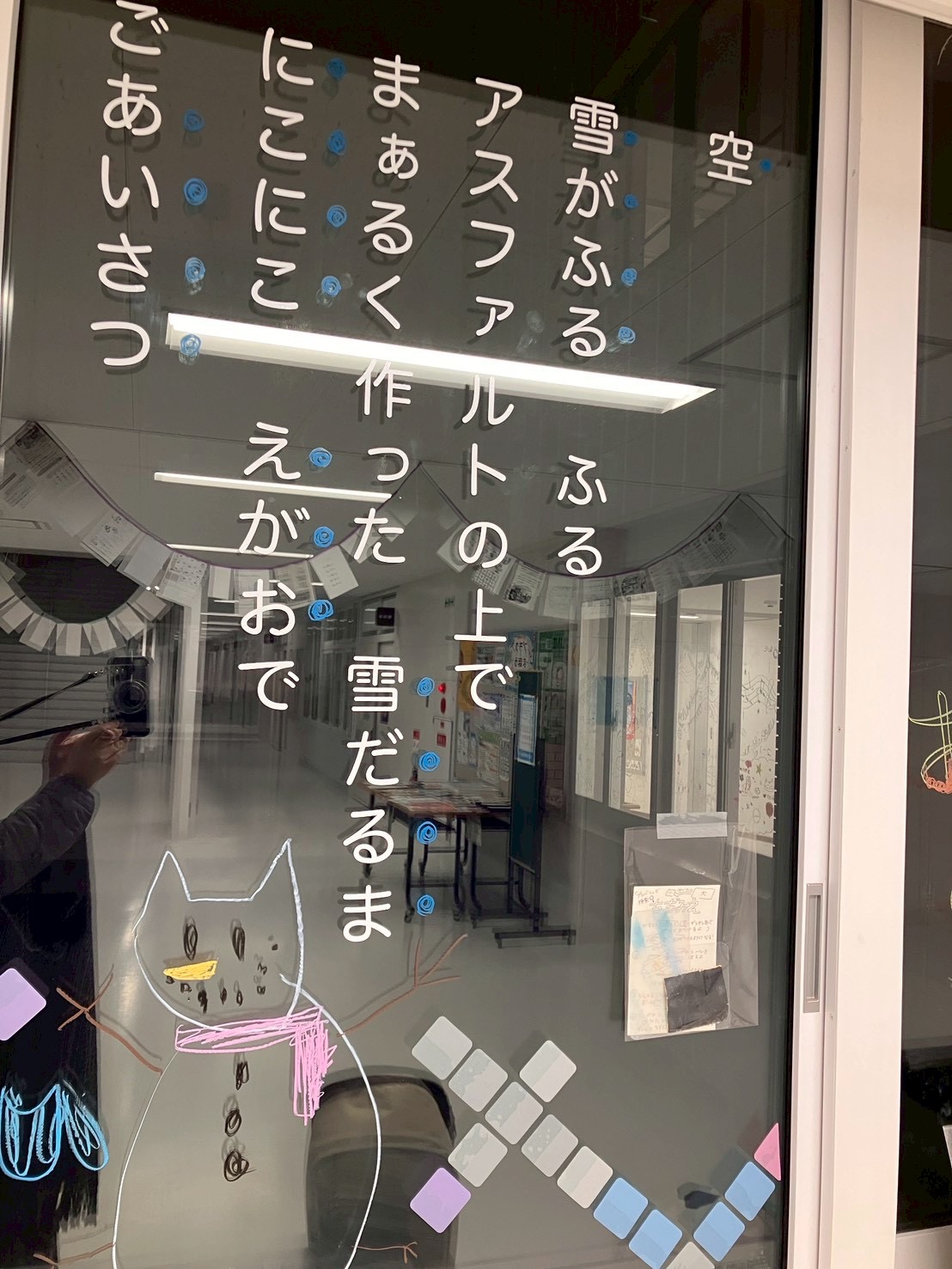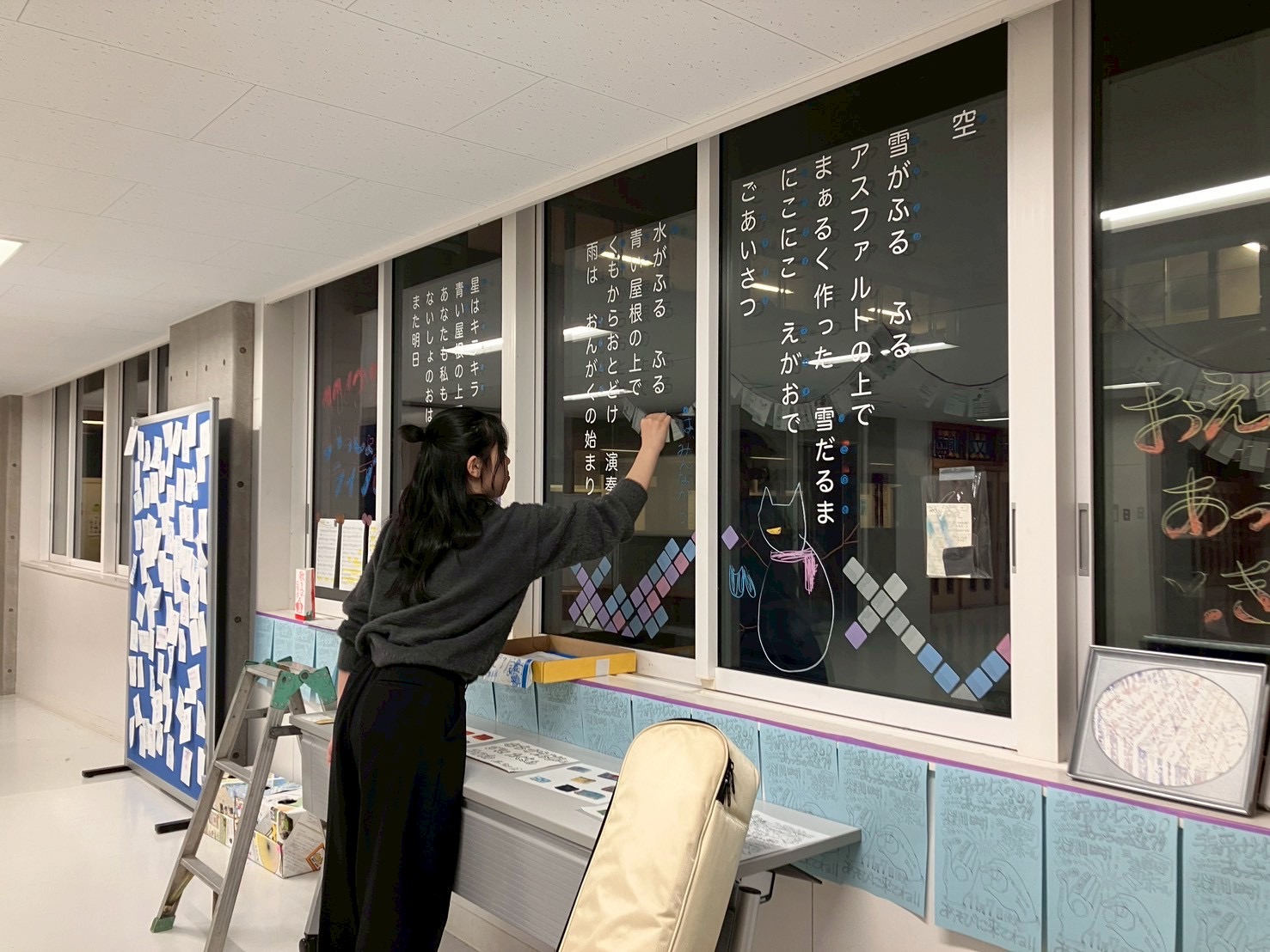 中休み終了後は、みんなからあつめた「すきなことば」でひかりさんが作ってくれた「空」の歌詞を、あっちが作ってきた。みんなで窓に貼っていく。