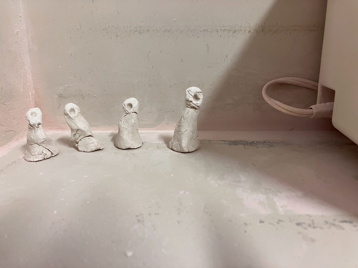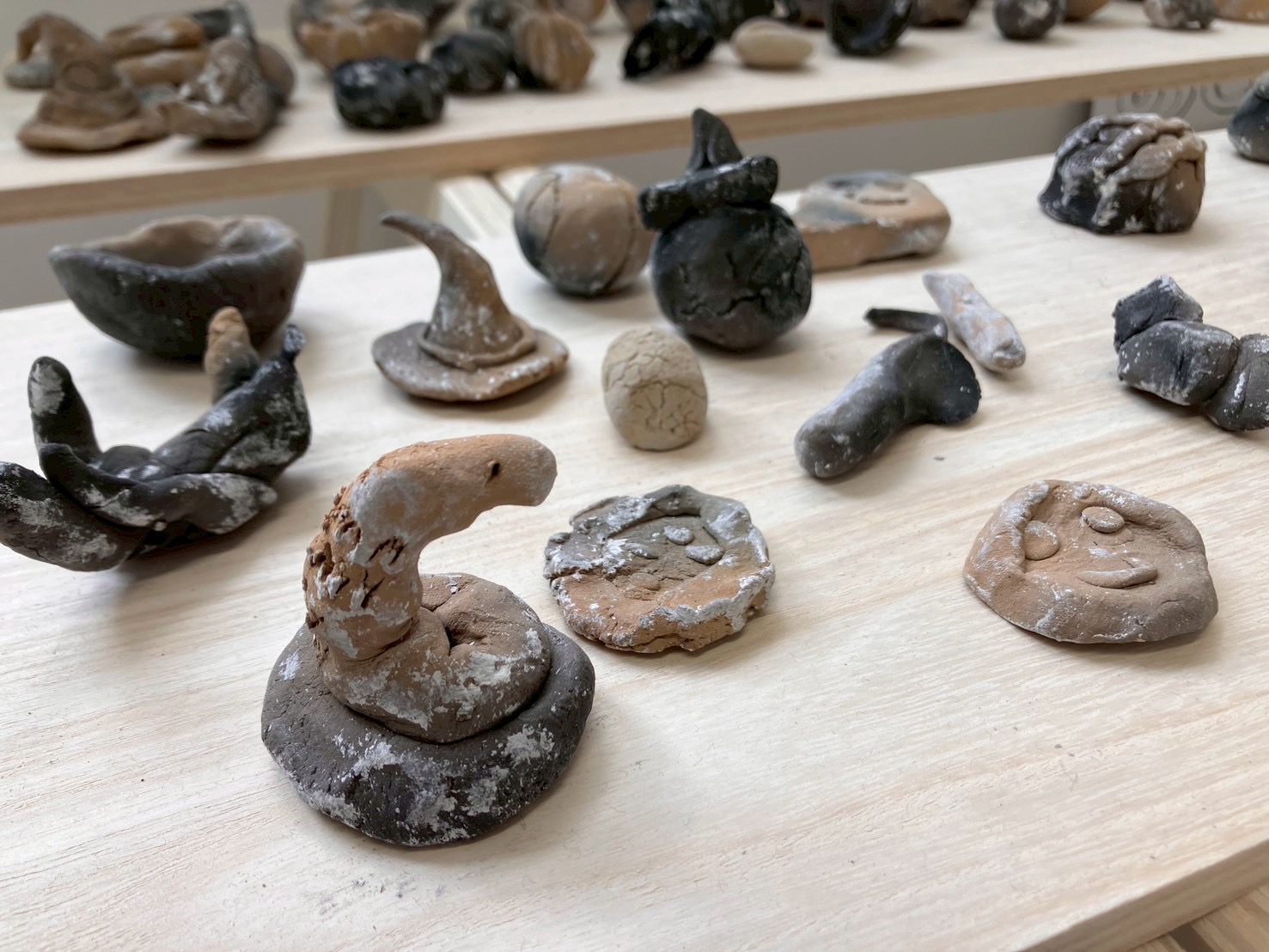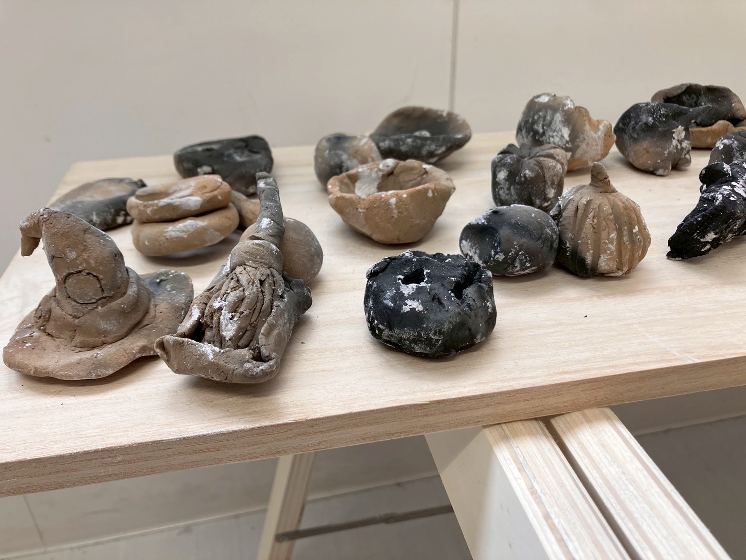 小さな壺に、たまごのようにまるいもの、さんかく、しかく、不思議な形のふにゃっとしたもの。ハロウィンの日に作ったから、魔女の帽子や箒、ドクロにおばけかぼちゃだったりも混じってる。魔女の家来の、蛇や猫も…?お菓子もある。トリックアンドトリート!ハロウィンはとっくに終わっているけれど、お菓子をもらえなかったからいたずらしちゃおうかな?