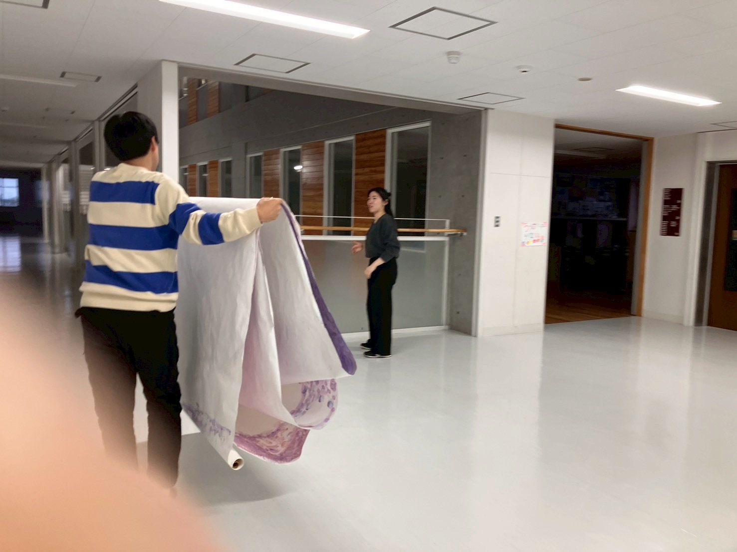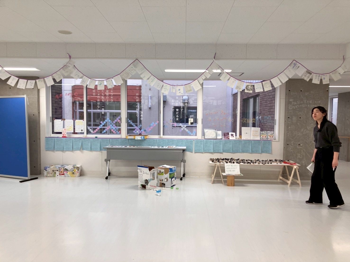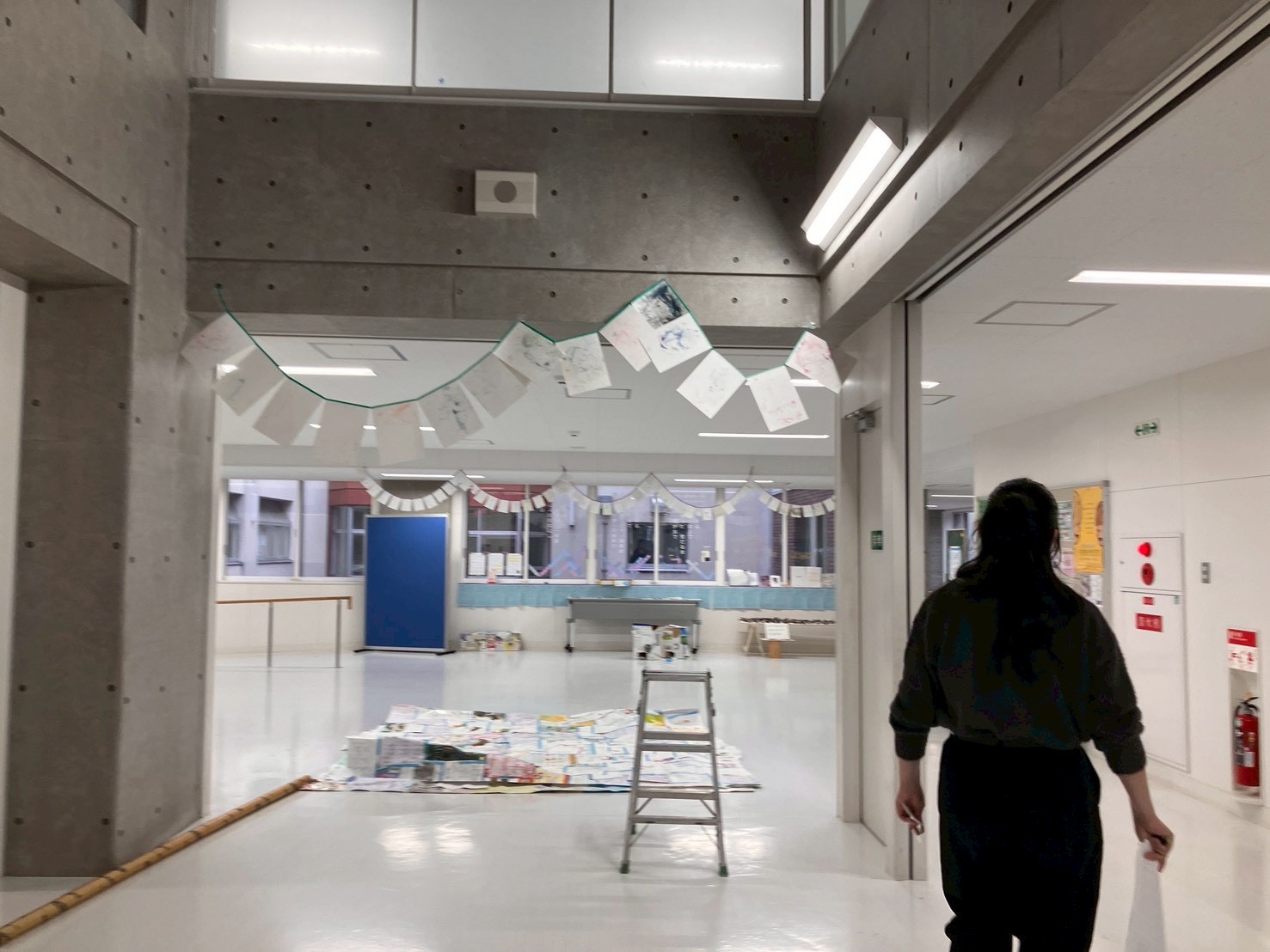 あっちが最後まで悩んでいた、「一反木綿」のような巻紙。最終日だしどこにするか。青いお屋根は、最終回に使うか、それとも? 十メートル近い巻紙をどうにか天井に、見上げる感じにするには?やっぱりどこか座って寝転がって眺めることができる場所?