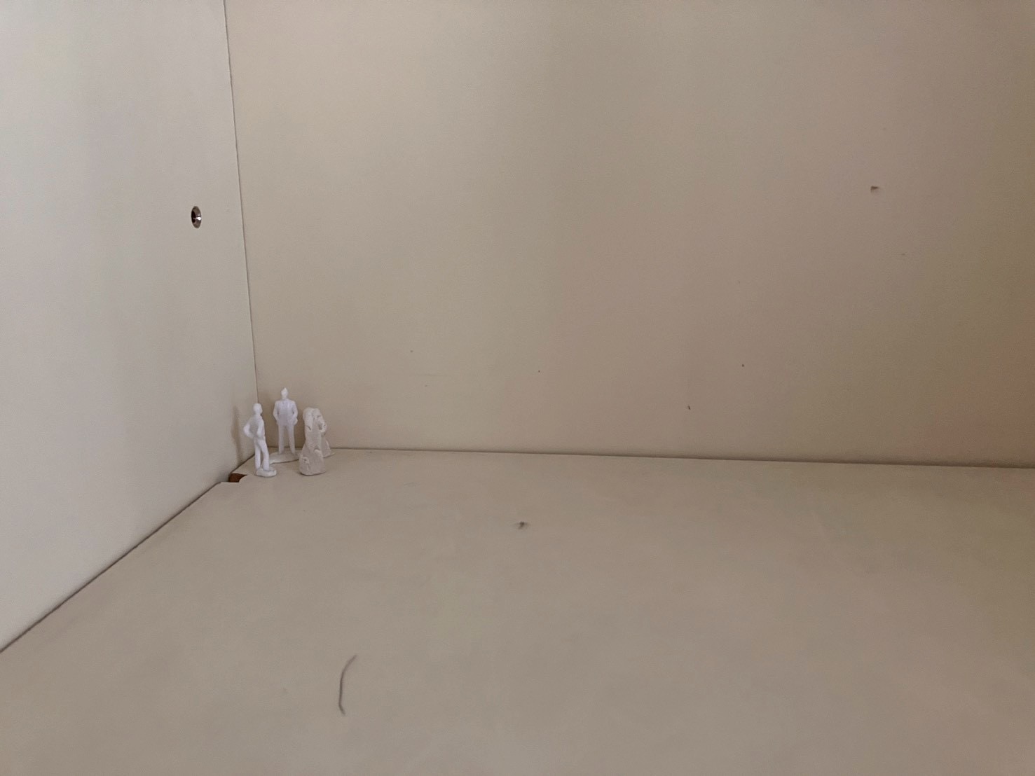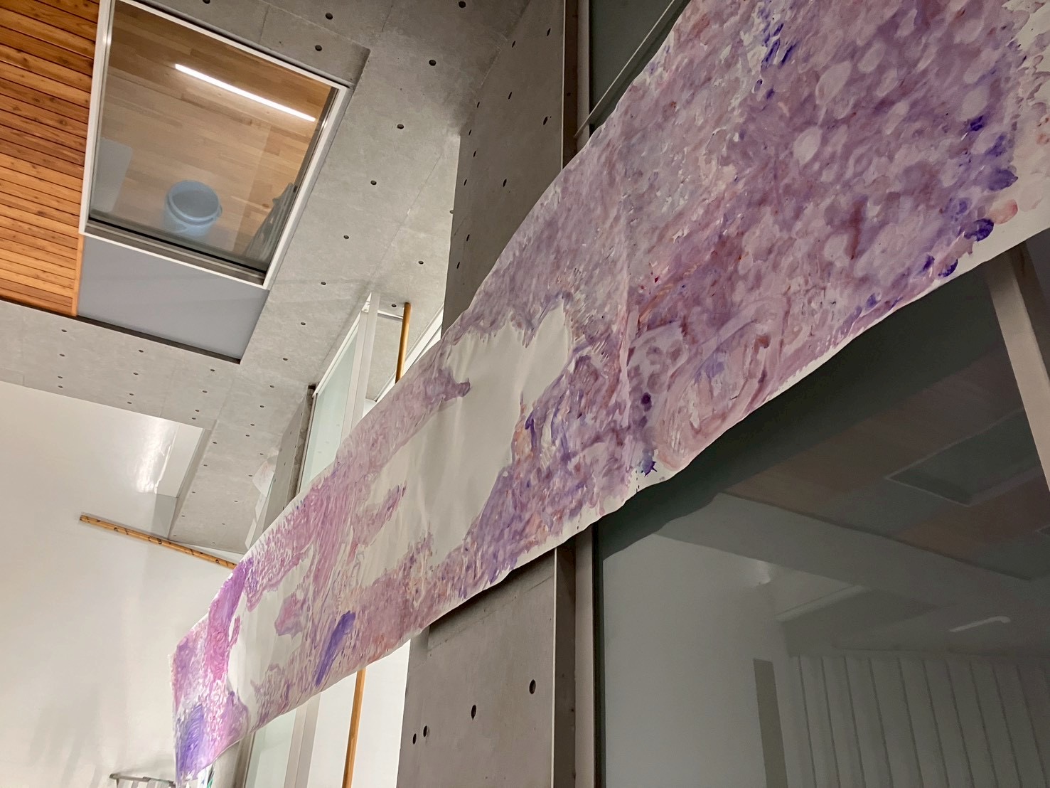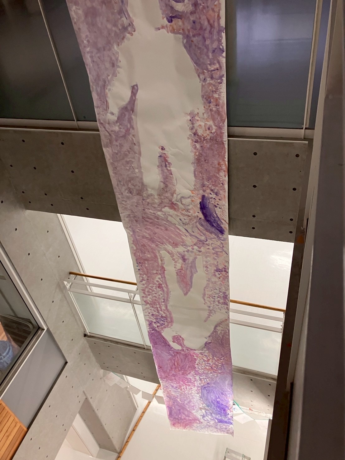 あっちが最後まで悩んでいた、「一反木綿」のような巻紙。最終日だしどこにするか。青いお屋根は、最終回に使うか、それとも? 十メートル近い巻紙をどうにか天井に、見上げる感じにするには?やっぱりどこか座って寝転がって眺めることができる場所?