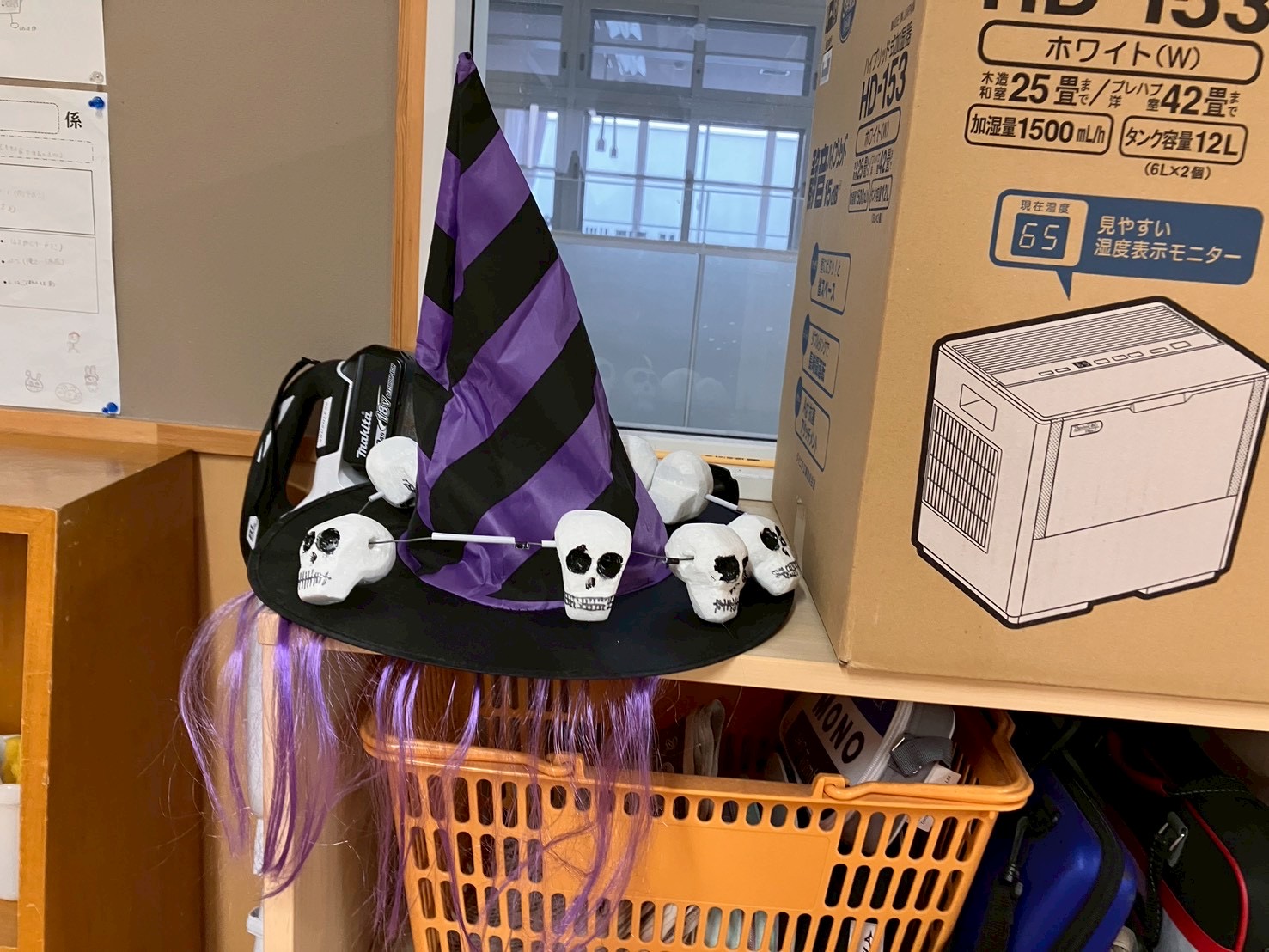 校内で見かけた魔女の帽子。魔女のマジョコサンもどこかのクラスで授業を受けている?