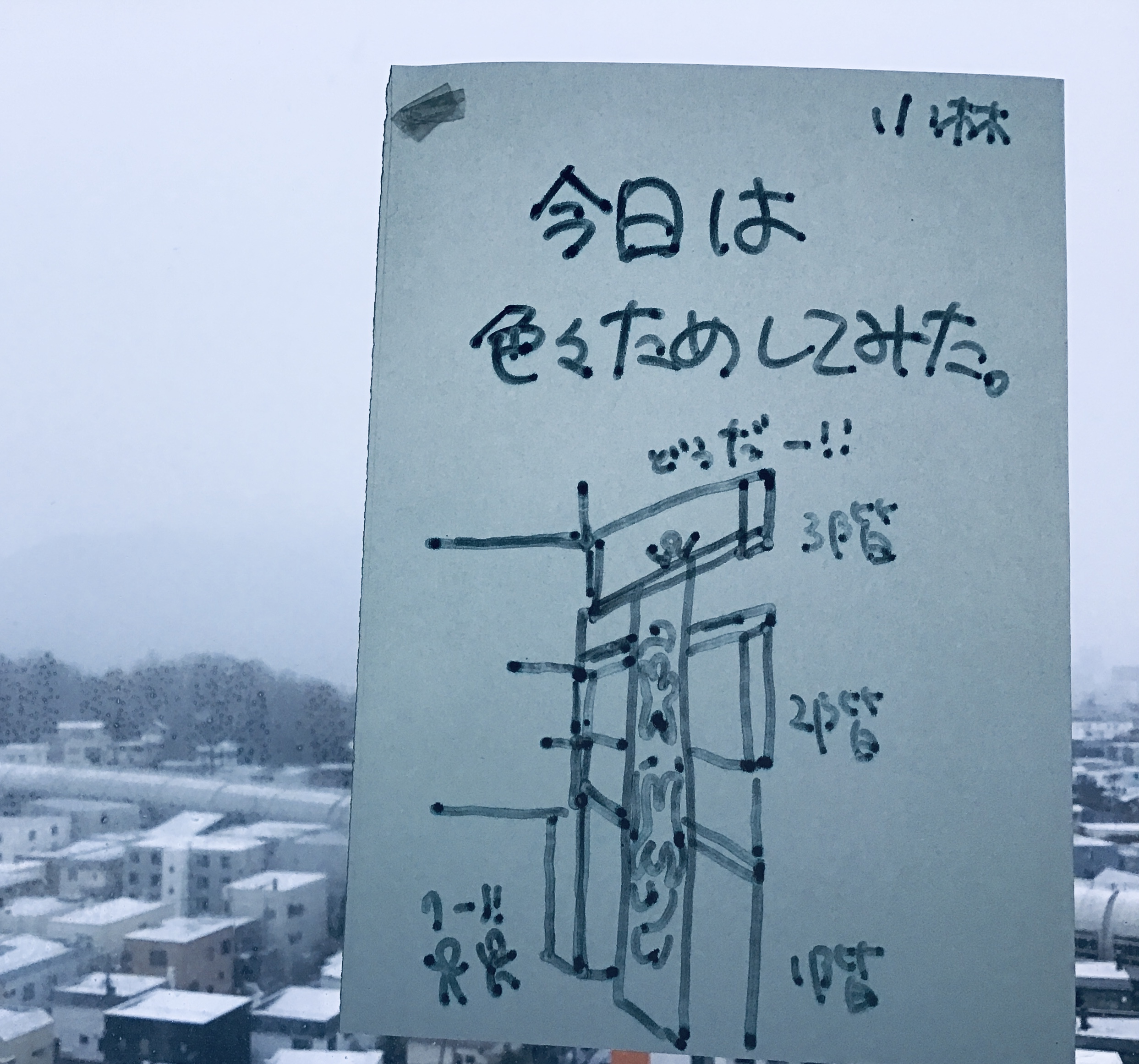 ガチャの仕掛けを終えて、あっち、もう一つの展示会場に一足先に下校します。明日から始まる喫茶画廊での展示の設営に。搬入、展示しっかりね!