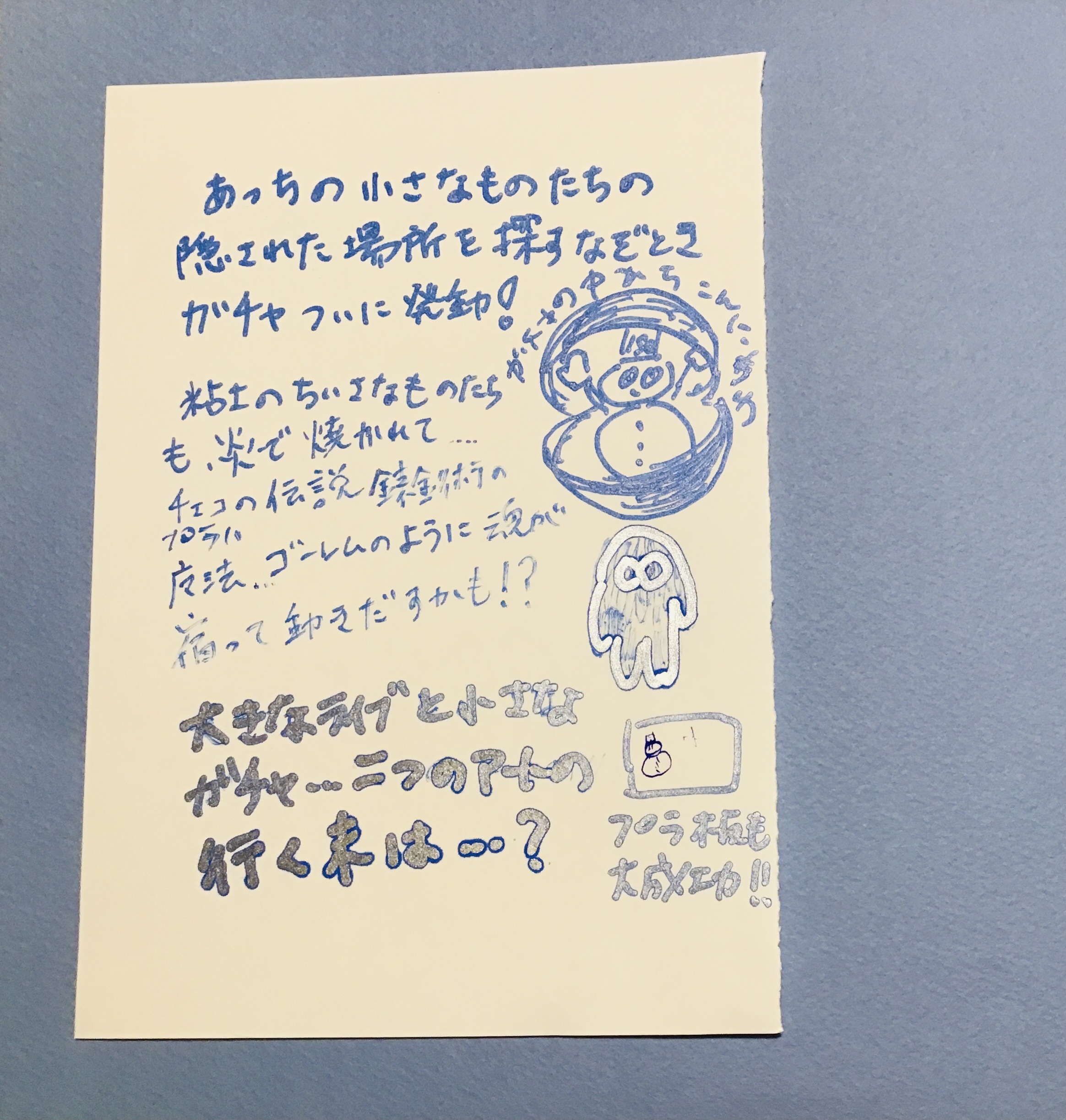 遠藤先生に、小さなもの居場所とガチャの指示書のことをお話する。